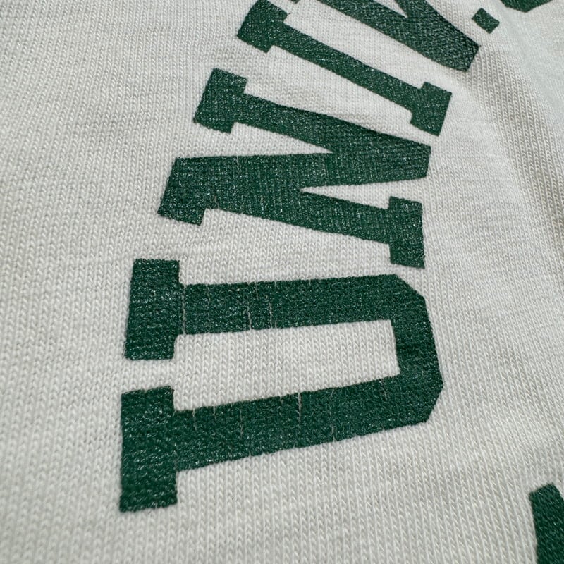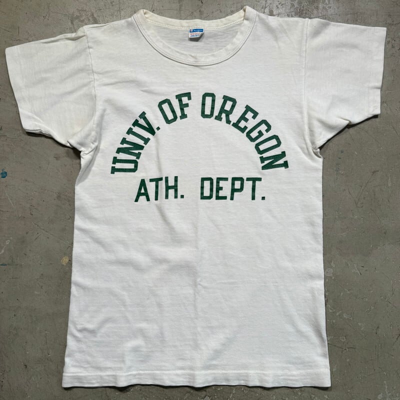 70年頃のChampionカレッジTシャツです。バータグが付くこちらは、1876年オレゴン州ユージンにて設立されたオレゴン大学のATHLETIC DEPT(運動部)のプリントが入る1着です。大学カラーのグリーンでペンキプリント施されています。オレゴン大学といえばNIKEの創設者もかつて在籍していた事でも知られ陸上競技の聖地と呼ばれるHayward Fieldという競技場を有しています。こちらのアイテムはプリントに若干クラックが入り、袖に小さな薄汚れや縫い目のステッチを補強した箇所がございますが非常にコンディションが良いと言える個体です。MEDIUM表記ですが小さめな作りです。NIKEがお好きな方にも刺さる1着だと思いますので、是非足元はヴィンテージNIKEで合わせてみてはいかがでしょうか。