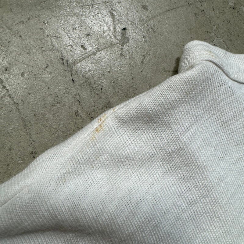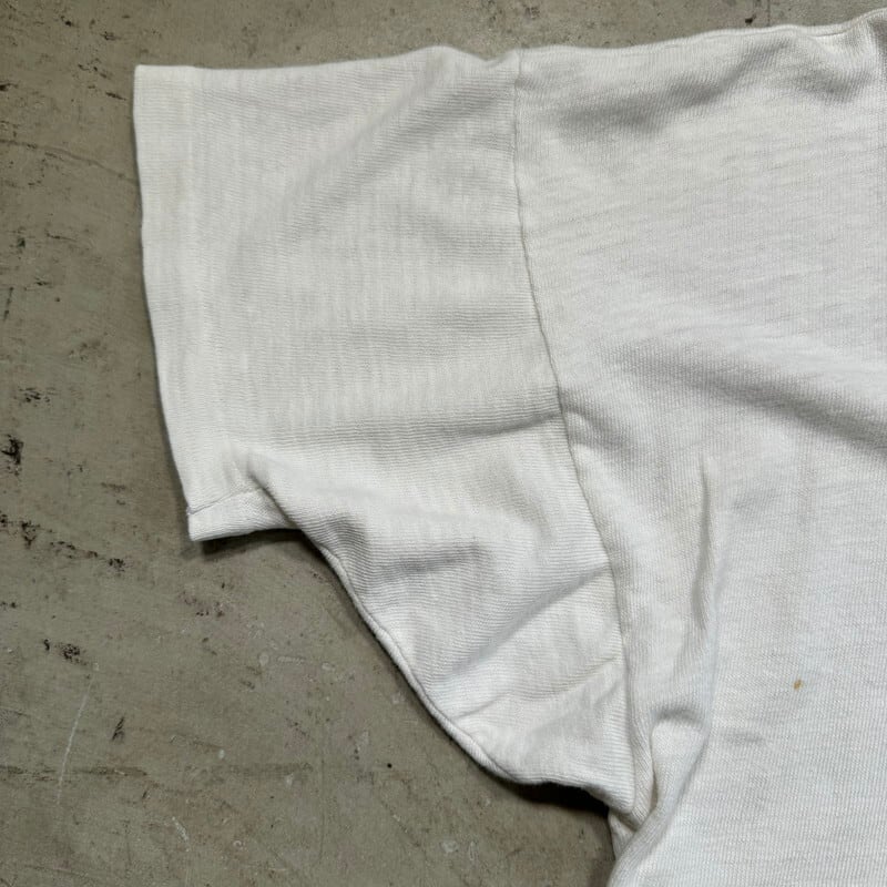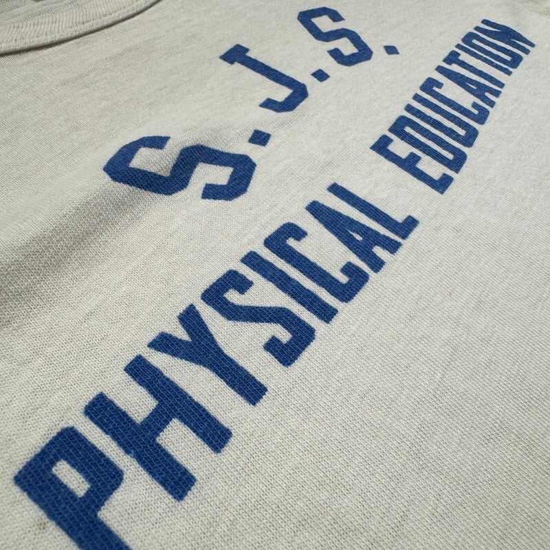 70年代頃のChampionカレッジTシャツです、バータグが付くこちらはフロントにS.J.S.PHYSICAL EDUCATIONと染み込みでプリントされた1着です。恐らくジュニアスクールの体育で使用されていた物だと思われます。コットン100%dで生地は柔らかく肌さわりの良い1着です。フロントに小さなシミがいくつかあり、裾に小さなピンホールがございます。その他は比較的コンディションの良い個体です。XL表記でアスレチック系のTシャツとしてはゆとりのあるサイズ感だと思います。カレッジプリントの中でもやはり染み込みプリントはポイントが高くサイズも良いのでお好きな方は是非お見逃しなく。