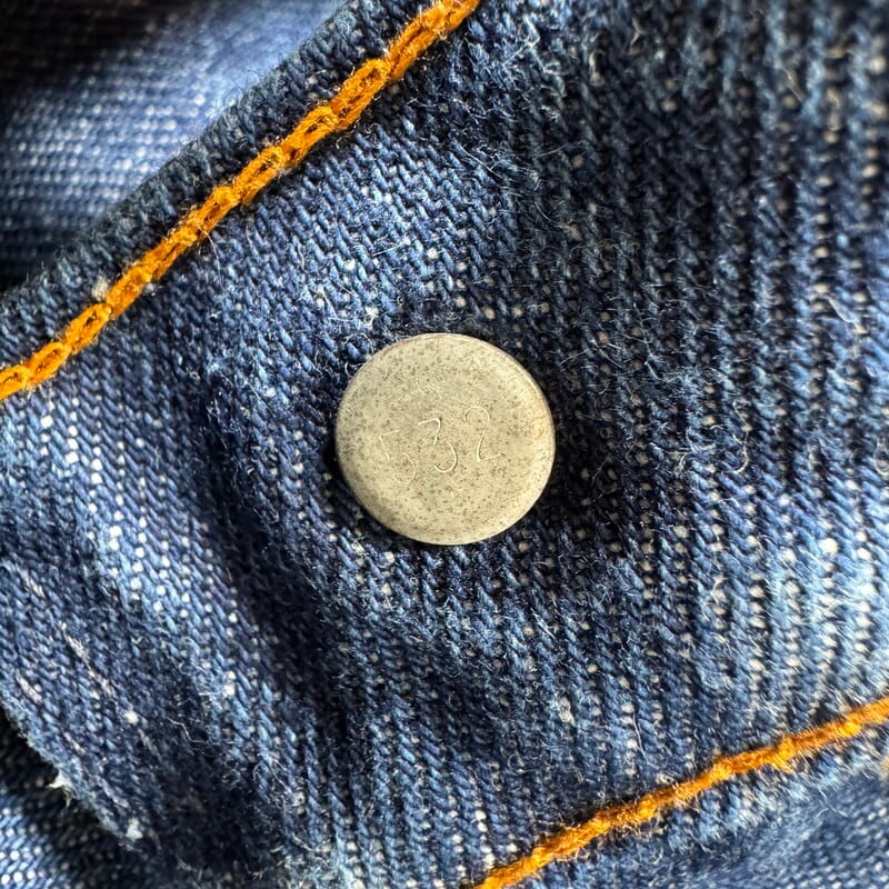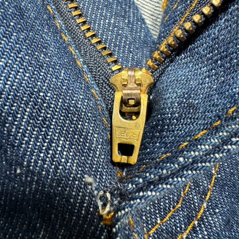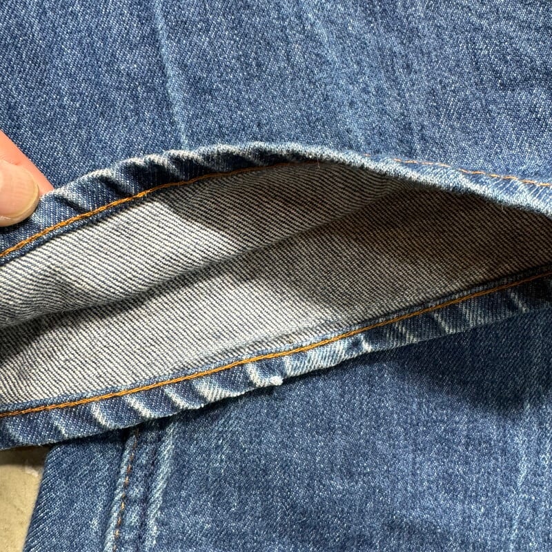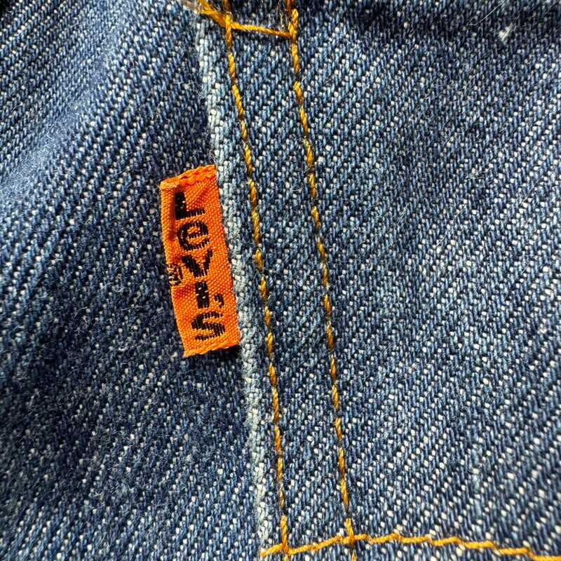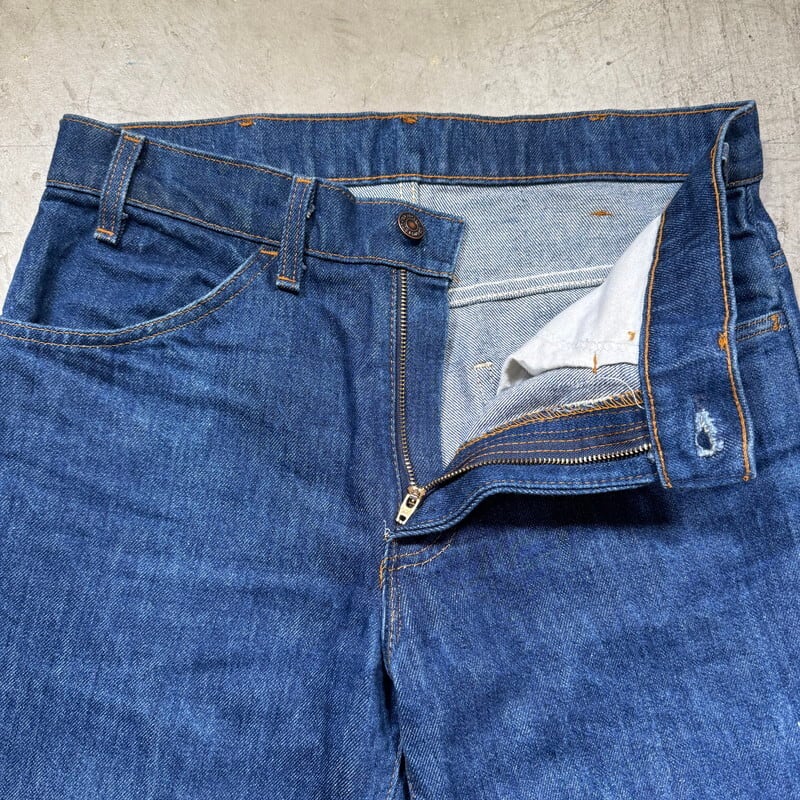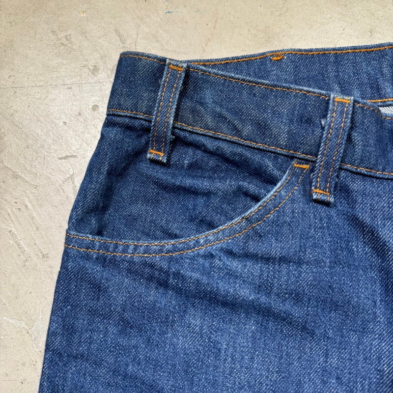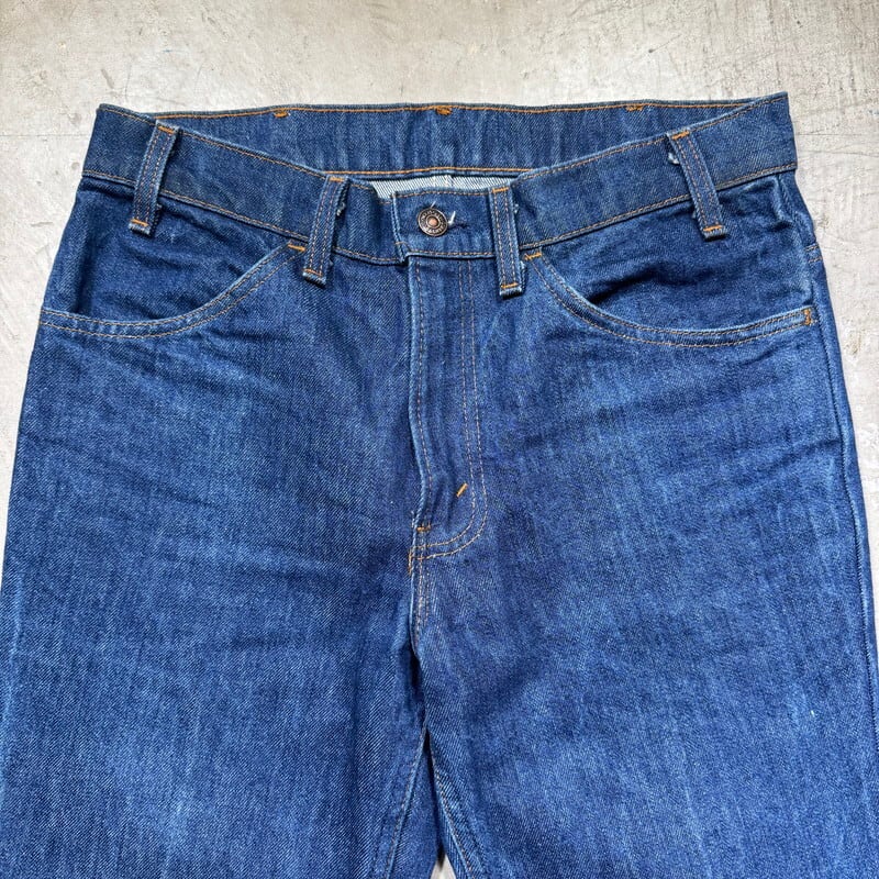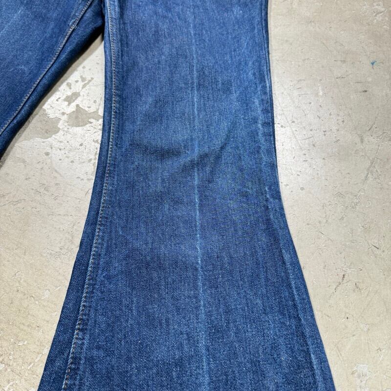80年代のLevi's 646-0217ベルボトムデニムです。トップボタン裏刻印532、Levi's刻印ジッパー、オレンジタブ、スモールe、82年製造。リーバイスのフレアデニムの中では一番広がりがあるビッグベルと呼ばれるモデルです。色残りは7割程で比較的濃いめな1本です。センターにプレス跡がありウエスト部分に薄汚れ(ベルト汚れ)があります。バックポケットに一部ステッチ飛びがあり、ポケット内側に小さなダメージが見られます。裾に若干の擦れはございますが、コンディションの良い個体です。ウエストは表記通りW32インチで需要の高いサイズでは無いでしょうか。恐らくレングスはオリジナルだと思われ、色もまだまだ濃いめですのでこれからのエイジングも楽しめます。リンガーTと合わせて70'sスタイルを楽しんでみてはいかがでしょうか。