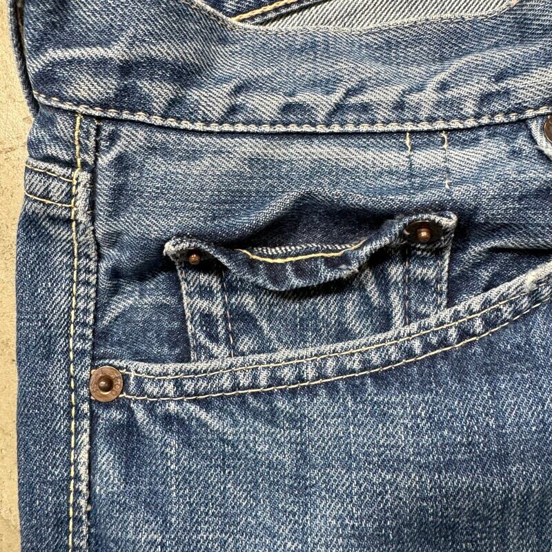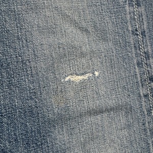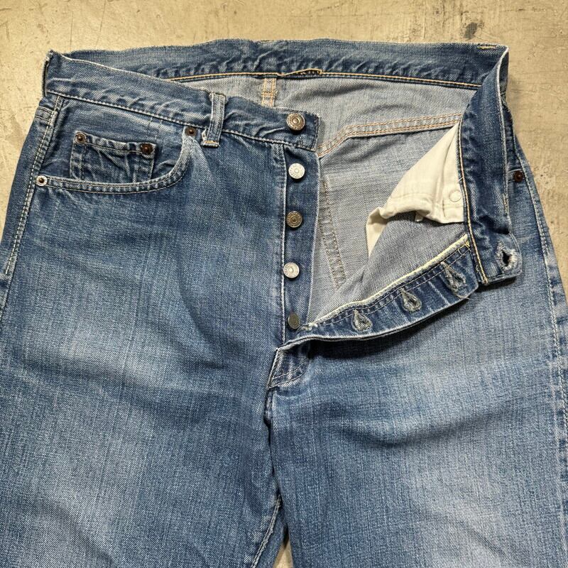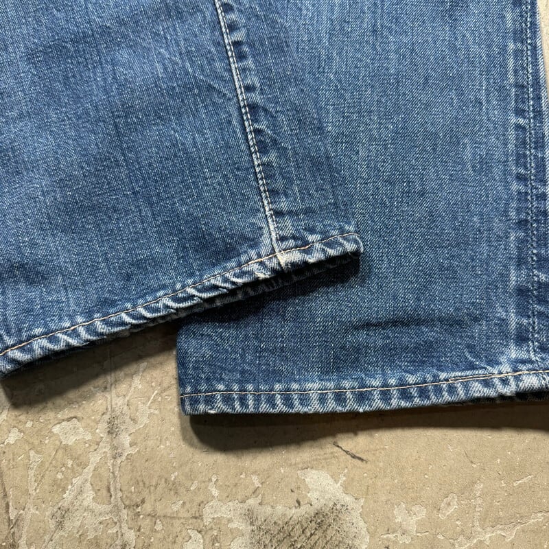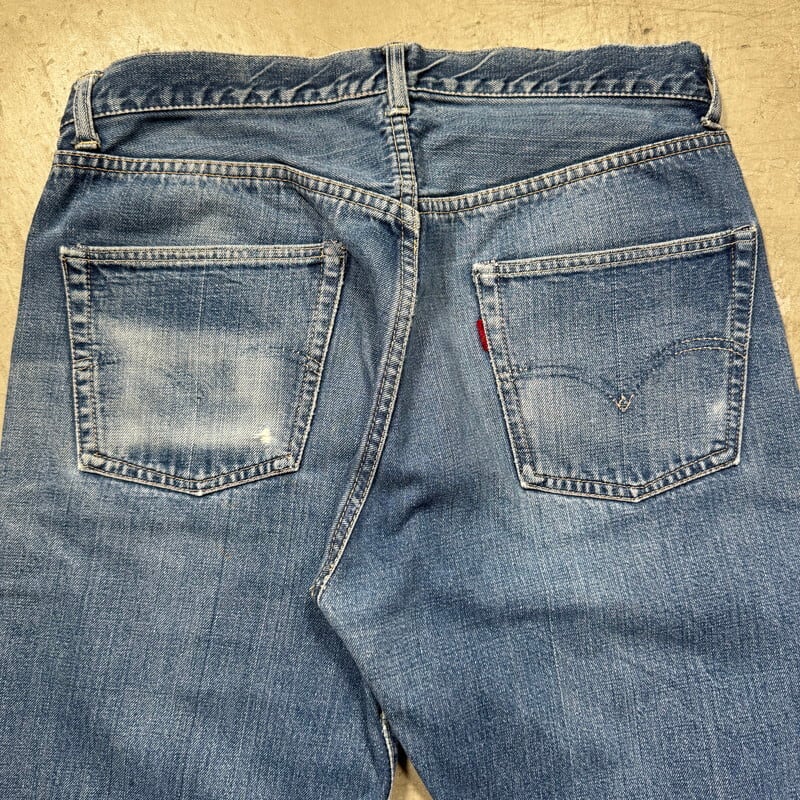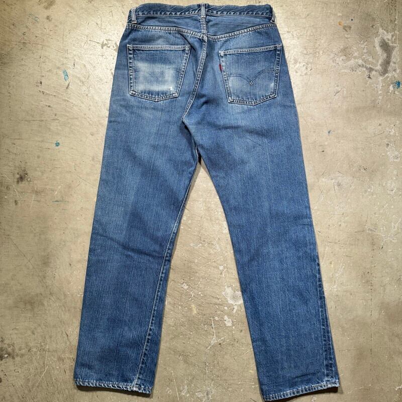 60年代のLEVI'S 501デニムです。フロントVステッチ、刻印8、足長R、ウォッチポケット裏チェーン、アウトシーム裏両面シングル、赤タブBig E、不均等V。色残りは3割程に褪色しておりアウトシームのセルヴィッジ跡などアタリのしっかりと出た1本です。股の付け根と左膝にリペアがあり、小股はステッチと共に閂も一緒に縫い直しされていると思われます。バックポケン位小さなダメージがございます。レングスは恐らく当時のオリジナルと思われます。リペアはありますが生地はしっかりとしています。ウエストは実寸でW32~33インチ程で良いサイズ感です。夏らしい薄めな色味なのでヴィンテージアロハに合わせてみてはいかがでしょうか。