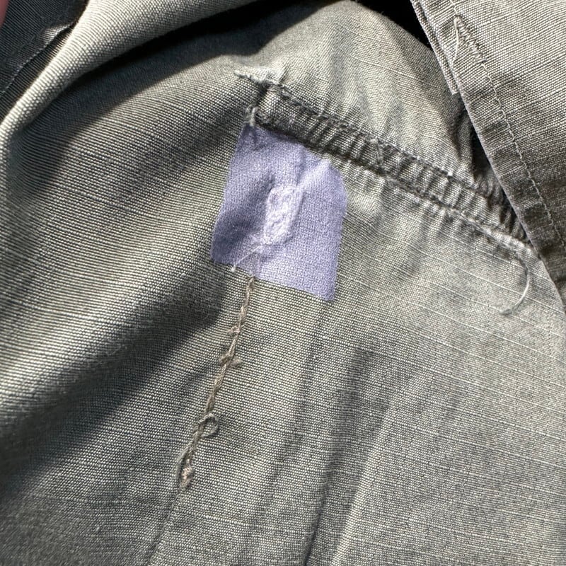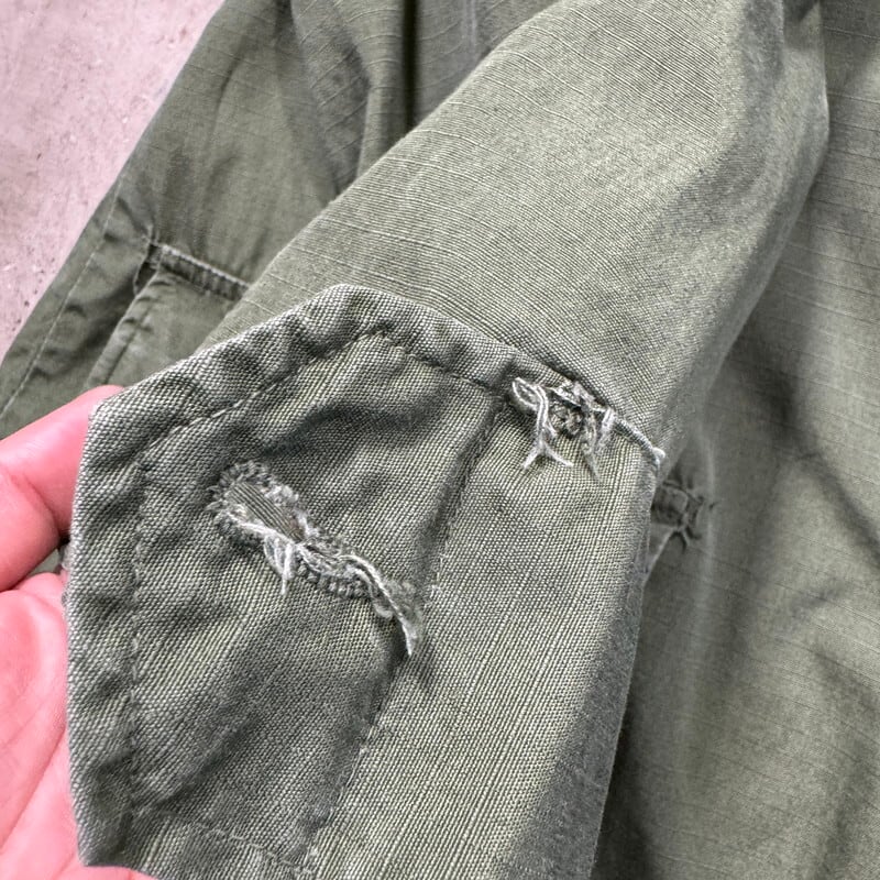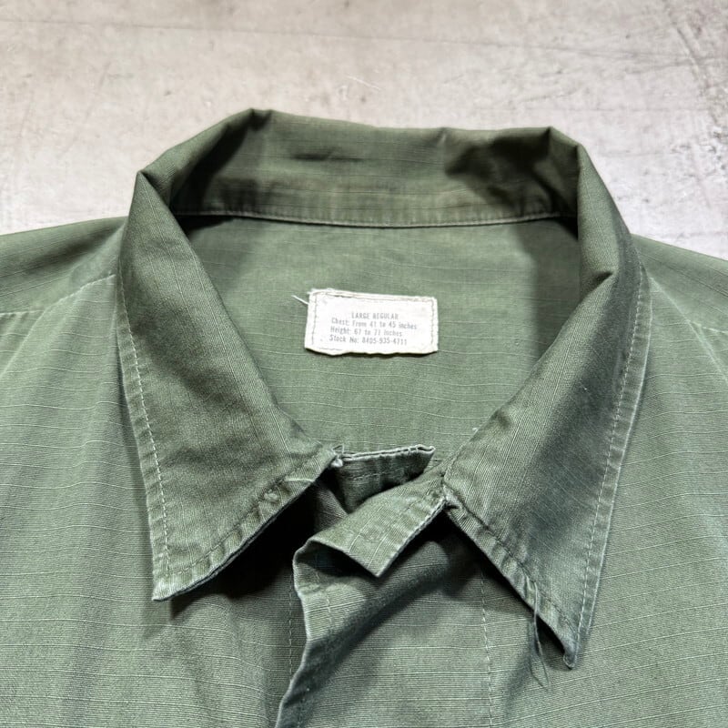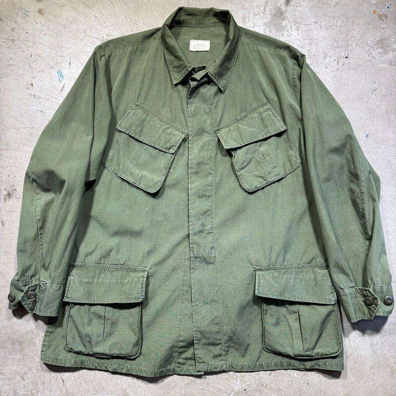 60年代のU.S.ARMYジャングルファティーグジャケットです。リップストップ地の最終である袖先のV字ガゼットが簡略化された5thモデルです。コントラクトはDSA 100-69-C-1174、コントラクターはHENDERSON MFG CO INCです。襟元に僅かに薄汚れがあり、右下部のポケット縁にハンドリペアでの縫い直しがございます。その他細かな擦れ等はございますが、リペア部分以外のコンディションは良好です。LARGE REGULAR表記ですので程よくゆったりと羽織っていただけるかと思います。ジャングルファティーグジャケットは薄手なので季節の変わり目などに使い易いのでお勧めです。お持ちではない方は是非この機会にいかがでしょうか。
