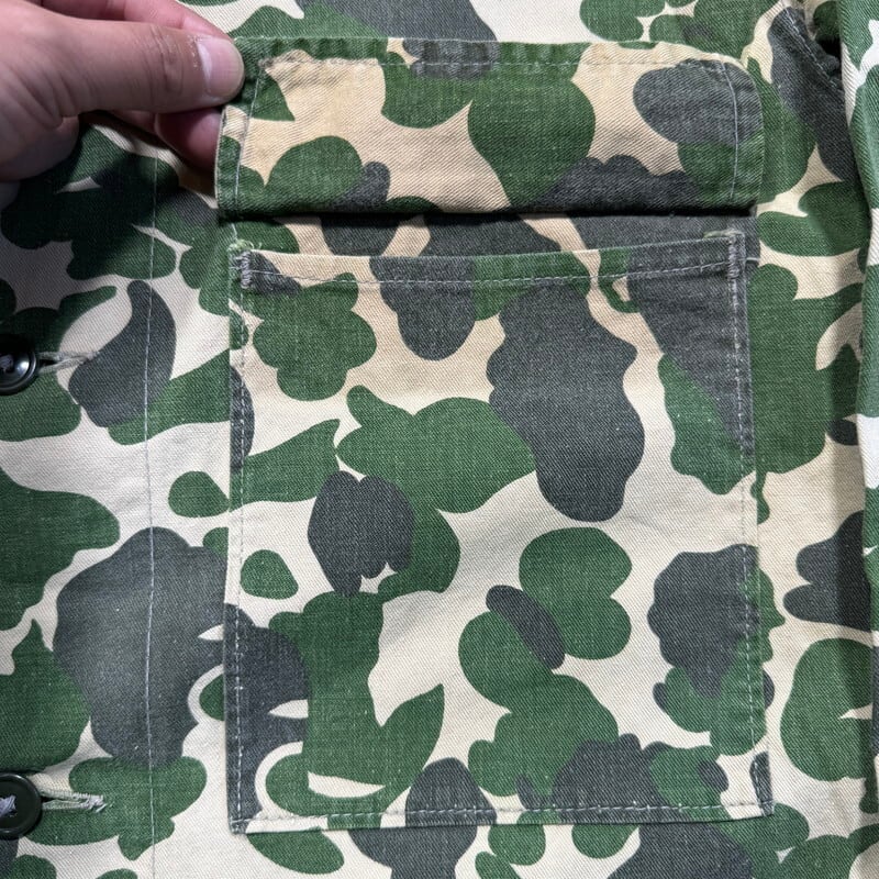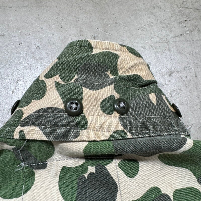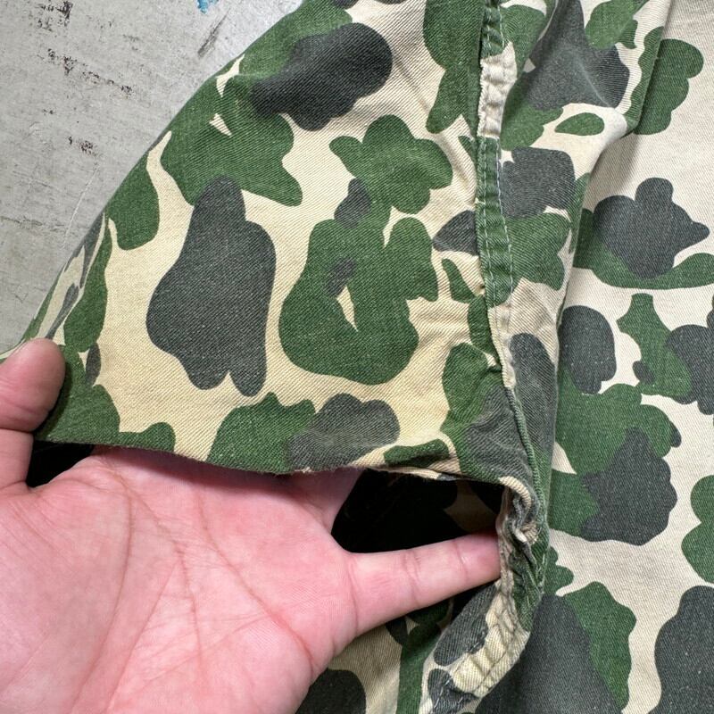 60年代頃のBullseye Billハンティングカモジャケットです。Bullseye Billはハンティングウェアなどを製造するPhoenix Manufacturing Companyが展開していたブランドです。ご紹介するこちらは、ハンティングウェアではお馴染みのダックハンターカモがプリントされたジャケットです。フロントは4つボタン、フラップ付きのポケットが2つ備わっています。この手のジャケットではカバーオールのように下部にポケットが付く物が多いですが、こちらは胸と腹部の中間地点の中途半端な場所に取り付けられています。フラップにはボタンは付きません。襟には別でフードが取り付けられる仕様のようですがフードはございません。首タグの両サイドにほつれがあります。全体的な色褪せがありますので肩や袖等に色の濃淡が見られます(元々ベースは濃いめのベージュ)。擦れ等はみられますが生地にダメージは特にございません。サイズ表記はありませんが、M~L相当かと思います。身幅にゆとりがあり、着丈が短いボックスシルエットです。筒袖ですのでロールアップもしやすくこれからの季節でも使い易い1着です。