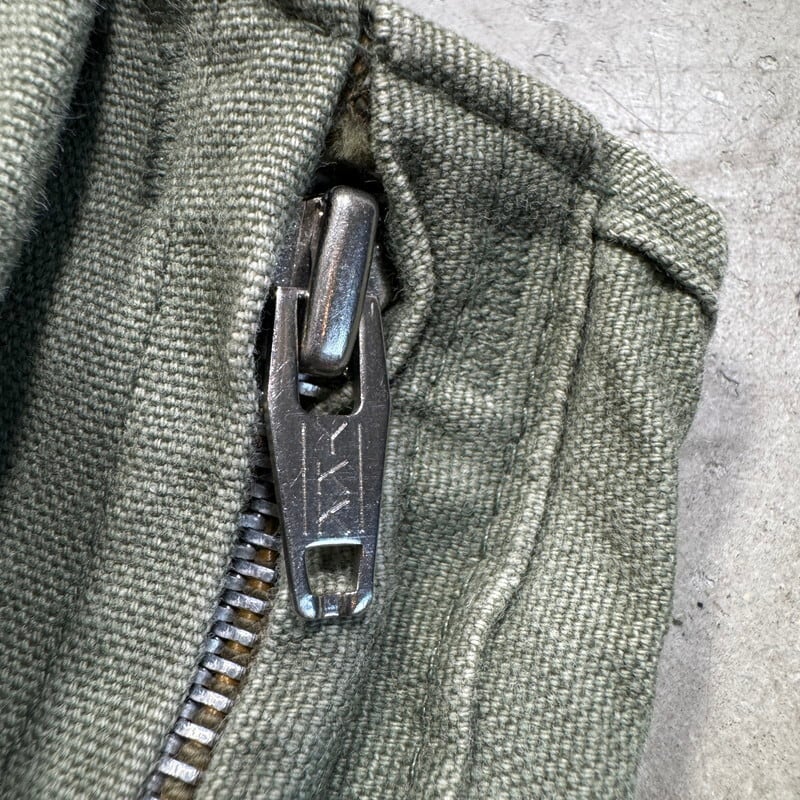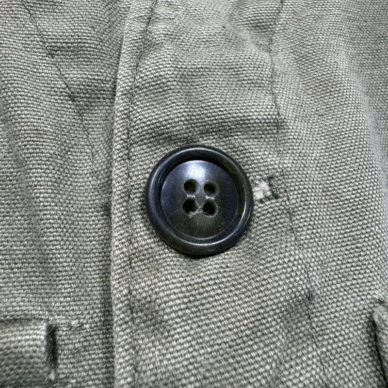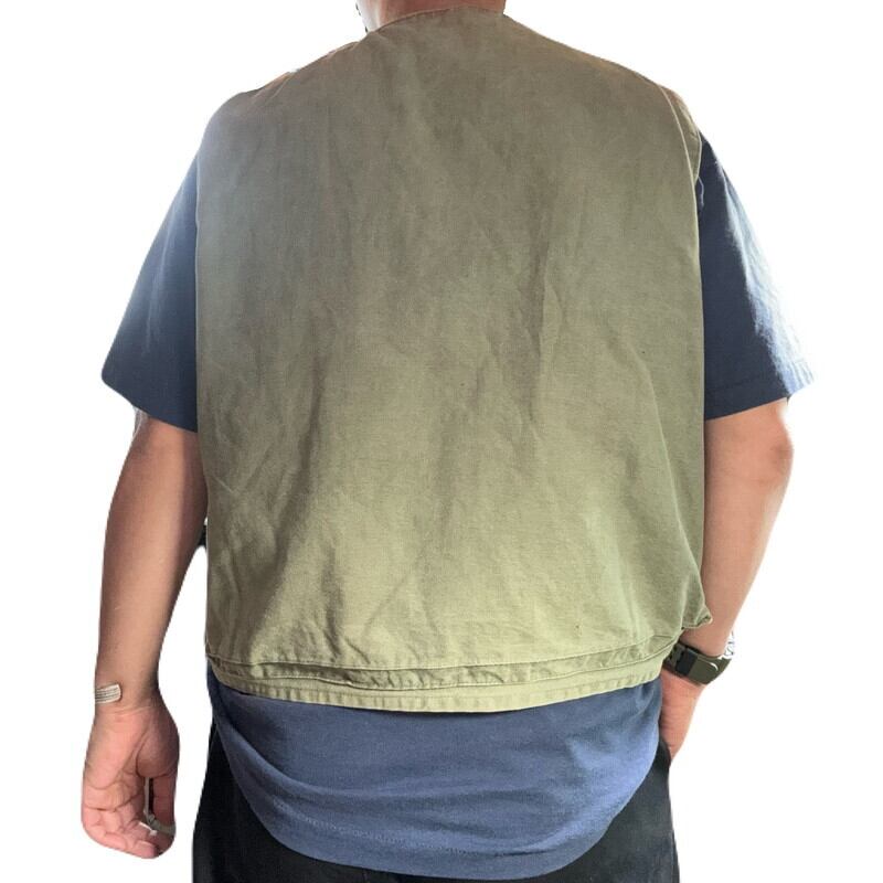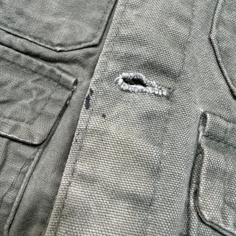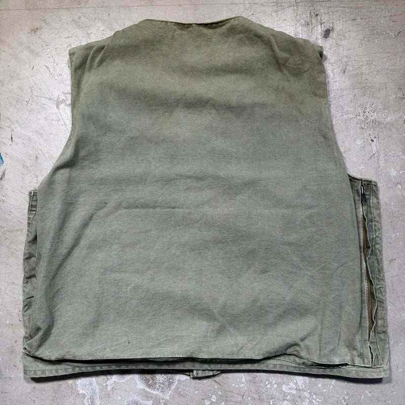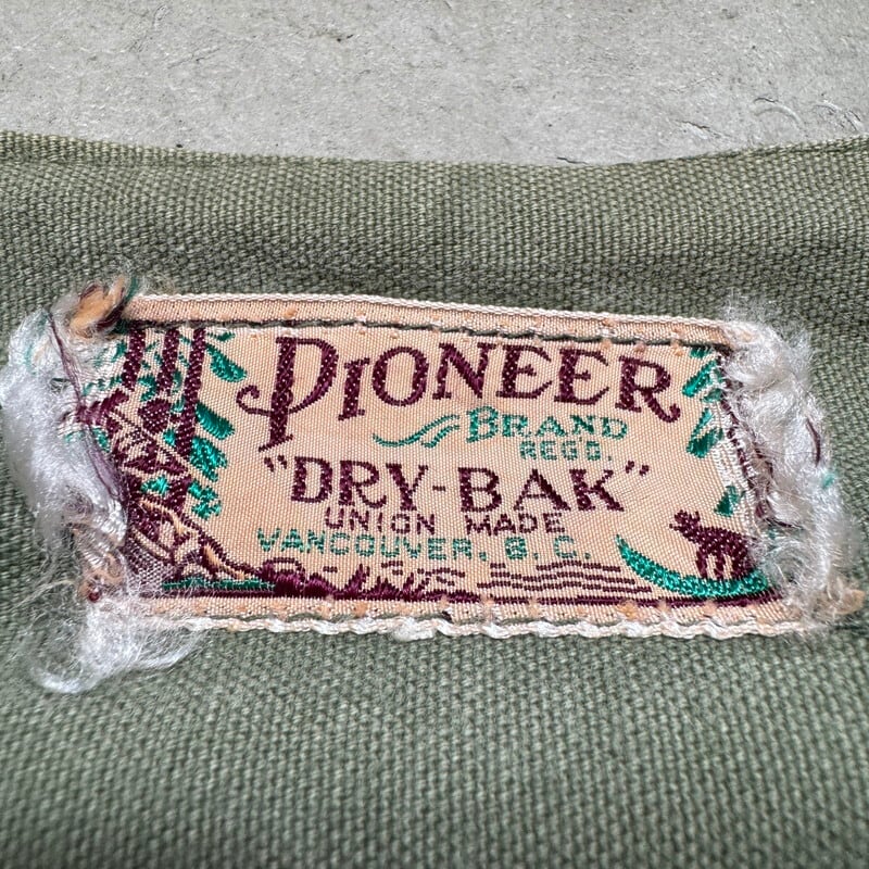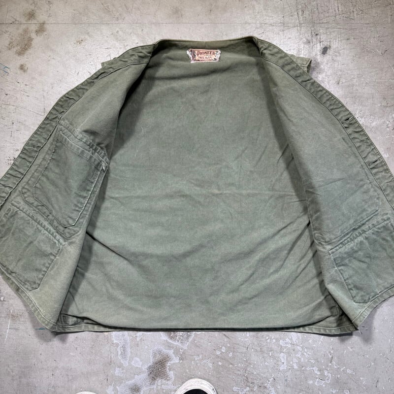 50年代頃のPIONEER BRAND DRY BAK ダックハンティングベストです。このPIONEER BRANDは1887年にカナダのバンクーバーでキャンバス製品を作るJones Tent and Awning Ltdが展開していたブランドです。今回ご紹介するこちらは、ダック地のハンティングベストでPIONEER BRANDが1934年から製造を始めたとされるDRY BAK社のOEM製品です。程よく色褪せたオリーブグリーンがとても良い雰囲気です。フロントはフラップ付きポケットが3つとフラップ無しポケットが付きます。首元のタグの両サイドが解れています。背面にはゲームポケットが付きYKKジッパーが使用されていますが恐らく交換されています。擦れや色褪せはございますが、背面ゲームポケット内部にも汚れは無くコンディションは良好かと思います。サイズ表記はございませんが、身幅の感じからM~L相当でしょうか。ハンティングベストですので着丈はやや短めなのでレイヤードを楽しんで合わせてみてはいかがでしょうか。