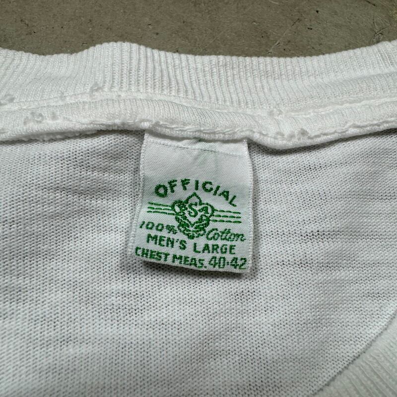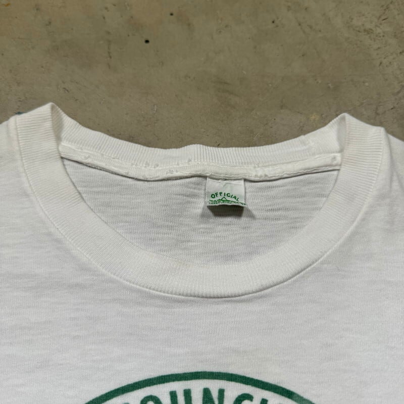 50年代から60年代頃のBOY SCOUT OF AMERICA(BSA) 染み込みプリントTeeです。BSAは1910年に設立された青少年運動組織の一つです。ご紹介するこちらはBSAを支援するYUCCA評議会が開催しているキャンプのスタッフに支給されていたと思われるTシャツで、フロントにYUCCA COUCIL CAMPSのマークが染み込みでプリントされています。右肩に1mm程のピンホールがあり、フロント腹部付近に小さな汚れがございます。その他は比較的コンディションは良好かと思います。LARGE表記ですがM相当かと思います。BSA系のTシャツはタイトな物が多いので、サイズが合う方は是非この機会にいかがでしょうか。