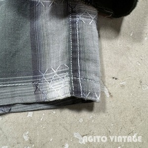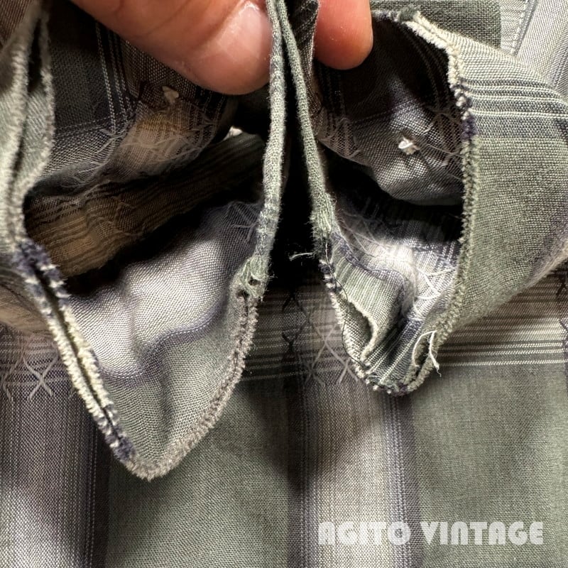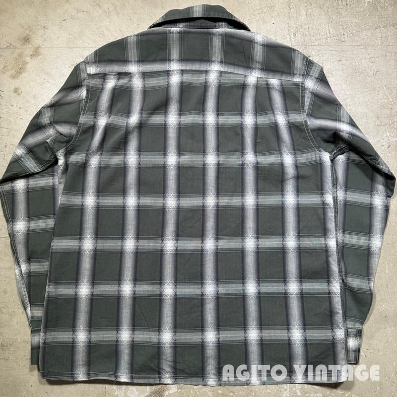 50年代から60年代頃のSandy Mac Donaldオープンカラーシャツです。創業年等は不明ですが、古くから良質なシャツを製造していたブランドのようです。ご紹介するこちらは襟芯の入らないループボタン仕様の開襟シャツです。胸ポケットはしっかりと柄が合わせられています。オンブレチェックにグラデーションで色味を合わせた織柄が入ります。襟に生地が薄くなっている箇所がございます。袖先が擦り切れており、右袖のボタンが付け替えられています。左脇付近に生地の解れがございます。その他ボディなどは目立つダメージ等はございません。Mサイズ表記のボックスシルエットですのでサイズが合う方も多いのではないでしょうか。グレーベースで落ち着いた印象ですのでコーディネートし易くオススメです。