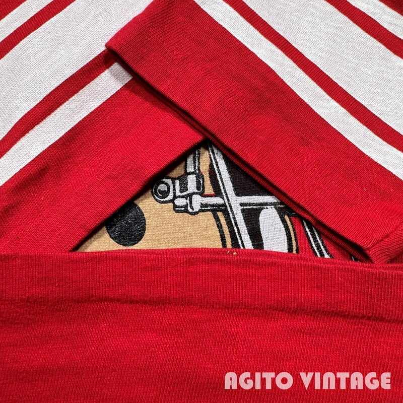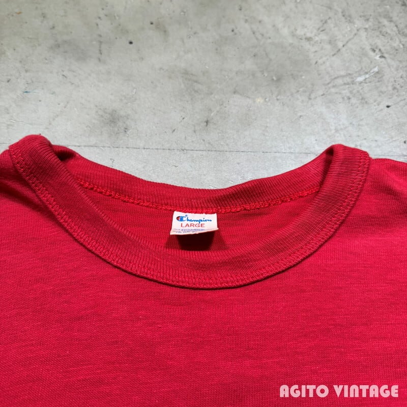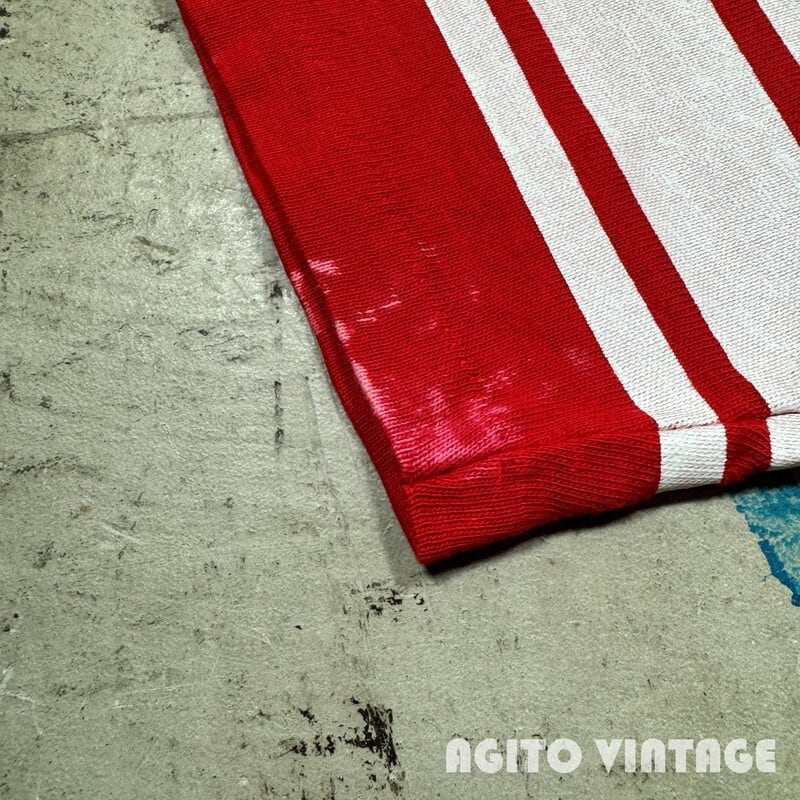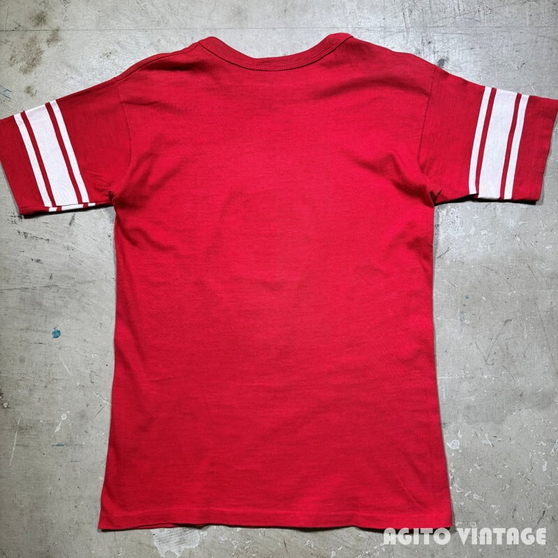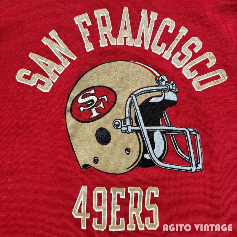 80年代頃のChampion SAN FRANCISCO 49ERS WIN Teeです。トリコタグが付くこちらは胸元の切り替えが無いWIN Teeと呼ばれるフットボールTです。49ERSはNFLを知らない方でも1度は目にした事があるチームでは無いでしょうか。チームカラーのゴールドとレッドの目を惹く1着です。袖、裾共にシングルステッチです。右袖にペンキ汚れの様な白っぽい汚れがございます。その他細かな汚れや全体的にやや褪色しております。ダメージは特にございません。Lサイズ表記ですが身幅は少し細目です。程よくフェードしたレッドカラーですのでデニムやミリタリーパンツとの相性は抜群です。王道アメカジスタイルがお好きな方は是非いかがでしょうか。