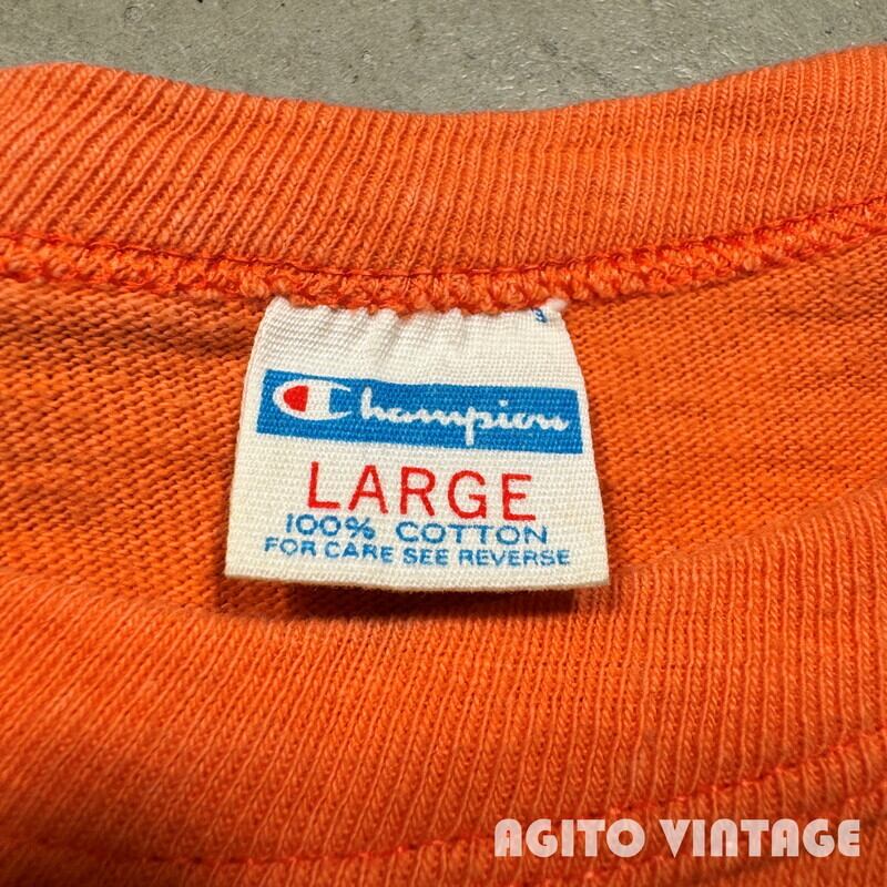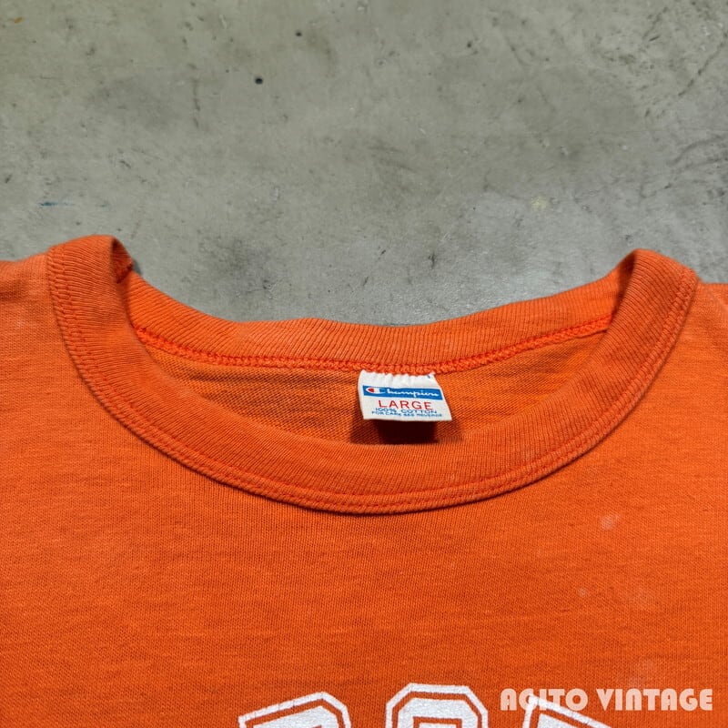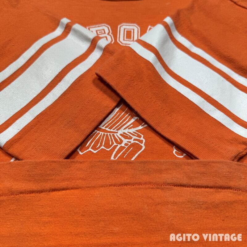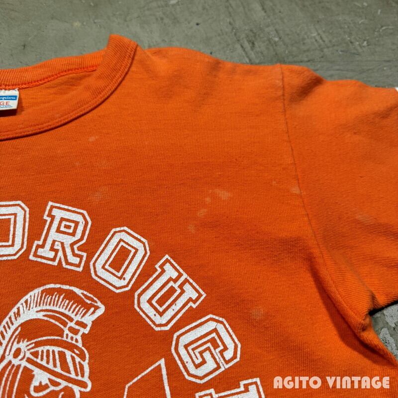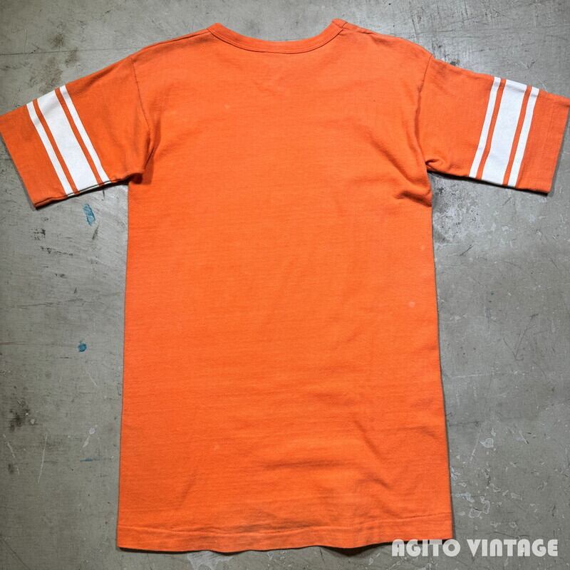 70年代頃のChampion SCARBOROUGH MIGHTY SPARTANS WIN Teeです。バータグが付くこちらは胸元の切り替えが無いWIN Teeと呼ばれるフットボールTです。SCARBPROUGH高校のフットボール部の1着の様です。ビビットでは無い少しくすんだオレンジボディカラーです。フロントやバックに白っぽいブリーチ抜けがいくつか見られます。毛羽立ち等の使用感はございますが、ダメージは特にございません。こちらもLARGE表記ですが、身幅は細目です。オレンジカラーもデニムやミリタリーパンツとの相性は抜群です。王道アメカジスタイルがお好きな方は是非いかがでしょうか。