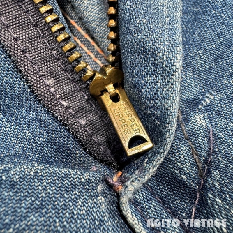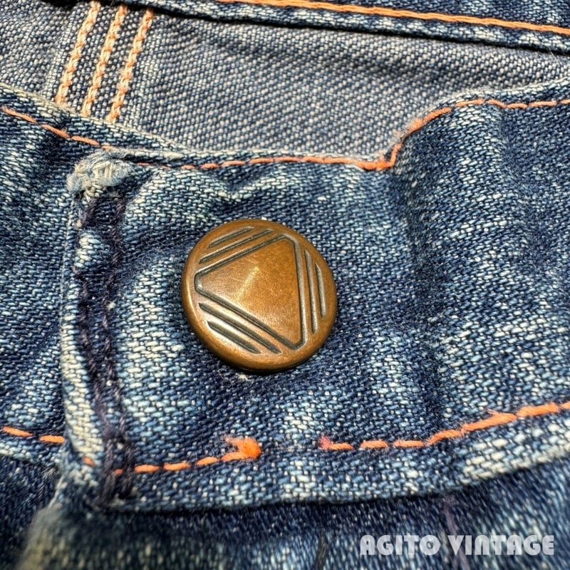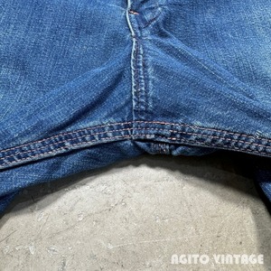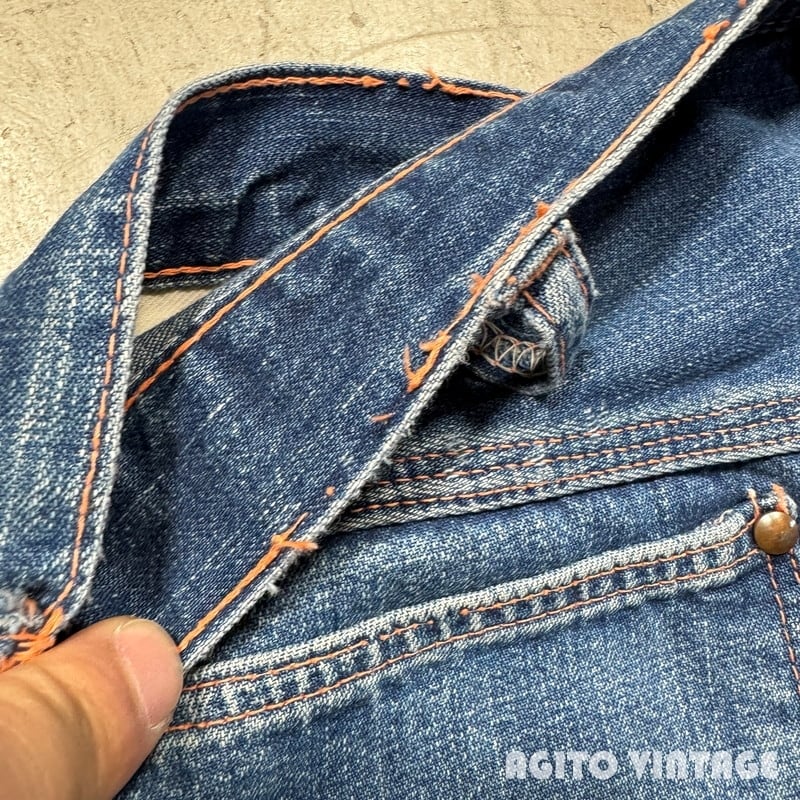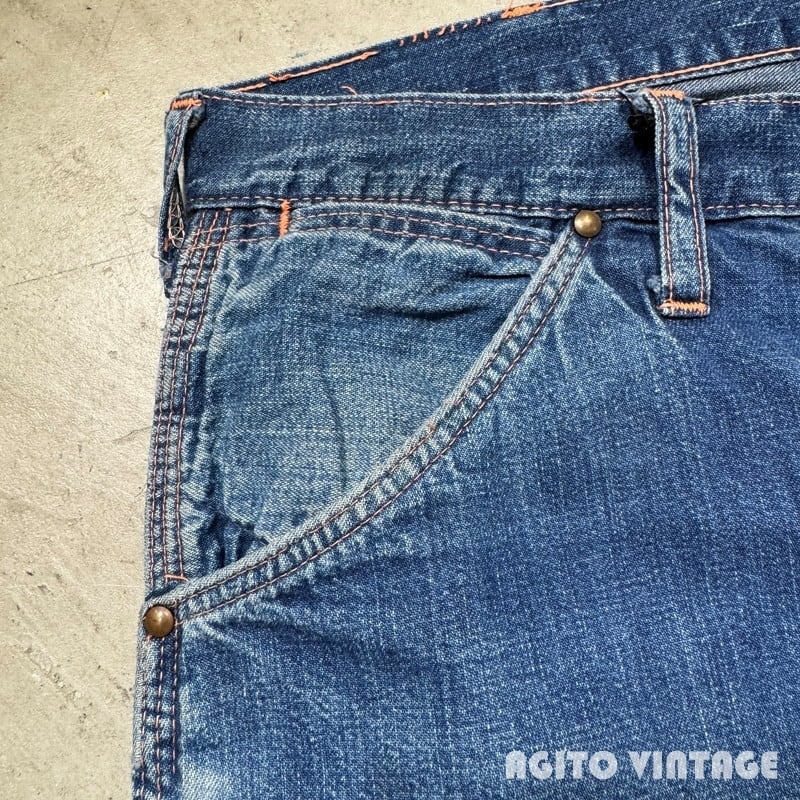 50年代から60年代頃のOld Kentuckyデニムペインターパンツです。1904年にKentucky Manufacturing Co.として創業し、1960年代にはWASHINGTON DEE CEEを展開していたWASHINGTON MANUFUCTURIN社に吸収合併されたブランドです。5割程の色残りで、古いデニム特有の縦落ちが見られます。ポケット縁にはむき出しのリベットで補強がされています。フロントはGRIPPERのカムロックジッパーが使われています。バランスよい色落ちで、フェードしたデニムにオレンジのステッチが映えます。ウエストなどに一部ステッチ飛びがあり、右バックポケットのリベット付け根に小さなダメージがございます。その他使用感はございますが、酷いダメージなど無く良好です。ウエストは実寸でW32インチですので男女ともに穿きやすいサイズではないでしょうか。古い年代のペインターパンツはマイサイズと出会った時が買い時だと思いますので、お探しだった方は是非この機会をお見逃しなく。