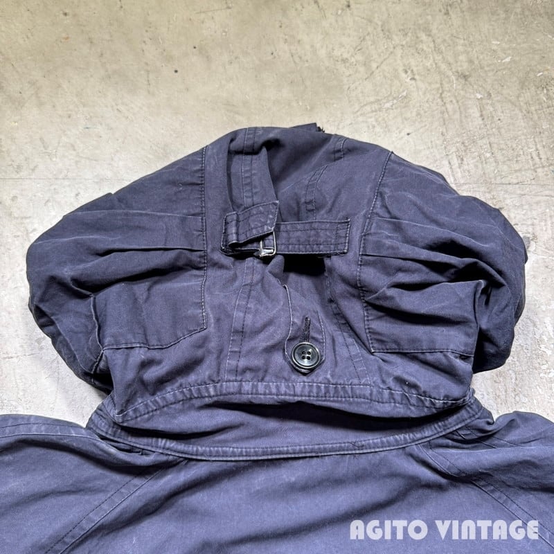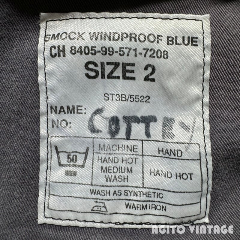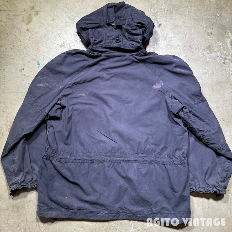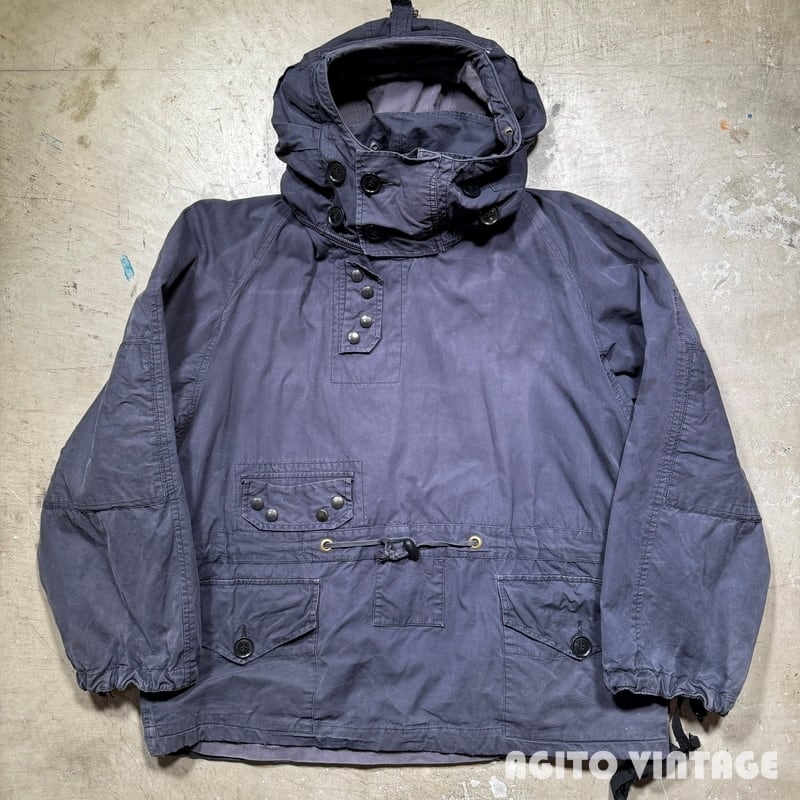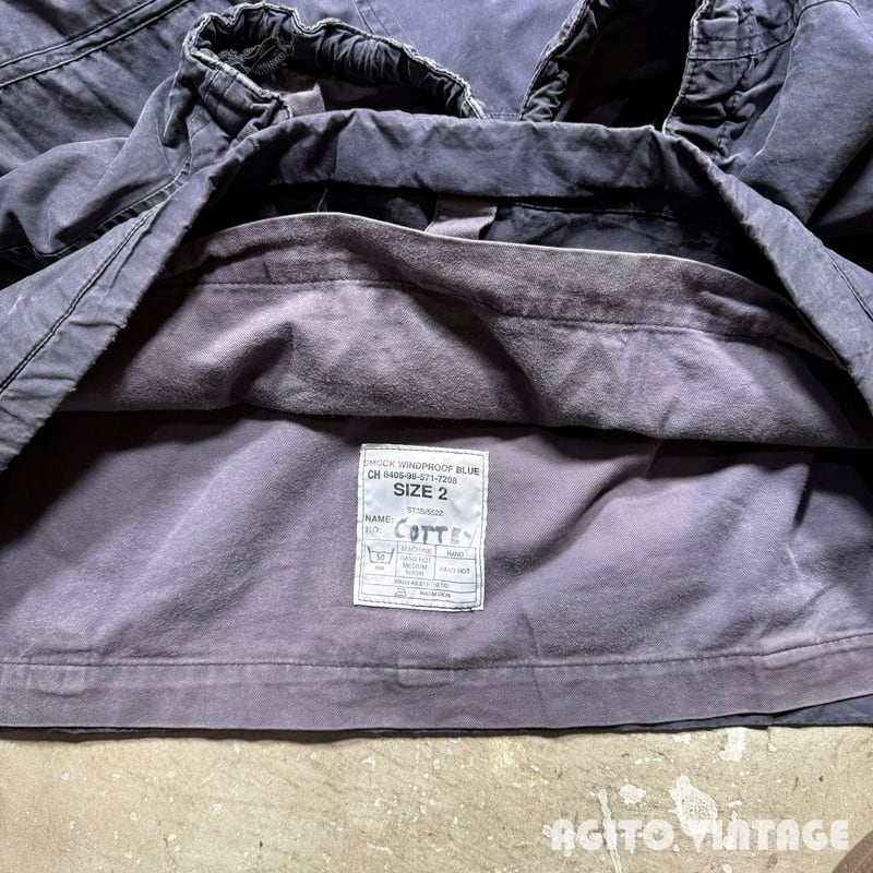70年代から80年代頃のROYAL NAVYベンタイルスモックです。元々RAF(王室空軍)の為に開発されたベンタイルコットンを表面に使用し、裏地にはコットンツイルのライナーが付く2重構造です。内タグにWINDPROOFと表記があるように雨風の強い甲板上で作業する兵士たちに支給されていたアイテムです。ヘルメットの上からでも被れる大き目なフードや、コードなどを留めるスナップボタン式のフラップなど、このアイテム特有のデザインがお好きな方も多いのではないでしょうか。全体的に色褪せしており、袖や背面にブリーチと思われる色抜けがございます。左袖に小さなダメージがございます。その他擦れや汚れ等ございますが、致命的なダメージ等はございません。タグは身長表記の物より古い数字表記で、サイズは2です。表記が4や5になるとかなり大きくだぼっとしてしまいますが、この2のサイズですと、程よくゆとりはあるものの着丈は長すぎないので良いバランスで着ていただける方も多いと思います。新し目な年式のモデルで色も濃くコンディションの良い個体も素晴らしいですが、こちらのように使いこまれてフェードした個体も雰囲気があって非常にかっこよいと思います。AGITOでは初めての入荷となります。お探しのだった方は是非この機会をお見逃しなく。