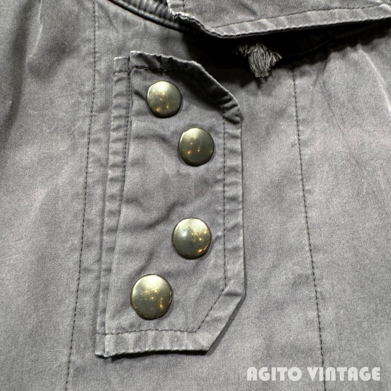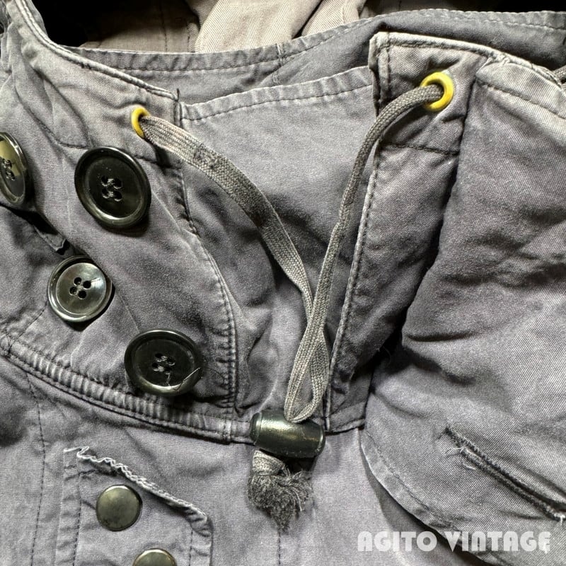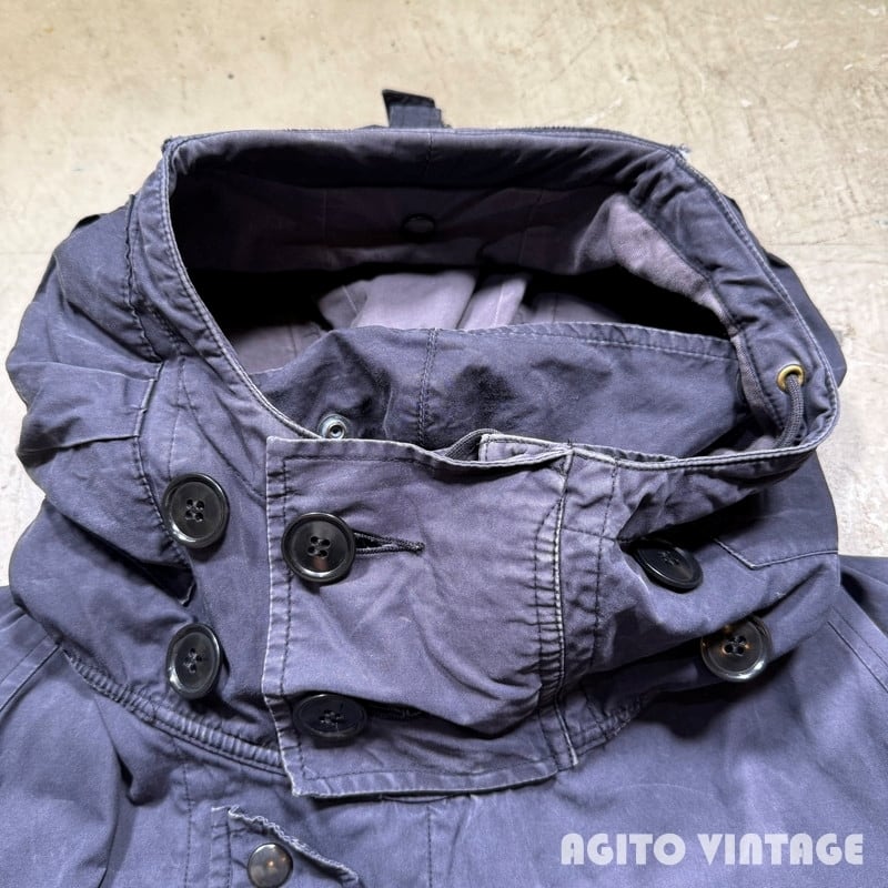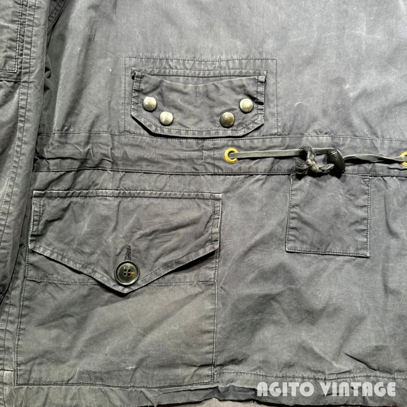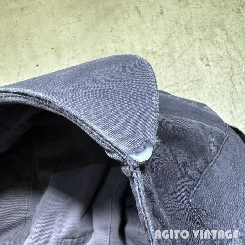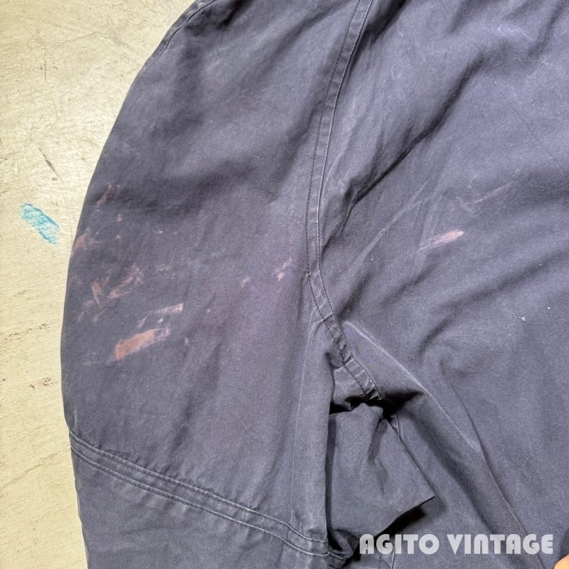 70年代から80年代頃のROYAL NAVYベンタイルスモックです。元々RAF(王室空軍)の為に開発されたベンタイルコットンを表面に使用し、裏地にはコットンツイルのライナーが付く2重構造です。内タグにWINDPROOFと表記があるように雨風の強い甲板上で作業する兵士たちに支給されていたアイテムです。ヘルメットの上からでも被れる大き目なフードや、コードなどを留めるスナップボタン式のフラップなど、このアイテム特有のデザインがお好きな方も多いのではないでしょうか。全体的に色褪せしており、袖や背面にブリーチと思われる色抜けがございます。左袖に小さなダメージがございます。その他擦れや汚れ等ございますが、致命的なダメージ等はございません。タグは身長表記の物より古い数字表記で、サイズは2です。表記が4や5になるとかなり大きくだぼっとしてしまいますが、この2のサイズですと、程よくゆとりはあるものの着丈は長すぎないので良いバランスで着ていただける方も多いと思います。新し目な年式のモデルで色も濃くコンディションの良い個体も素晴らしいですが、こちらのように使いこまれてフェードした個体も雰囲気があって非常にかっこよいと思います。AGITOでは初めての入荷となります。お探しのだった方は是非この機会をお見逃しなく。