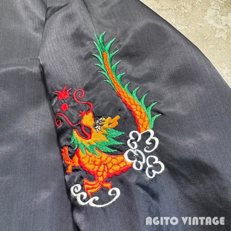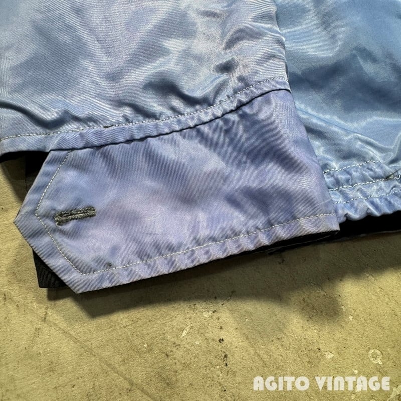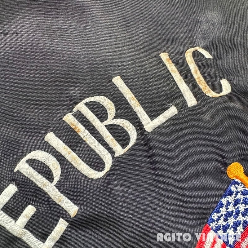 70年代の台湾スーベニアジャケットです。1972年から1974年にかけて駐留していた米兵がお土産として持ち帰ったアイテムだと思われます。時期的にはベトナム戦争の後期頃でベトジャンに似たデザインで作られています。素材はナイロンのリバーシブルタイプで、ジッパーは555のバタフライジッパーが使用されています。表はブラックで内側はライトブルーにうっすらとパープルを混ぜたような色合いです。細かな擦れや薄汚れはございますが、ダメージは特に無くコンディションは良好だと思います。サイズ表記はございませんが、L~XLほどの大き目サイズです。ベトジャンに比べるとなかなか実物を見る機会は少ないアイテムかと思いますので、お探しだった方は是非いかがでしょうか。サイズも大き目で申し分無い1着です。