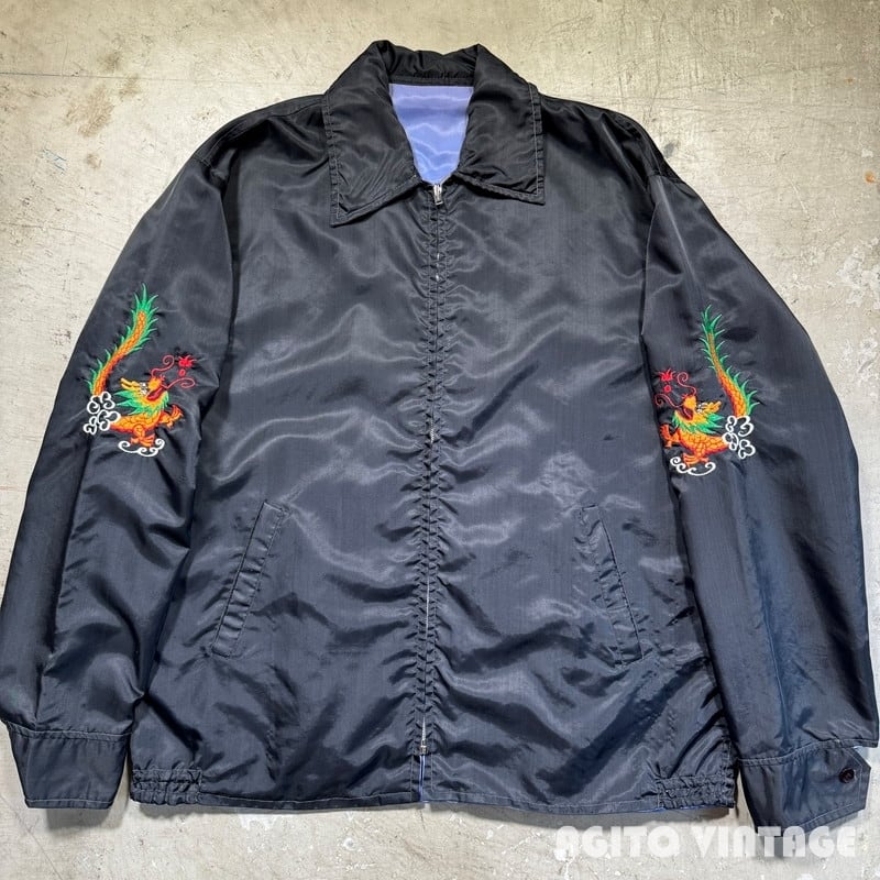 70's TAINAN TAIWAN スーベニアジャケット 台湾ジャケット リバーシブル 刺繍ナイロン ブラック ライトブルー 龍 ドラゴン マップ L~XL相当 NAM戦 希少 ヴィンテージ BA-2568 RM2987H
