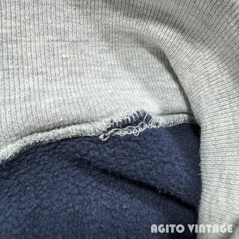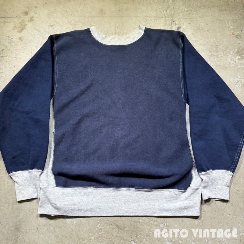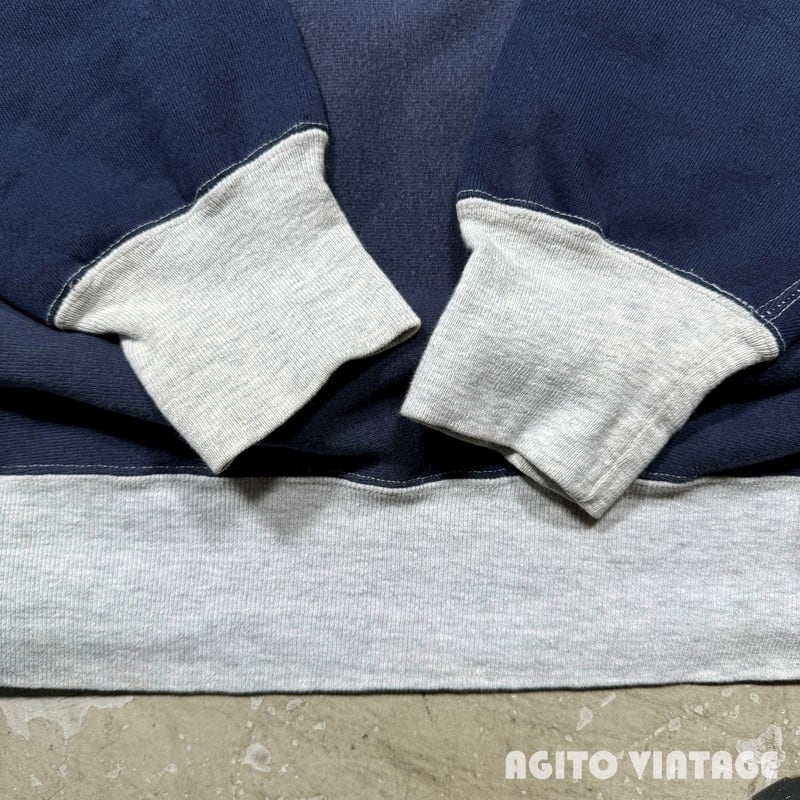 80年代頃のChampionリバースウィーブスウェットです。トリコタグが付くこちらはクレイジーパターンと呼ばれるシリーズの中でも珍しいとされるリブのみ切り替えが入るタイプです。杢グレーとネイビーの2トーンで構成されていますが、ボディのネイビーと袖のネイビーでは少し色の違いがあり、袖の方がやや濃い色味で厳密にいえば3トーンともいえる個体です。目玉等入らない完全な目無しというのもポイントが高いのではないでしょうか。タグに破れがございます。襟元や袖先などに若干薄汚れがございます。首リブ付け根に小さなピンホールがございます。裾リブ内側の一部にステッチが少し解れた箇所がございますが、着用に問題はなさそうです。需要の高いLサイズですのでお探しの方も多いのではないでしょうか。数あるリバースウィーブの中でもなかなか出ないコレクションピースだと思いますので、チャンピオンフリークの方は是非この機会をお見逃しなく。