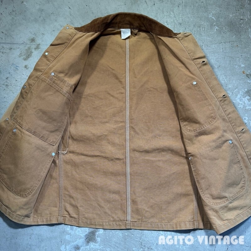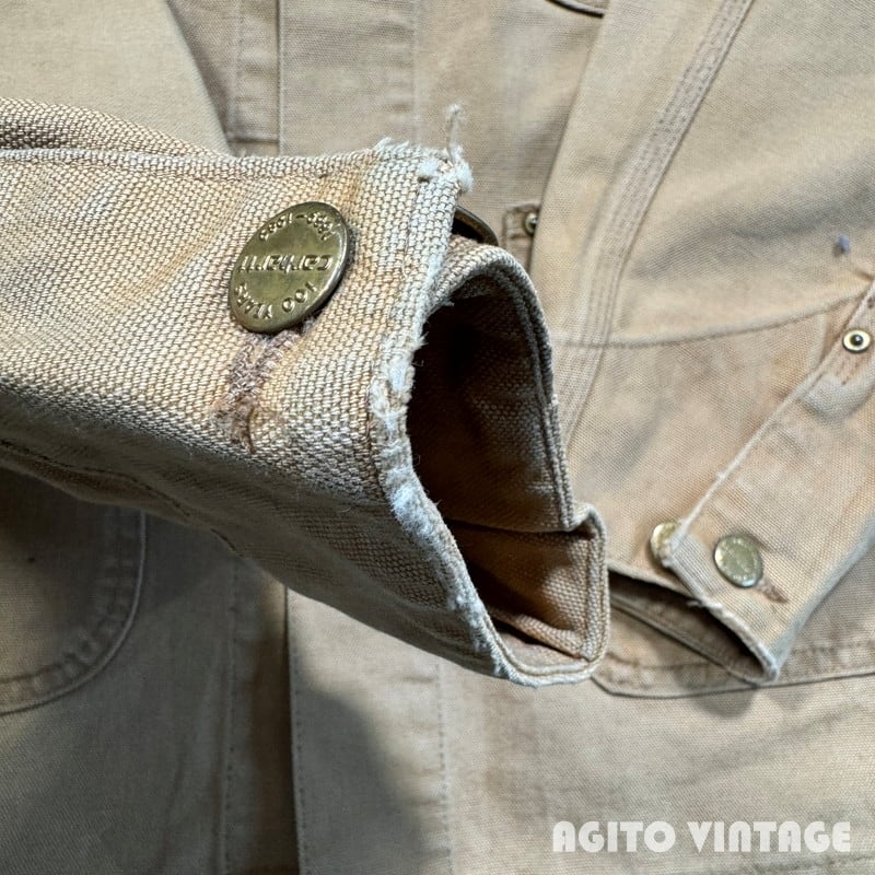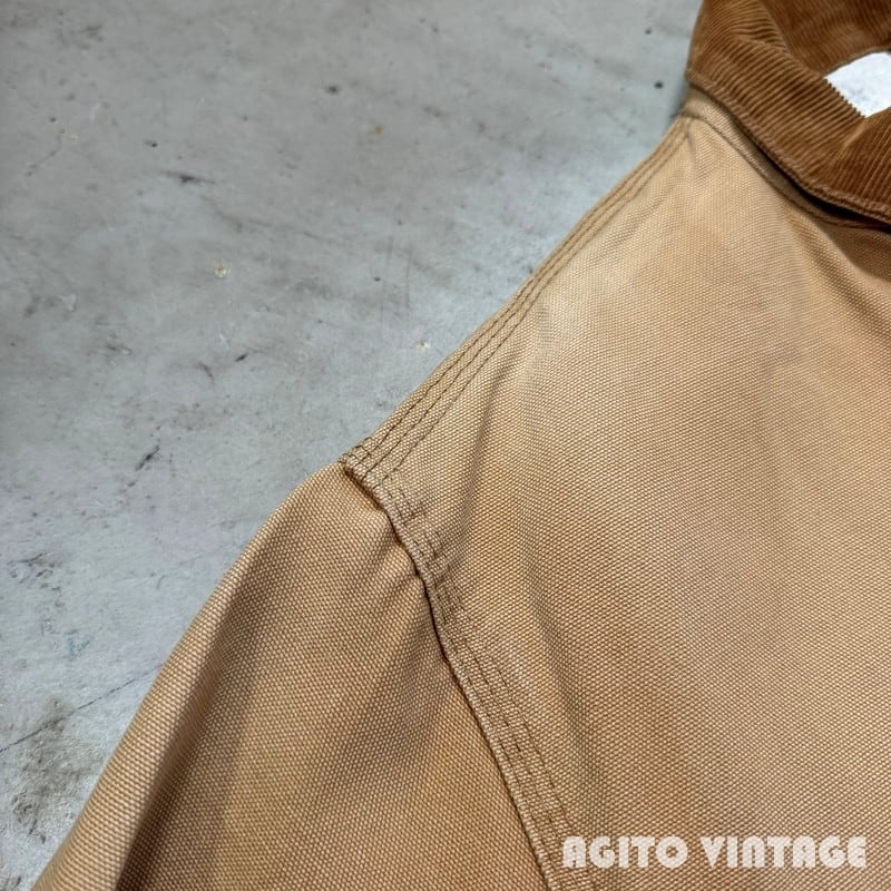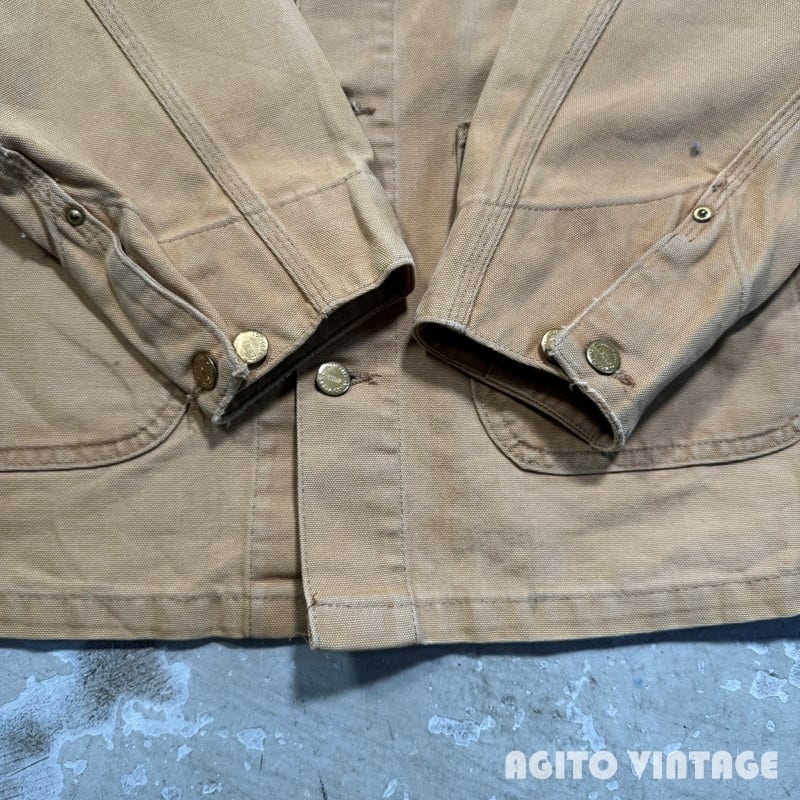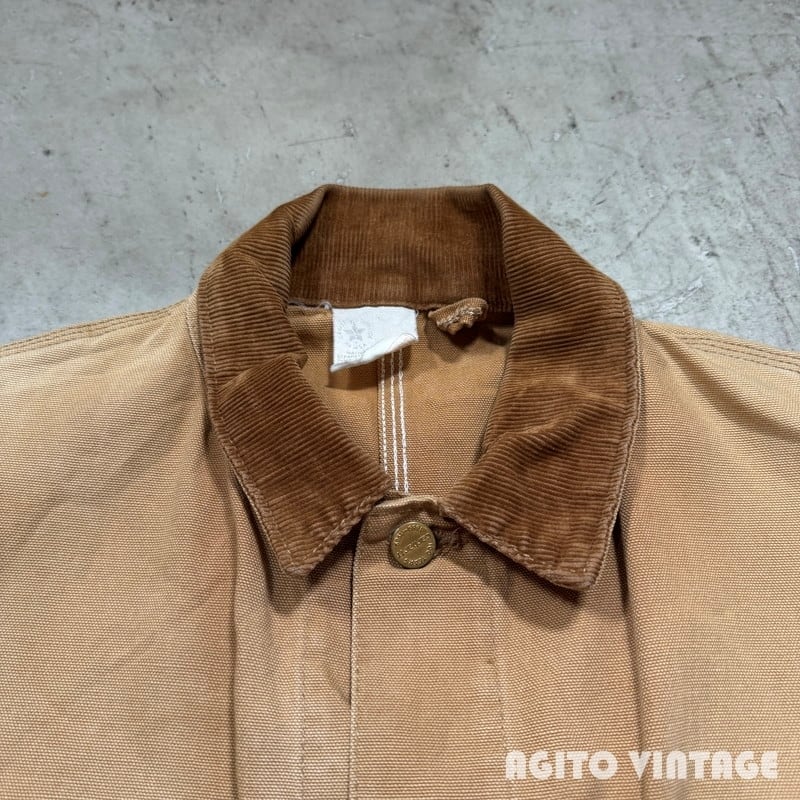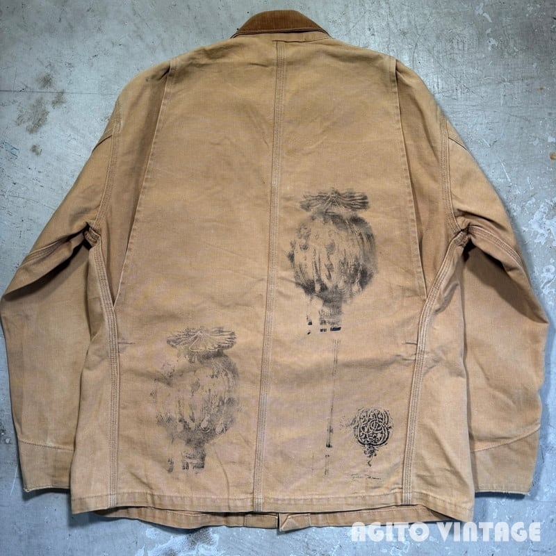80年代のcarharttミシガンチョアコートです。カーハートは1889年、アメリカのミシガン州デトロイトにて設立したワークウェアブランドで、こちらのアイテムは1989年に創業100周年を記念して作られたアニバーサリーモデルです。胸元のタグとボタンにには「100YEAR 1889 1989」の文字が入ります。こちらはブランケットライナーの付かない仕様です。全体的に色褪せやヤケがあり、袖先に擦れによる小ダメージがございます。背面には植物の様な物をモチーフにしたデザインがシルクスクリーンもしくはスタンプでプリントカスタムが施されています。その他細かな薄汚れはございますが、コンディションは悪くないと思います。サイズ表記は確認できませんが、実寸L(42)相当で需要の高いサイズではないでしょうか。carharttの100周年モデルは様々な種類がございますが、定番のミシガンコートは特にお探しの方も多いと思われますので、サイズが合う方は是非いかがでしょうか。