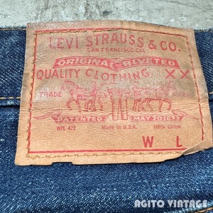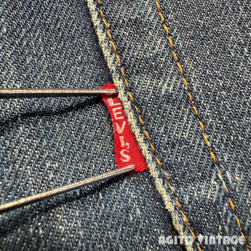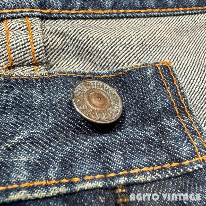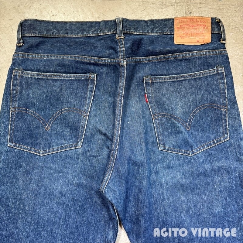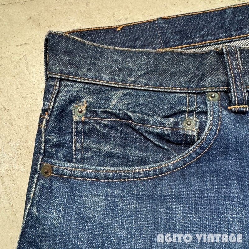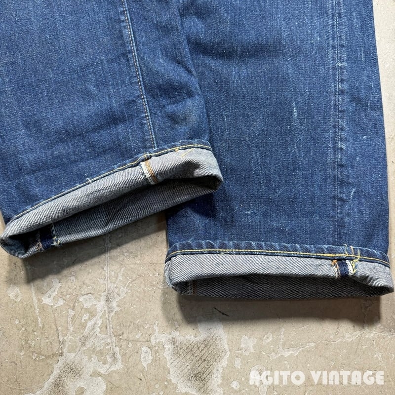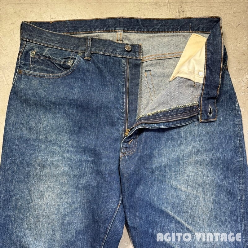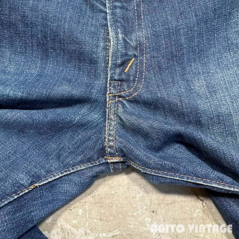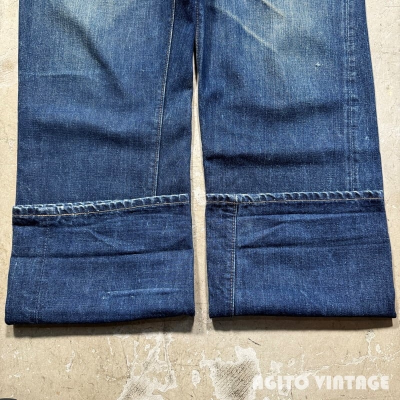 70年代のLEVI'S 517-0217ブーツカットデニムです。トップボタン裏刻印8、42TALON、バックポケット裏シングル、アウトシーム裏両面シングル、赤タブBig E、不均等V。1971年にデニムラインの517が発売され、66前期へ移行するまでの僅か1~2年程という極めて短い期間のみ製造されていた希少アイテムで、紙パッチの印字はほとんど消えていますが、デカ文字印字の初期のモデルだと思われます。色残りは6割程で濃淡のついた良い色落ちです。裾等に若干擦れがあり、左腿に小さなピンホールが1箇所ございますが比較的コンディション良好な個体です。擦れ517と言えば緩やかに裾が広がったブーツカットシルエットで有名ですが、初期頃のモデルの中にはその広がりが極めて緩い物も混在しているようで、こちらの個体はほぼストレートシルエットです。ウエストの表記は消えかけていますが実寸W38インチの少し大き目サイズです。レングスは表記(かなり薄いですが)L32で実寸はW31.5のオリジナルチェーンステッチです。最初期の517 Big Eはなかなか市場にも出ないと思いますので、お好きな方は是非この機会にいかがでしょうか。ストレートシルエットというのもオススメポイントです。