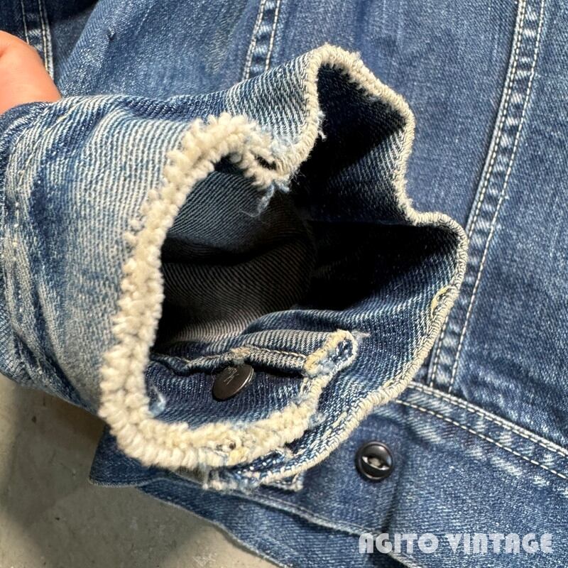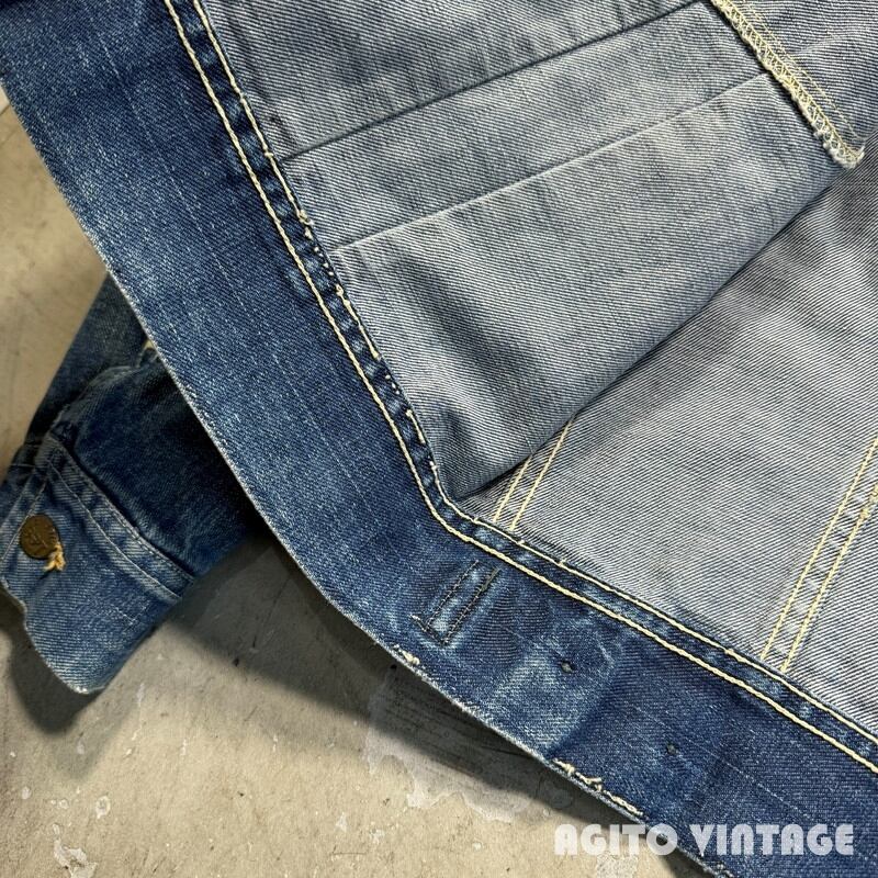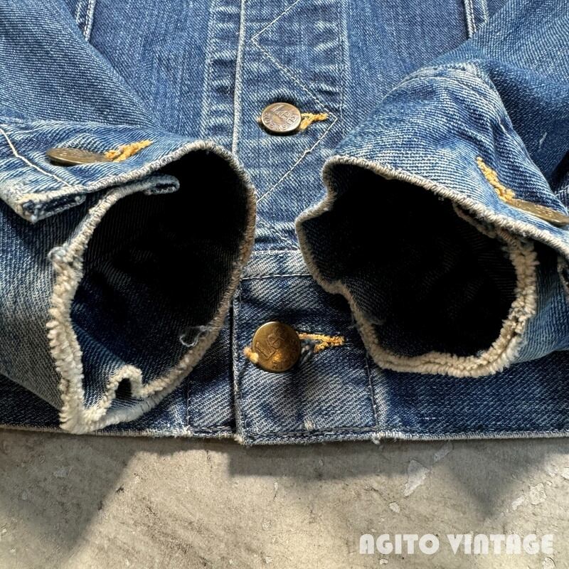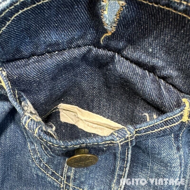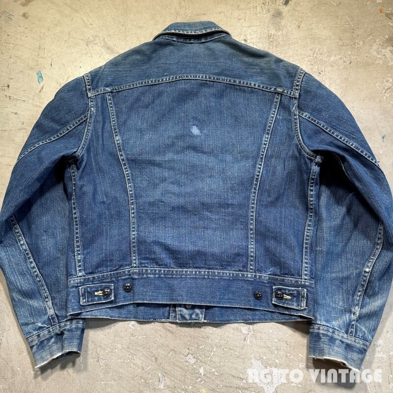 50年代後半頃のLee 101-Jデニムジャケットです。50年代後半頃に極短い期間のみ製造された、三角赤タグの付くモデルです。首タグ、ピスネーム共に®、MR表記はございません。ボタン裏はK刻印です。右ポケット内側にユニオンチケットが縫い付けられております。色残りは4~5割ほどで、Leeらしい縦落ちが見られる個体です。襟や背面中央にリペアが施されており、両袖口や裾に擦れやダメージが見られます。左袖のステッチが一部ほつけています。袖や肩などに薄汚れはございます。表記は40 REGですので、標準体型の方ですと良いサイズ感で着用していただけるのではないでしょうか。状態は多少考慮はしておりますが、リーバイスの2ndモデルと同等の時代と考えるとまだまだ手に取って頂きやすい価格帯だと思います。お探しだった方は是非この機会にいかがでしょうか。