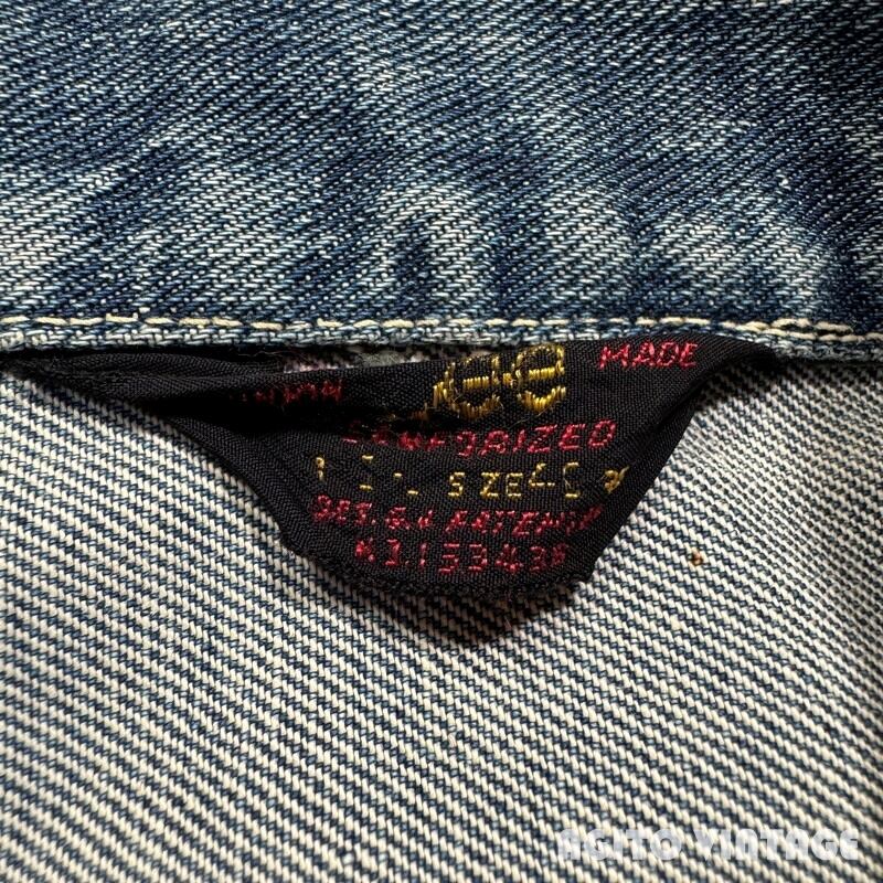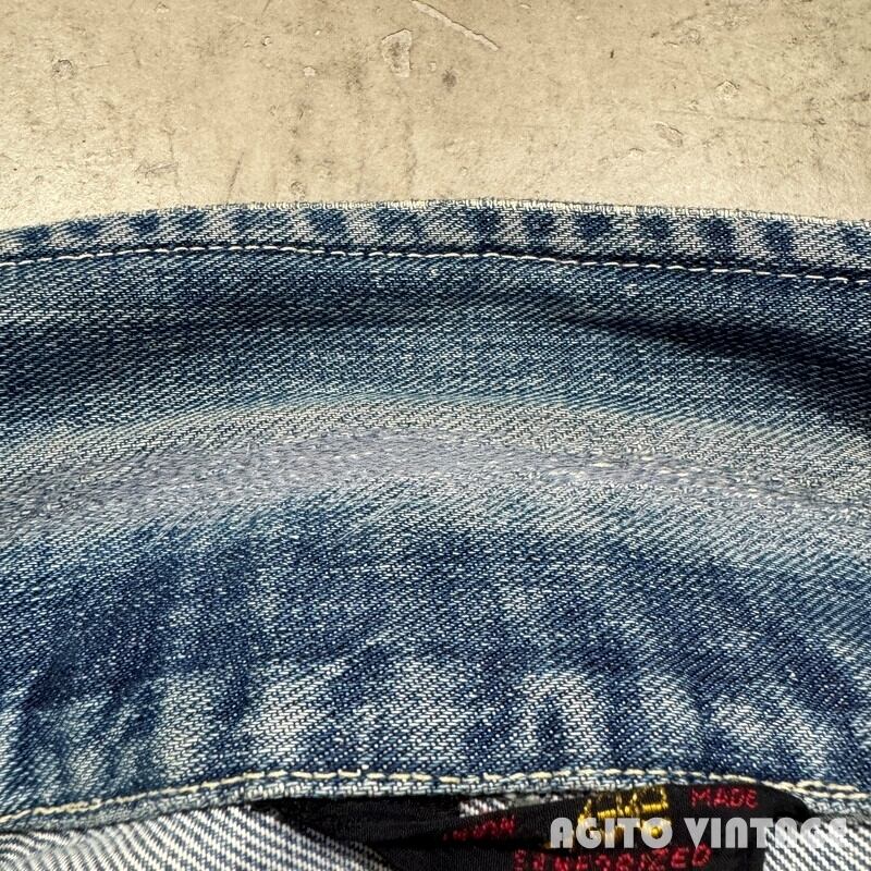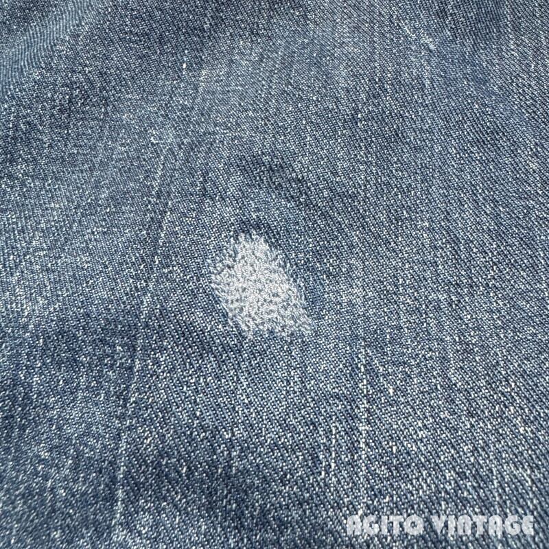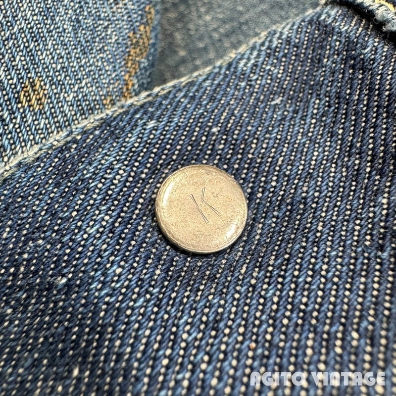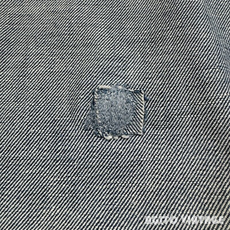 50年代後半頃のLee 101-Jデニムジャケットです。50年代後半頃に極短い期間のみ製造された、三角赤タグの付くモデルです。首タグ、ピスネーム共に®、MR表記はございません。ボタン裏はK刻印です。右ポケット内側にユニオンチケットが縫い付けられております。色残りは4~5割ほどで、Leeらしい縦落ちが見られる個体です。襟や背面中央にリペアが施されており、両袖口や裾に擦れやダメージが見られます。左袖のステッチが一部ほつけています。袖や肩などに薄汚れはございます。表記は40 REGですので、標準体型の方ですと良いサイズ感で着用していただけるのではないでしょうか。状態は多少考慮はしておりますが、リーバイスの2ndモデルと同等の時代と考えるとまだまだ手に取って頂きやすい価格帯だと思います。お探しだった方は是非この機会にいかがでしょうか。