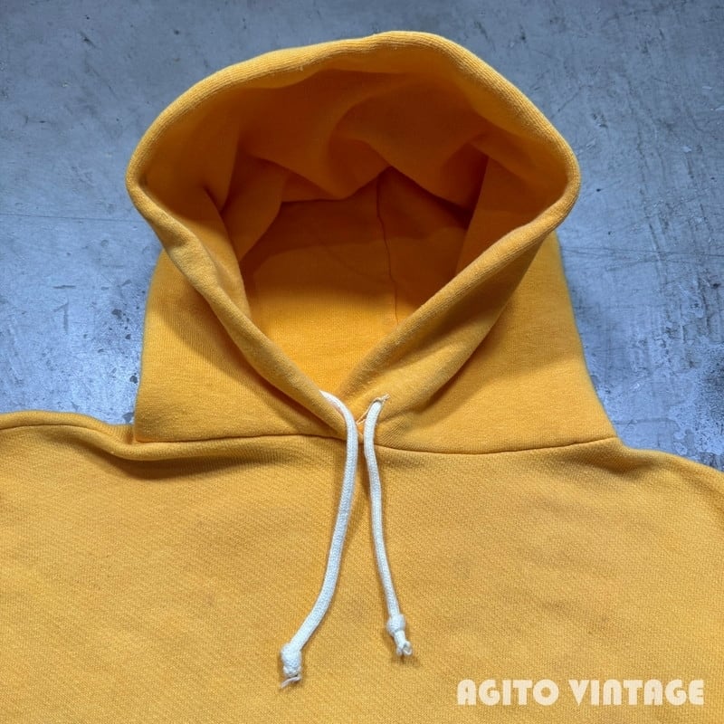 ~60年代頃のUnknownスウェットパーカーです。タグ欠損の為ブランド不明です。コットン地の希少なイエローカラーです。裾とポケット以外は内縫い仕様です。セットインスリーブで肩幅は広めです。フード紐も欠損無く残っています。フードに小さなダメージが1箇所あり、袖などに薄汚れがいくつかございます。袖先のステッチにややお連れがございます。その他使用感はございますが、年代を考慮するとコンディションは良いか思います。サイズタグはございませんがS相当の丈感です。肩幅と身幅にはゆとりがあるので、短丈で合わせたいという方には良いサイズ感かもしれません。イエローカラーは以前からレッドやネイビーなどに比べると見かける頻度の少ない色味で、お探しの方も多いと思います。サイズが合う方は是非この機会にいかがでしょうか。