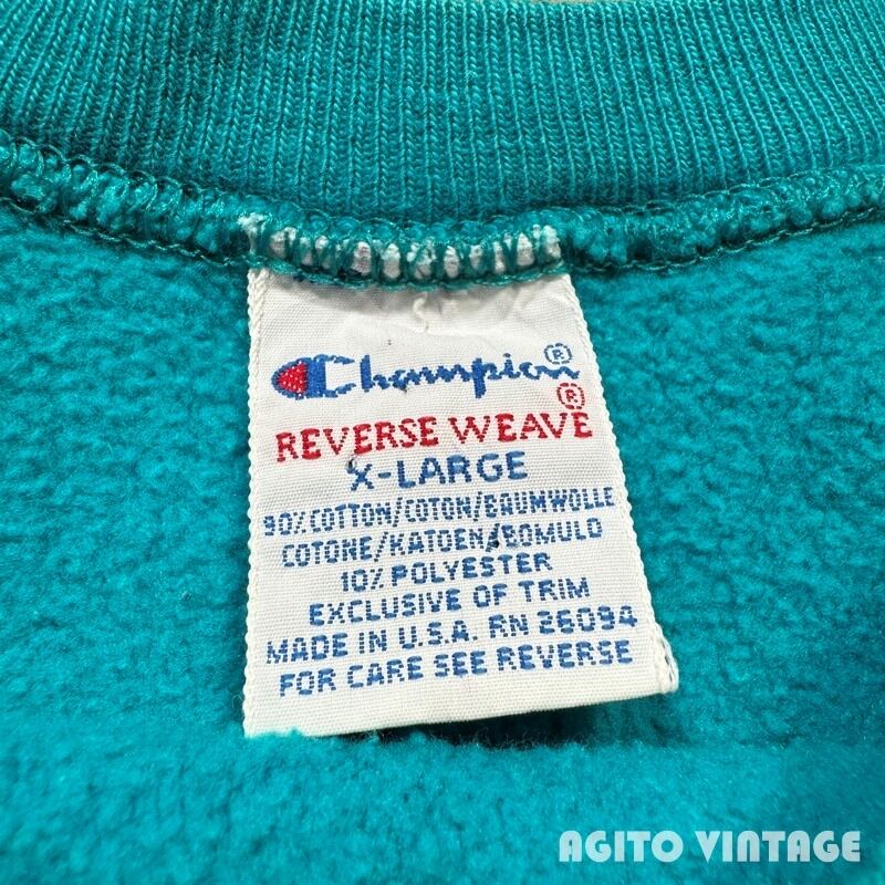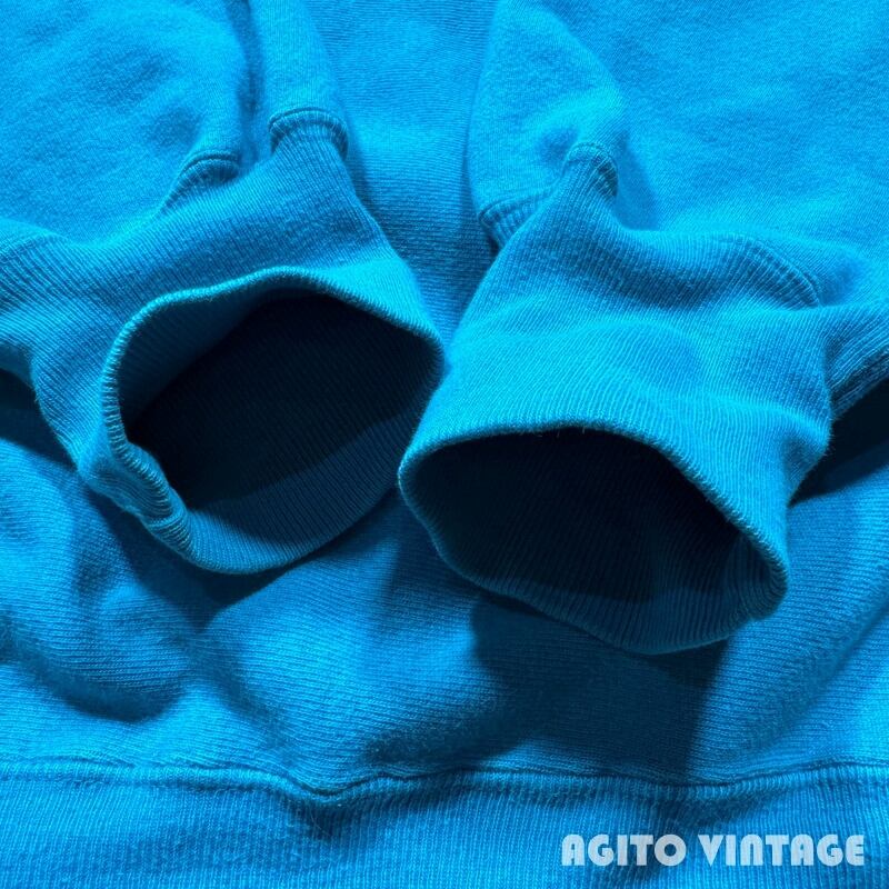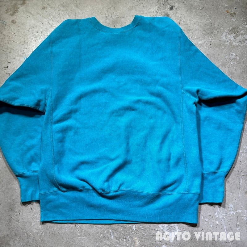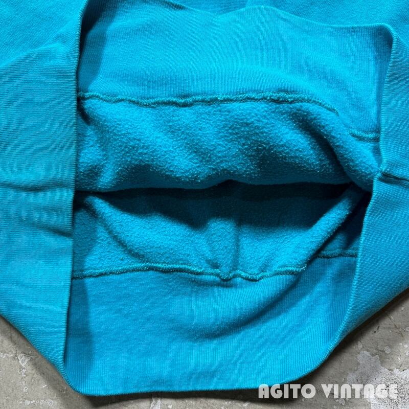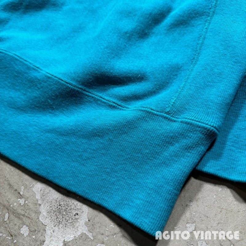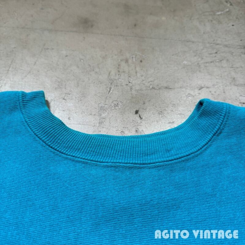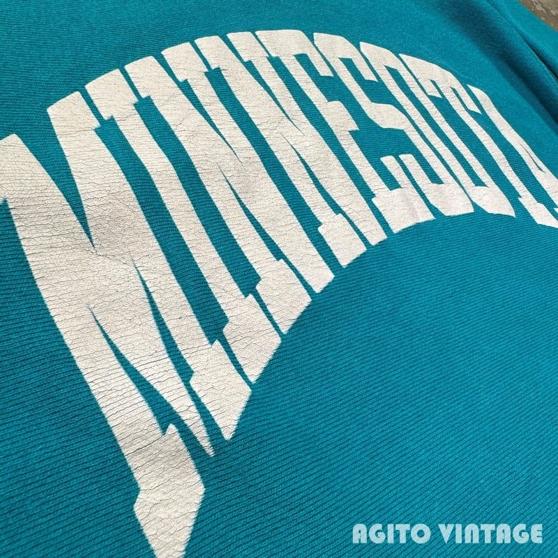 90年代のChampionリバースウィーブスウェットです。刺繍タグが付くこちらは発色の良いターコイズカラーです。フロントにはMINNESOTAのプリントが入ります。個人的にはこのターコイズブルーボディーは目玉かスクリプトロゴの印象が強いので、プリントが入る個体はあまり見かけない印象です。プリントにはややクラックが入りますが剥がれ等はございません。襟元や袖先、ボディにやや薄汚れがございます。全体的に若干フェードや毛羽立ちも見られますが、ダメージは特に無くコンディションは良好なかと思います。XL表記でゆったりとしたサイズです。ターコイズとホワイトの発色も良いのでアウターなどを羽織る季節では良い差し色として使えそうです。カラー物のリバースをお探しだった方は是非この機会にいかがでしょうか。