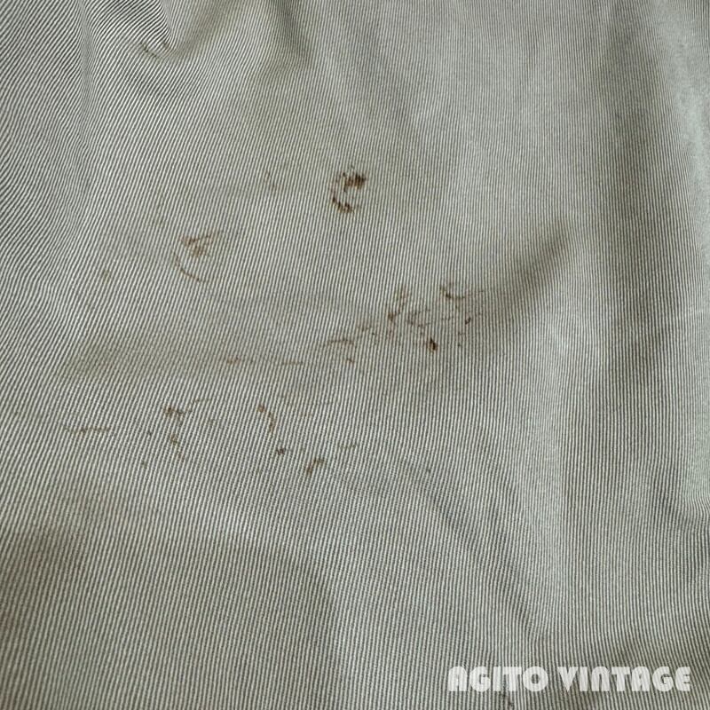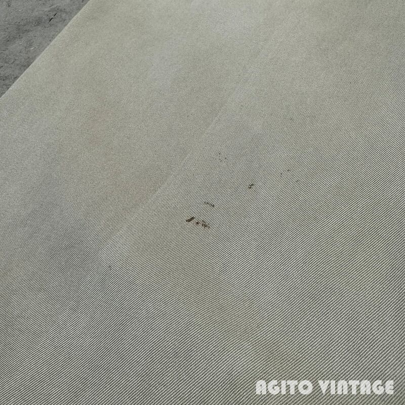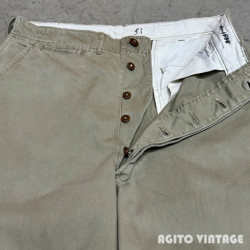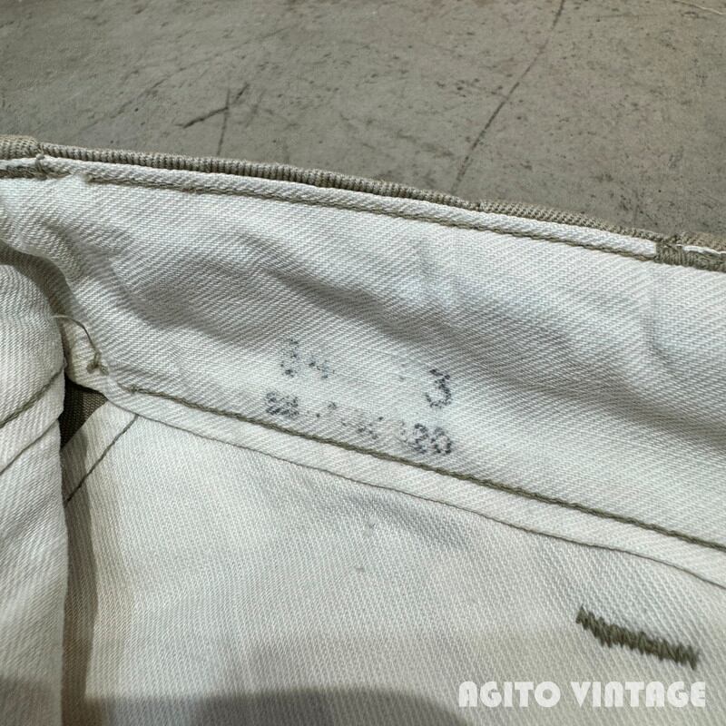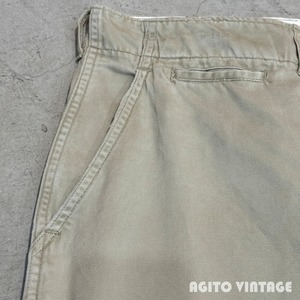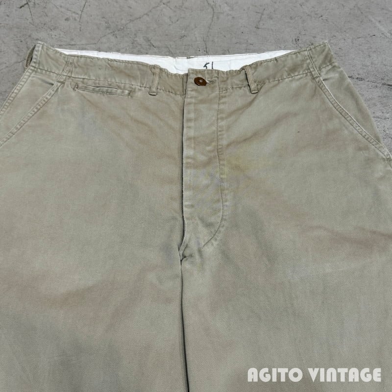 40年代のU.S.ARMY 45KHAKI チノトラウザーズです。M-1941、M1943に続き人気の高いヴィンテージチノとして知られるこちらは、フロント尿素ボタン、片玉縁のコインポケットとバックポケット、斜めのフロントポケット、アウトシームはダブルステッチです。スレーキスタンプはMIL-T2064表記です。ベルトループは細いタイプでオフセット仕様です。ポケット縁などに擦れが見られます。全体的に薄汚れがあり、背面に錆汚れの様なものがございます。大きなダメージやリペア等は無く状態は良好です。レングスは裾上げされているようですが長さは充分残っています以。ウエストは表記W34インチですが実寸はW33インチです。MIL-T-2064シリーズも色々な仕様で存在しますが、中でもダブルステッチタイプを探されている方が多いように感じます。お探しだった方は是非この機会にいかがでしょうか。