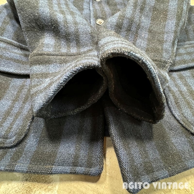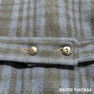 30年代から40年代頃のChippewa。ウールジャケットです。CHIPPEWA FALLS WOOLEN MILLS Coは1882年に創業したウールウェアなどを製造していたブランドです。ご紹介するこちらはフロント下部に2つのポケットが付くモデルで、古い年代のアイテムではなかなか見かける機会の少ないブルーチェックのウールが使われています。背面には腰ベルトが付きます。トップと背面腰ベルトのボタンが付け替えられています。袖先にもボタンが付いていたような形跡がありますが欠損しています。襟部分に擦れ人よる褪色が見られ細かな毛玉等はございますが、虫食いなど無くコンディションは良好です。薄く見にくいですが44表記です。需要の高いサイズ感ではないでしょうか。シンプルなデザインでシルエットが綺麗です。古い年代のウールジャケットをお探しだった方は是非この機会にいかがでしょうか。