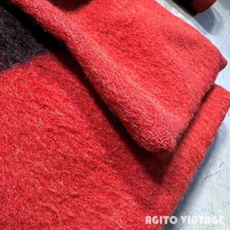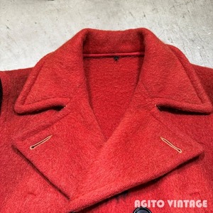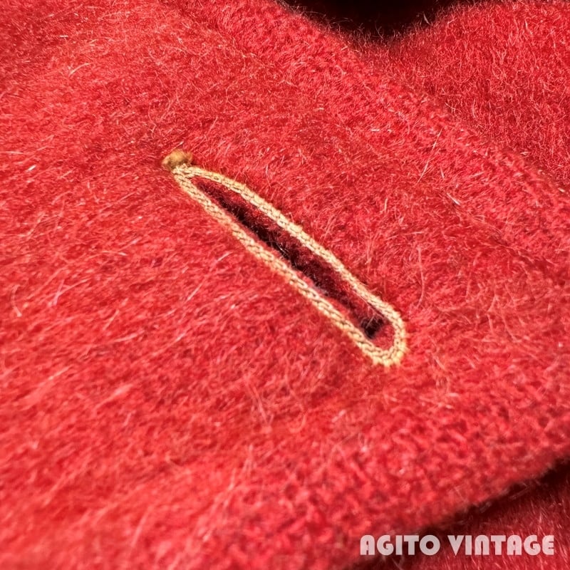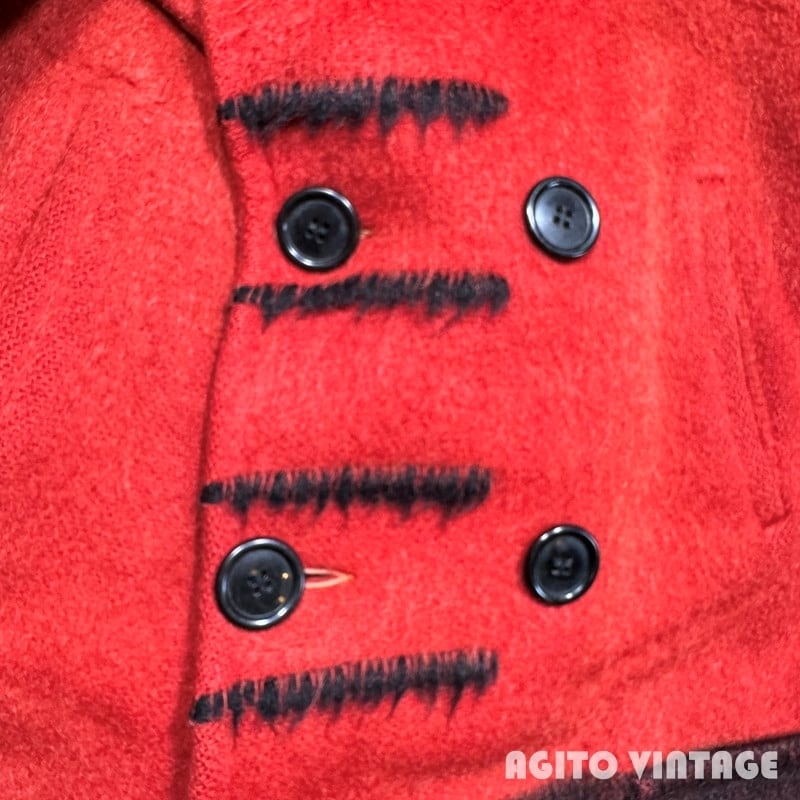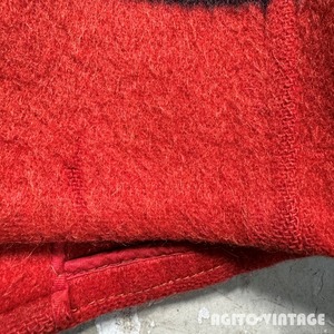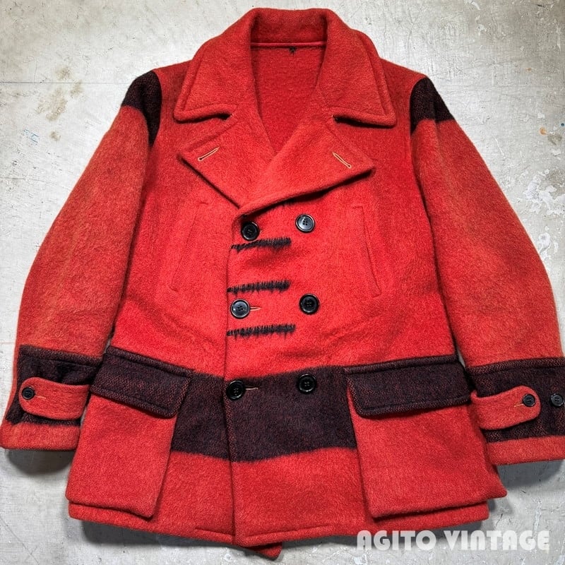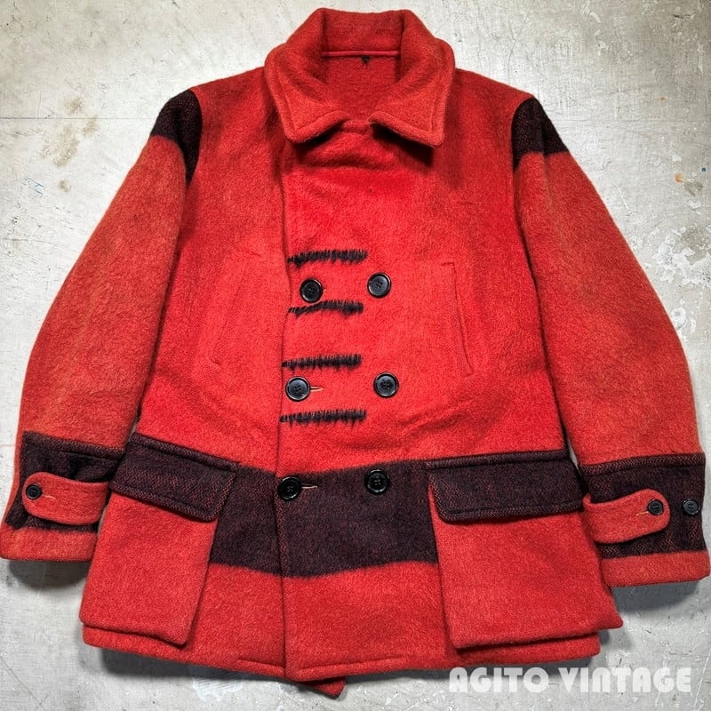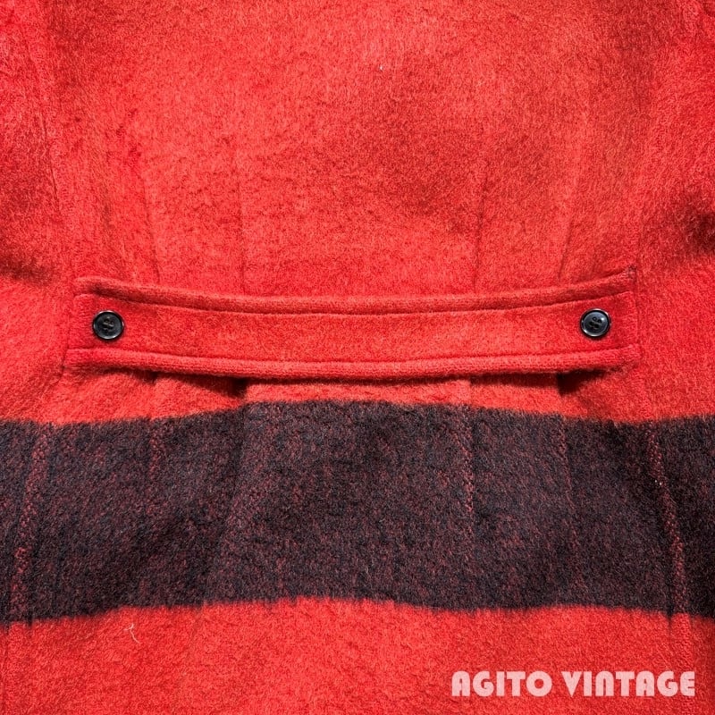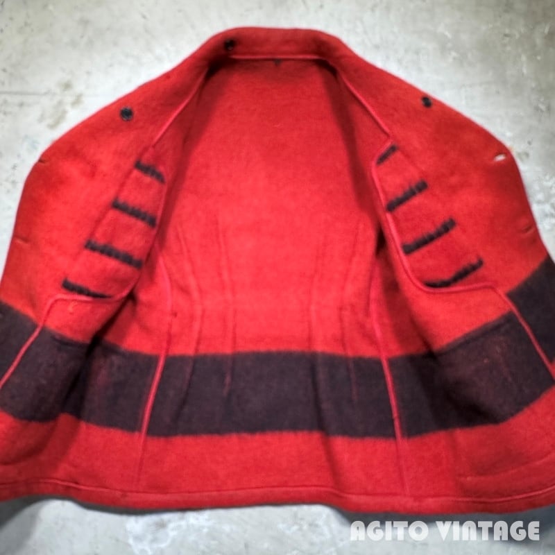 30年代から40年代頃と思われるUnknownブランケットコートです。タグが欠損している為ブランドは不明です。HUDOSON'S BAY社製かなと思いますが、下部のフラップポケットはマチのあるタイプで背面に入るダーツ等、同年代頃のモデルと比べても少し違ったディティールが見られます。フロントには当時ウールの質を表していたとされる4本ラインが入ります。胸元のスラッシュポケット内側には珍しい紫のネル地が使用されています。全体的にやや色あせしており、ポケット付近や背面などにウールが擦れて薄くなった箇所がいくつかございます。表記はございませんが42-44(L)相当だと思われ、サイズ感も良くシルエットはとても綺麗です。古い年代のブランケットコートをお探しだった方は是非この機会にいかがでしょうか。