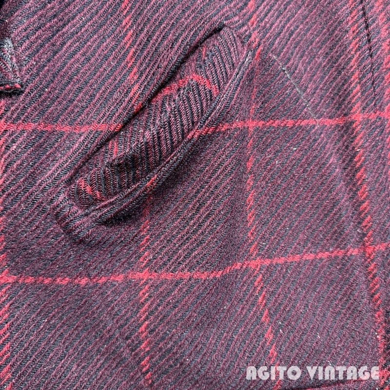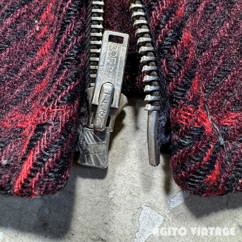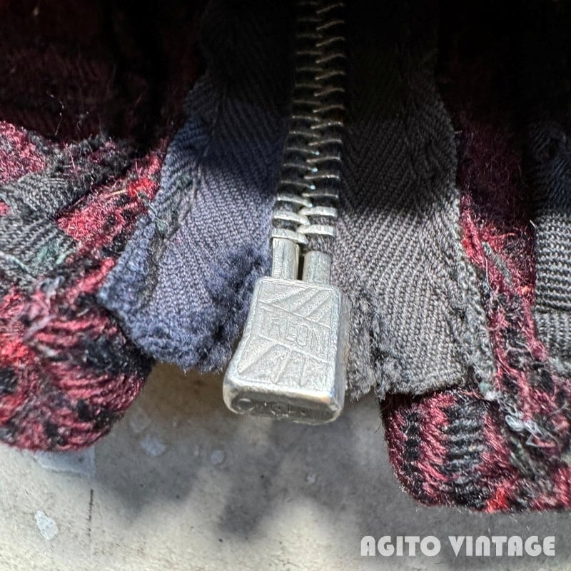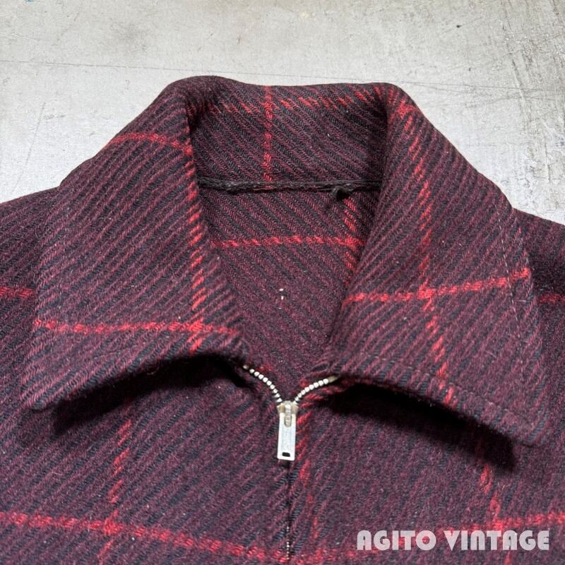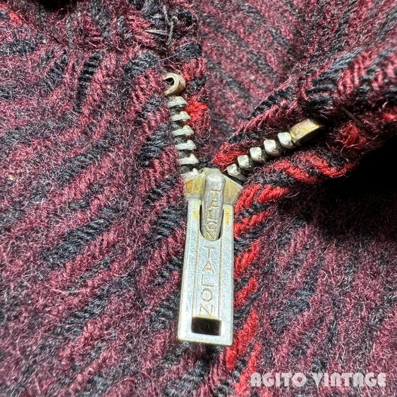 40年代のLAKELAND MANUFACTURING COウールスポーツジャケットです。LAKELAND MFG COは1894年に創業したブランドで、オリンピック用のパレードコートやファラオコートなどで知られています。ご紹介するこちらは古いタグが付く1着で、フロントにはコの字のデコTALONが使用されています。ジッパー下面にD0刻印が確認でき、1930年と1940年は同じ刻印を使用していますが、タグなどから後者の1940年に作られた物だと思われます。ブラウンベースにレッドのラインが入るデザインで、斜めにブラックのラインも入ります。ウエストにはサイドアジャスターが付きます。袖先にややダメージがあり、パイピング部分にも一部擦れによるダメージがございます。ジッパーの差し込み部分にダメージがございますが、今のところ開閉に問題はございません。背面下部中央に小さなハンドリペアがございます。年代を考慮すればコンディションは悪くないと思います。表記が確認できませんが、こちらも42‐44(L)相当で良いサイズ感です。落ち着いた色味ですのギャバジンスラックスなどと合わせて渋めなスタイルで合わせてみてはいかがでしょうか。サイズも良いのでお勧めです。