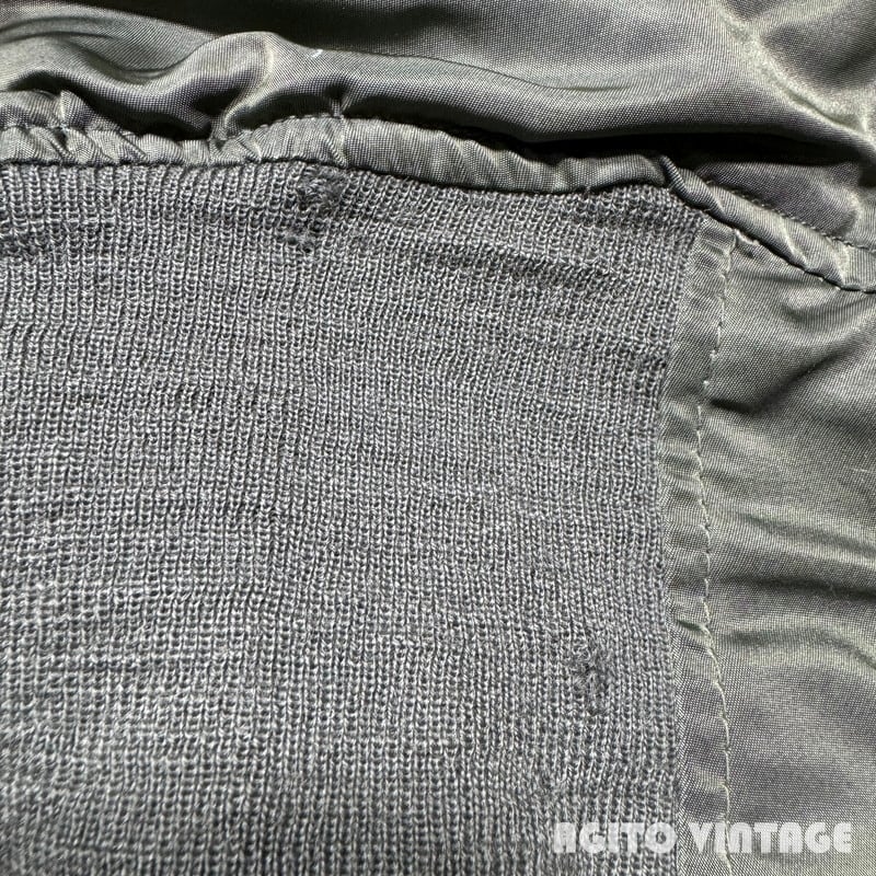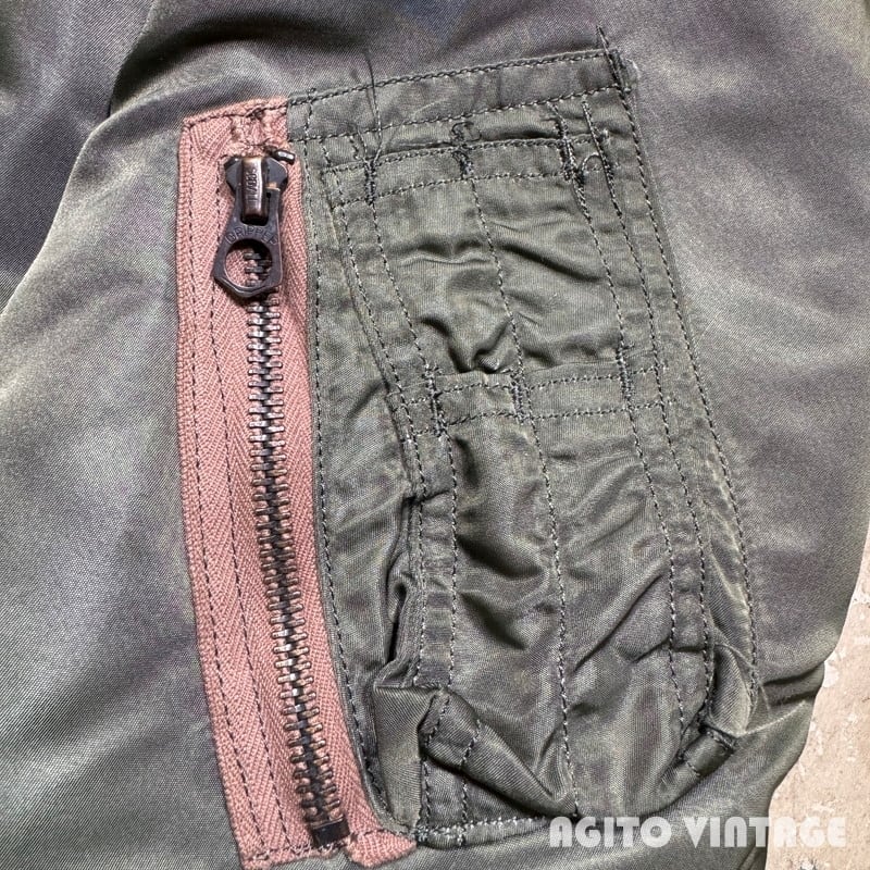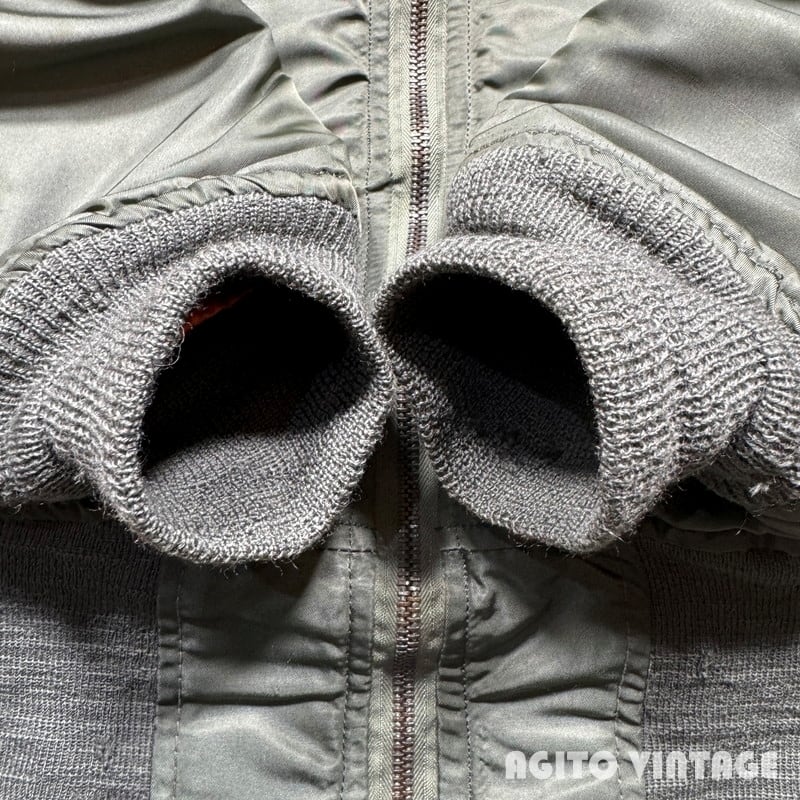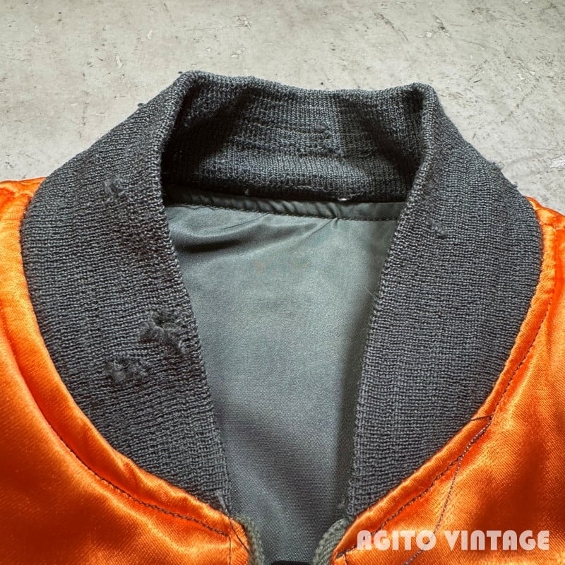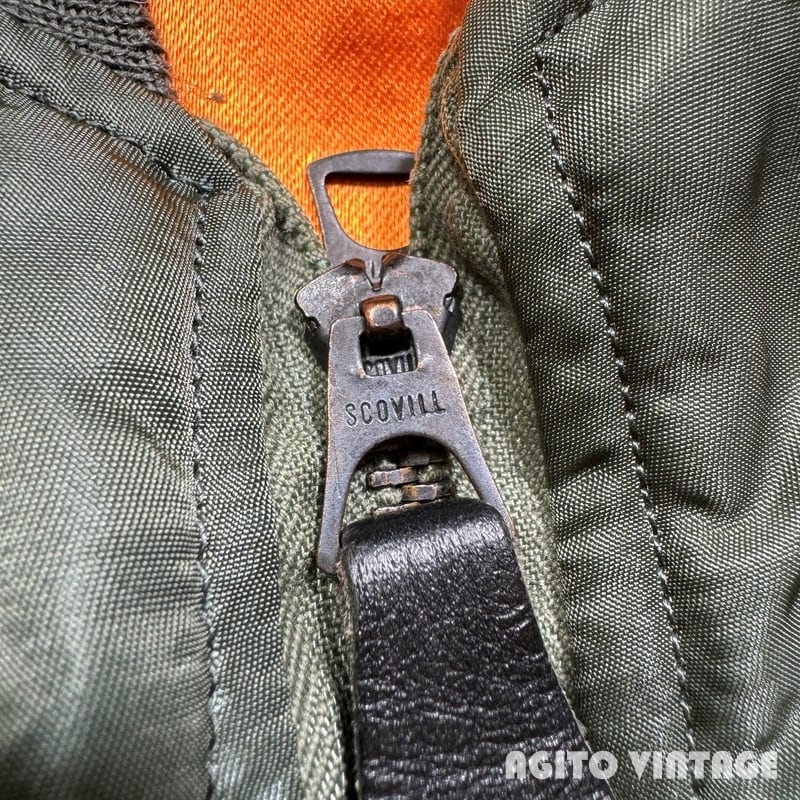 60年代のUSAF L-2Bフライトジャケットです。DSA100-69-C-0176、コントラクターはALPHA INDUSTRIES INC、MIL-J-7448H。フロントはSCOVILLジッパーが使用されています。ライニングはウールとレーヨン混のサテン地が使われています。各リブに虫食いの様やダメージが見られますが、ボディは薄汚れはあるもののダメージは無くコンディションは良好かと思います。内側のサテン地も綺麗ですが、肩付近にネームが手書きされています。MEDIUM表記です。MA-1と比べると中綿が入っていないのでごわつきは少なくすっきりとしたシルエットです。ミリタリーのライトアウターをお探しだった方は是非この機会にいかがでしょうか。