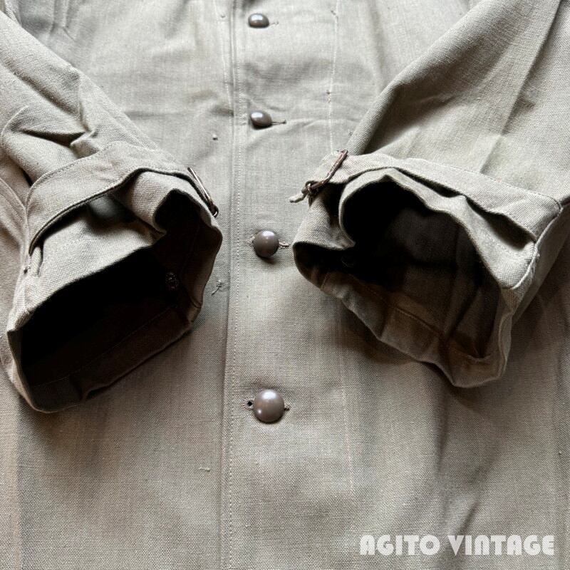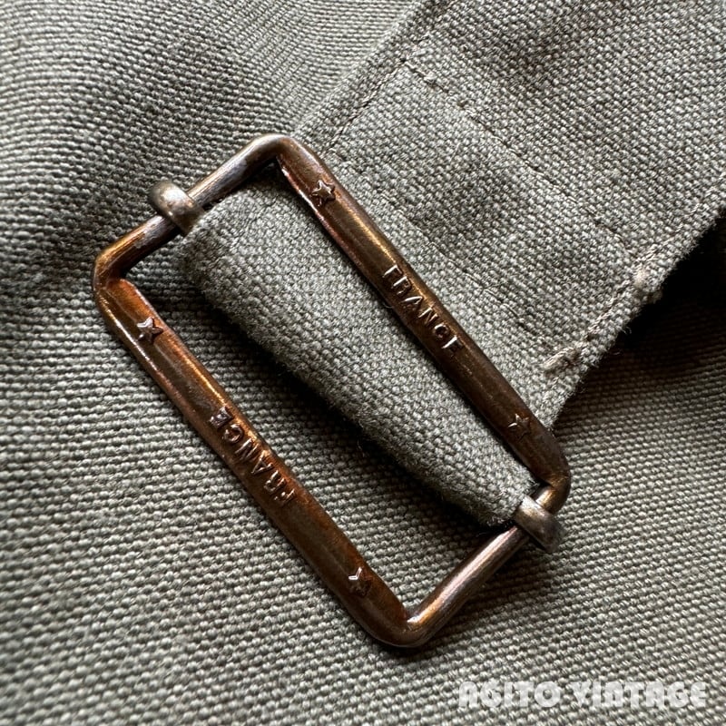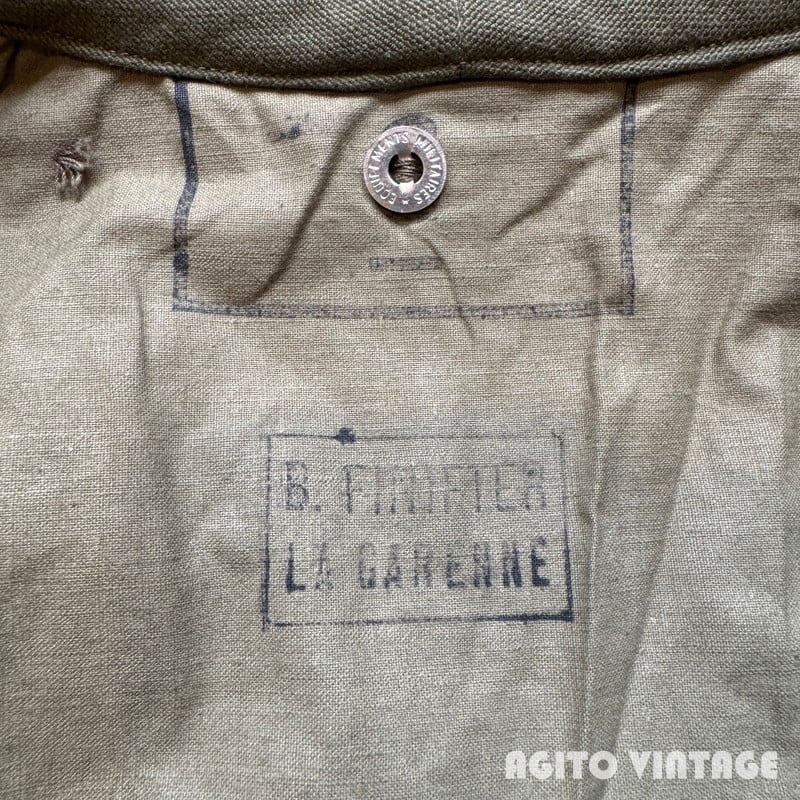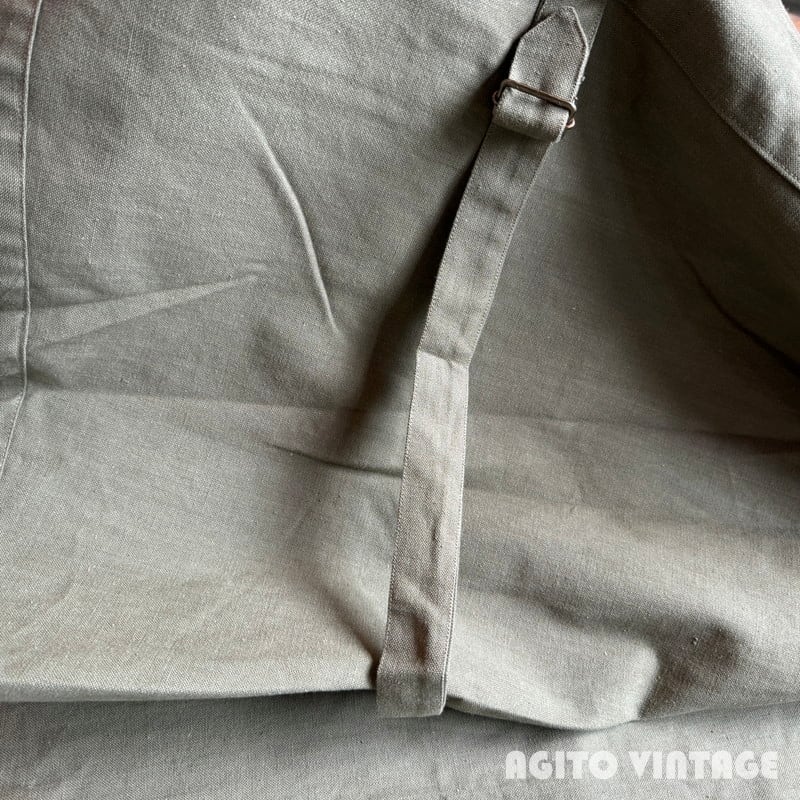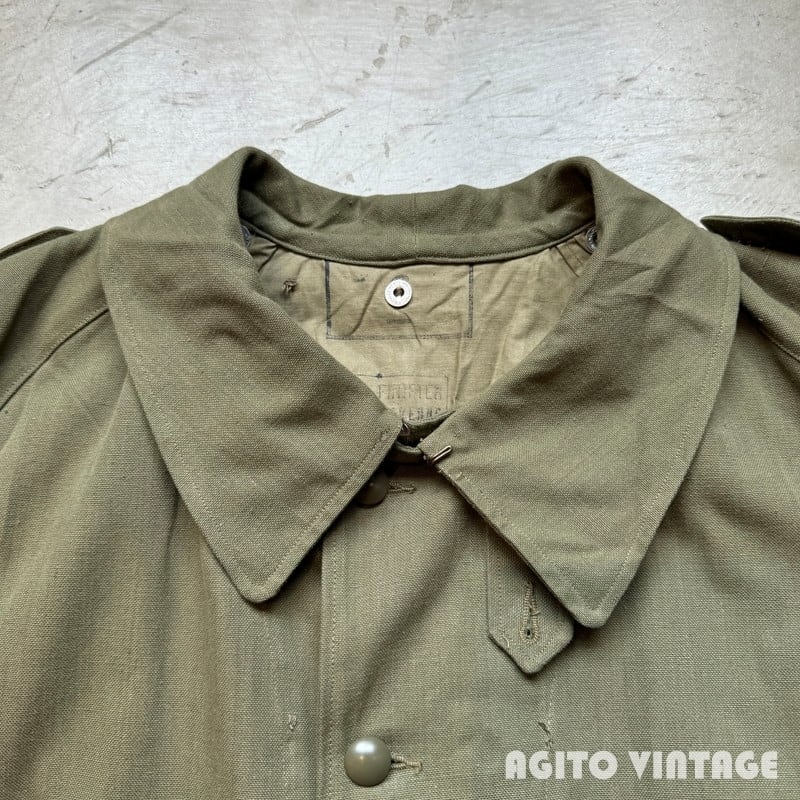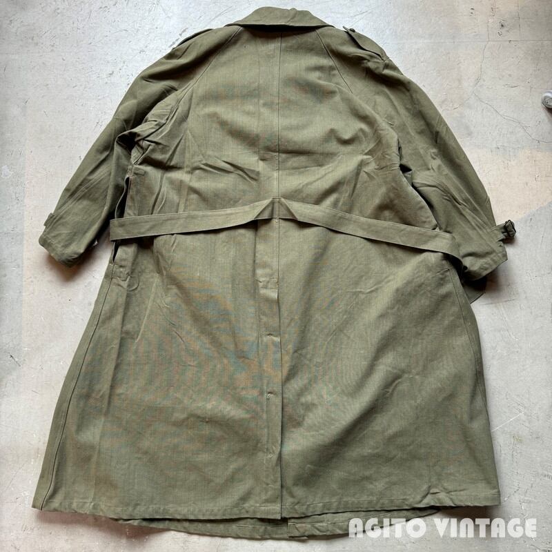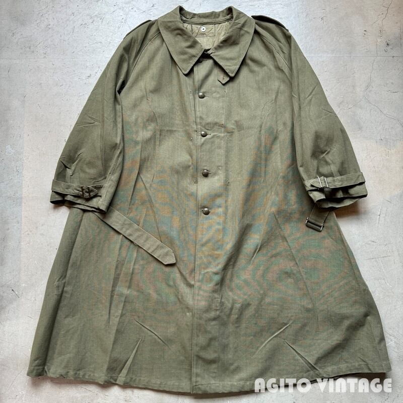 40年代から50年代頃のフランス軍モーターサイクルコートです。裾の広がったAラインのシルエットがとても綺麗で最近特に人気の高い1着です。大き目の襟裏にはチンストラップが付属し、ウエストにはストラップベルト、バックの裾はボタンで開閉できるようになっております。オーバーコートの為、ポケットは貫通式となっており、コートを脱がずに内側の物を取り出せます。内側にはバイク乗車時に裾をばたつかせない為のストラップもございます。今回のこちらは表記が6でXL相当のゆったりとしたサイズ感です。長期保管によるうっすらとしたシミ等ございますが、未洗いもしくはワンウォッシュ程度のグッドコンディションです。襟を立てたり、ウエストをベルトで絞るとシルエットも変わり色々な着方が楽しめます。今回は久しぶりにゆったりサイズなのでサイズでお探しだった方は是非この機会にいかがでしょうか。