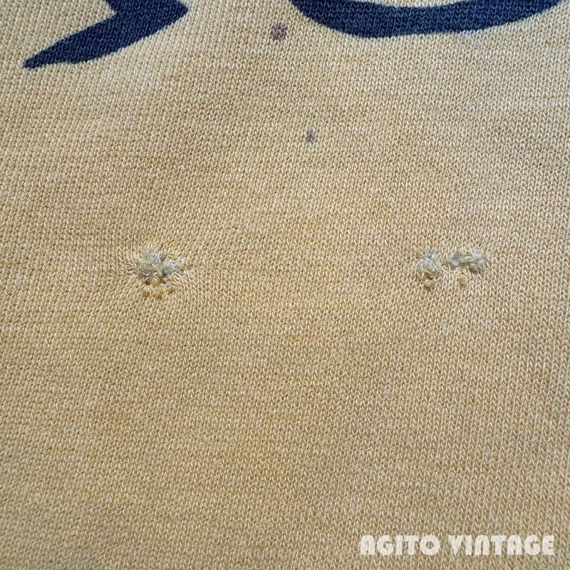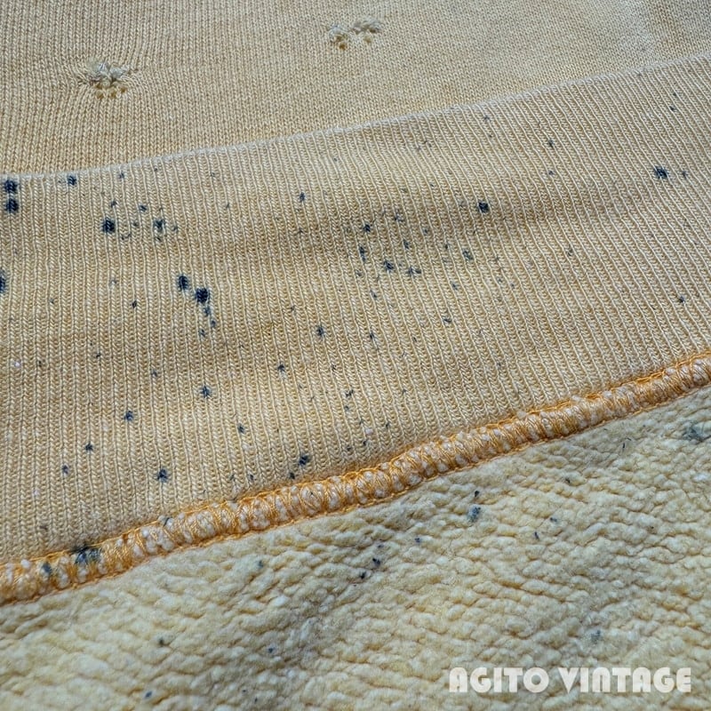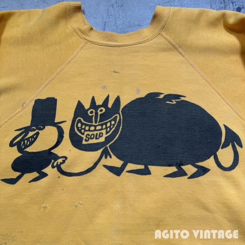 60年代頃のKQED Auction ”Phred and Qued”染込みラグランスウェットです。タグが欠損しておりますのでボディブランドは不明です。ご紹介するこちらは、1953年にサンフランシスコで設立されたKQEDというローカルTV局が1955年から放送していた「KQED TV AUCTION」という番組のマスコットキャラクター”Phred and Qued”が染み込みでプリントされた1着です。この”Phred(人物) and Qued(モンスター)”は1960年から登場しており、Phredの名前がついたのは登場から16年も後の事だったようです。襟と裾は2本針、その他は4本針で縫製されています。リブの長さは約6cmです。プリントは染み込みです。全体的に使用感があり、小穴やダメージ、リペアがございます。薄汚れやインク染みのような汚れも見られます。身幅は60cmオーバーで、サイズタグがあるとすればL~表記だったのではないでしょうか。同じような番組系でAMラジオ局のKISN GOOD GUYというプリントが入るスウェットが有名ですが、こちらのKQEDの方がはるかに珍しいかと思います。デザインもサイズも申し分ないコレクターズアイテムだと思います。山吹色のような良いカラーです。お探しだった方は是非いかがでしょうか。