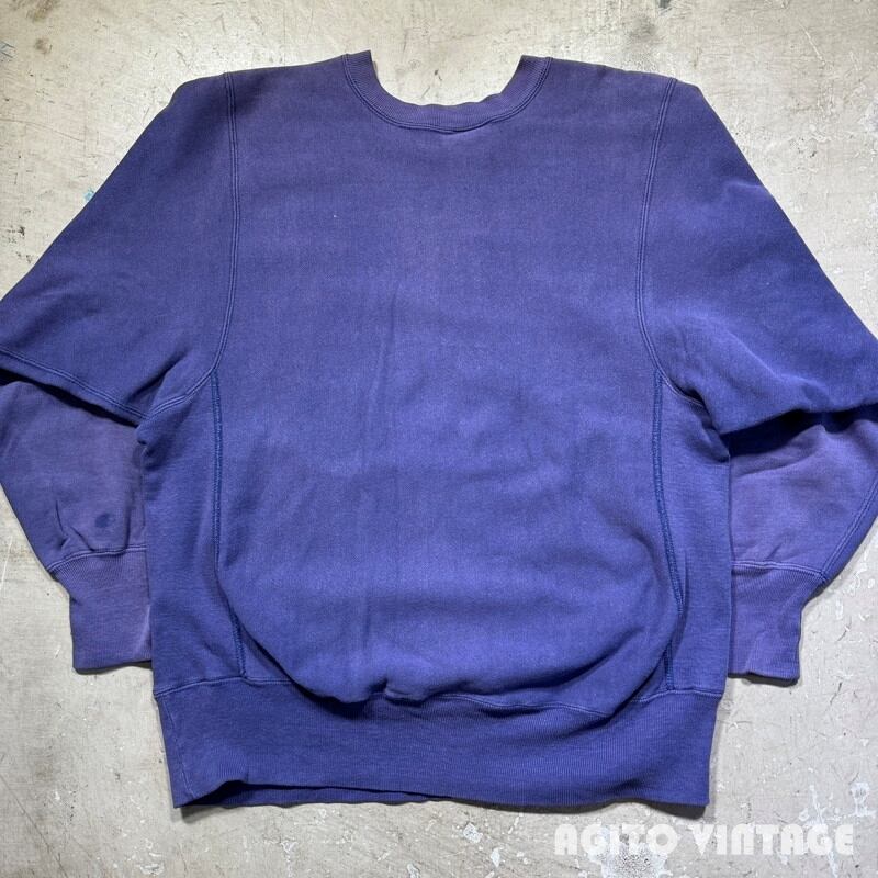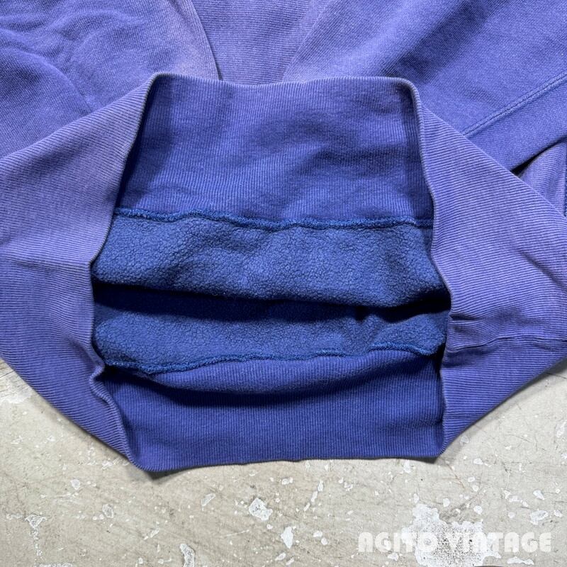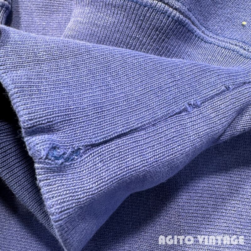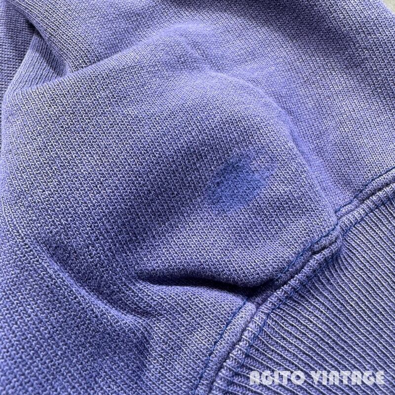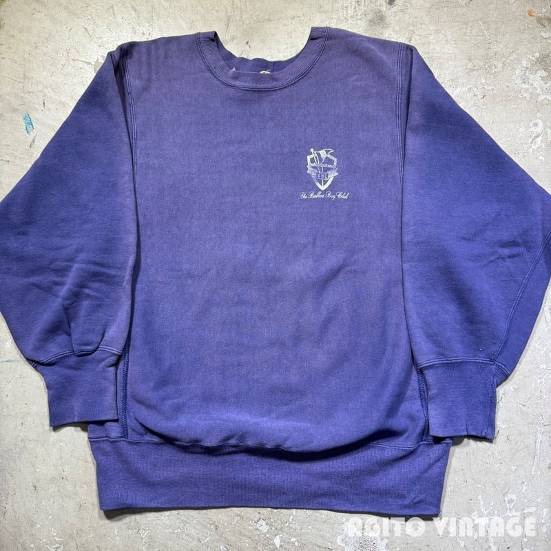 80年代のChampionリバースウィーブスウェットです。トリコタグが付くこちらは元々濃いネイビーだった物が経年によりナス紺へと褪色した雰囲気のある1着です。左胸にはカリフォルニア州ニューポートビーチにある会員制リゾートクラブのThe Balboa Bay Clubのプリントが入ります。左袖のCマークのロゴは欠損しています。首リブに小さなピンホールがあり、左袖リブに小さなハンドリペアがございます。その他酷いダメージ等は無くフェードしたボディとしてはコンディションhあ両校かと思います。MEDIUMですので男女共に着用しやすいサイズ感かと思います。カレッジやスーベニアなど様々なプリントがあるリバースですが、リゾートクラブのプリントは比較的珍しいかと思います。サイズが合う方は是非いかがでしょうか。