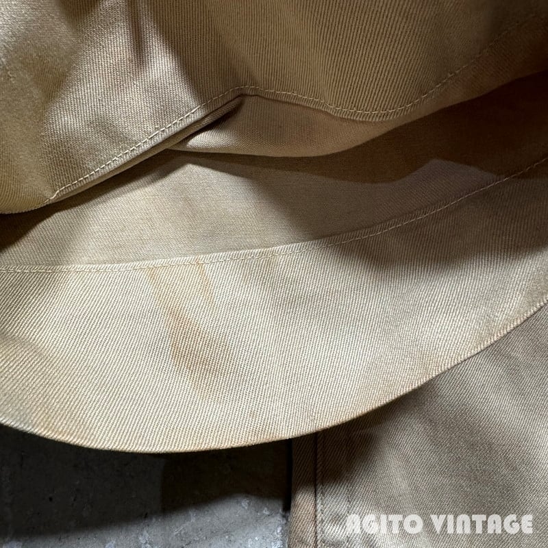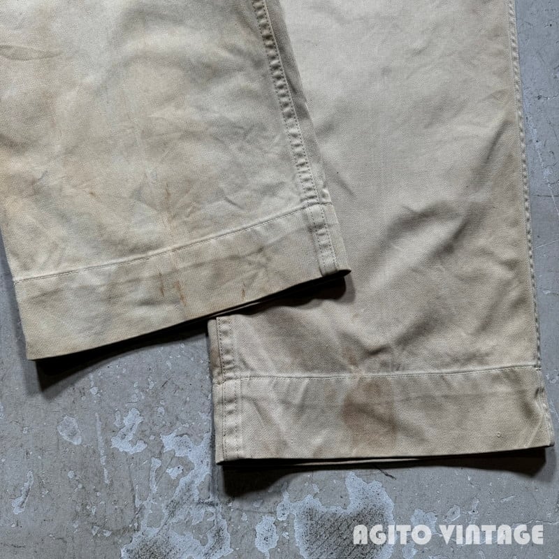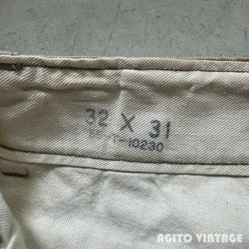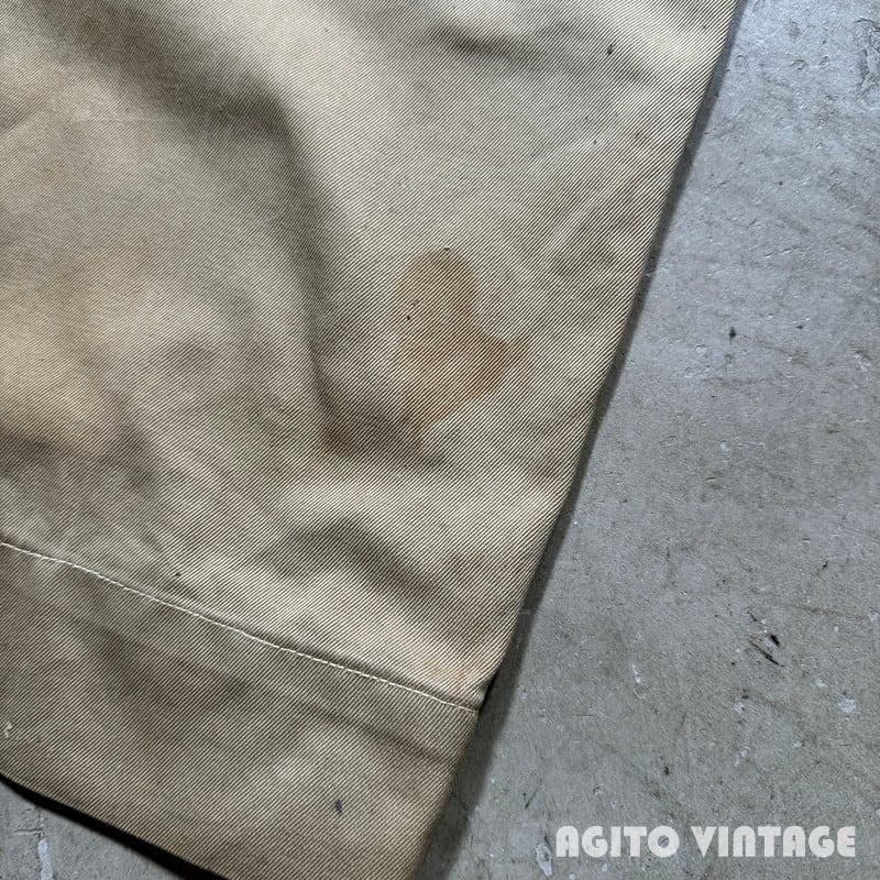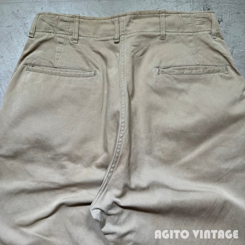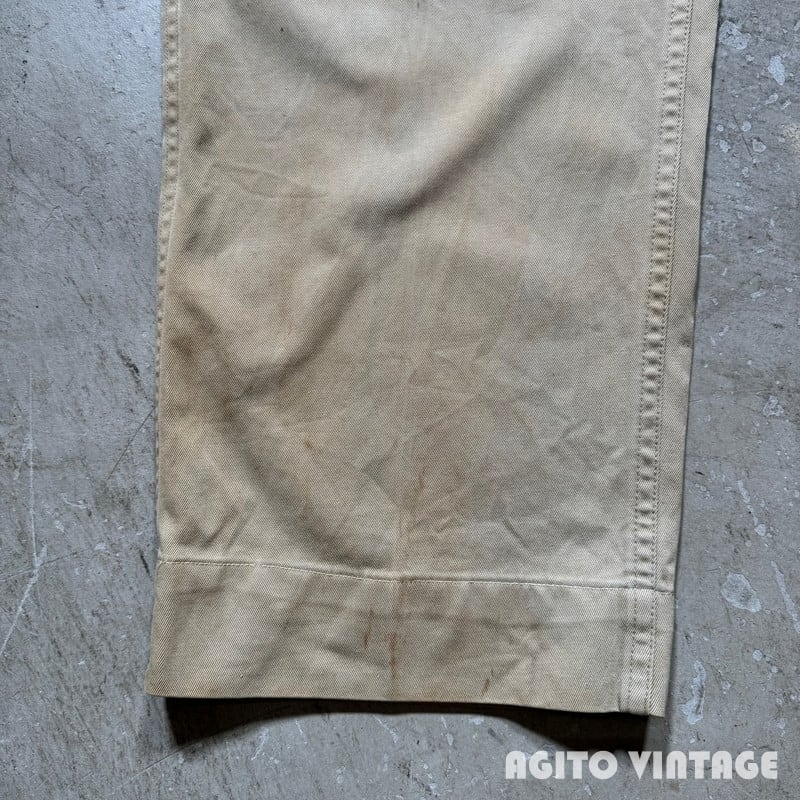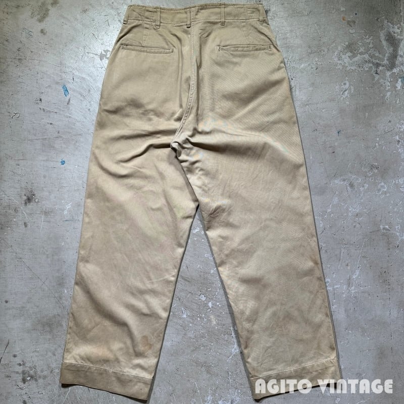 40年代のU.S.ARMY 45KHAKI チノトラウザーズです。M-1941、M1943に続き人気の高いヴィンテージチノとして知られるこちらは、フロント尿素ボタン、片玉縁のコインポケットとバックポケット、斜めのフロントポケット、アウトシーム、インシームなどはダブルステッチです。スレーキスタンプは6-254A、コントラクターはT.S.LANKFORD&SONSです。ベルトループは細いタイプでオフセット仕様です。トップボタン下部にやや欠けがあり、全体的に薄汚れやシミのような箇所が見られますが大きなダメージやリペア等は無く状態は良好です。レングスは裾上げされていますが長さは充分残っています。ウエストは表記W32インチで縮みはほとんどございません。古いミリタリーチノをお探しだった方は是非この機会にいかがでしょうか。