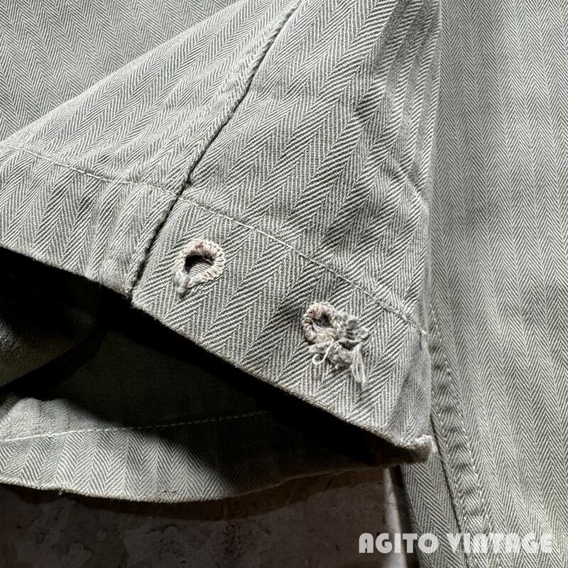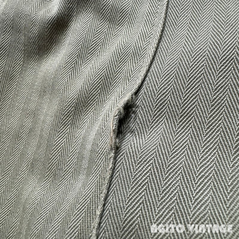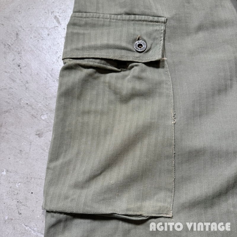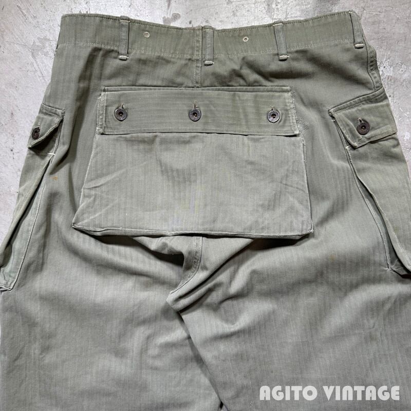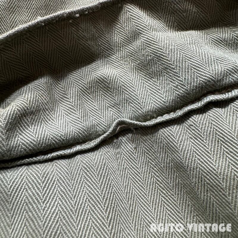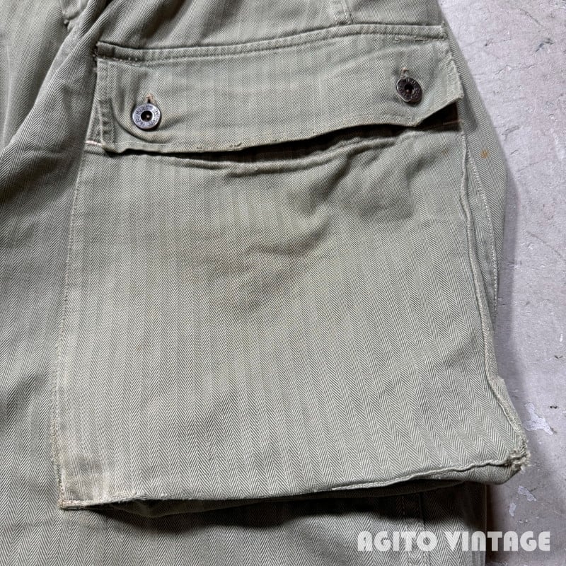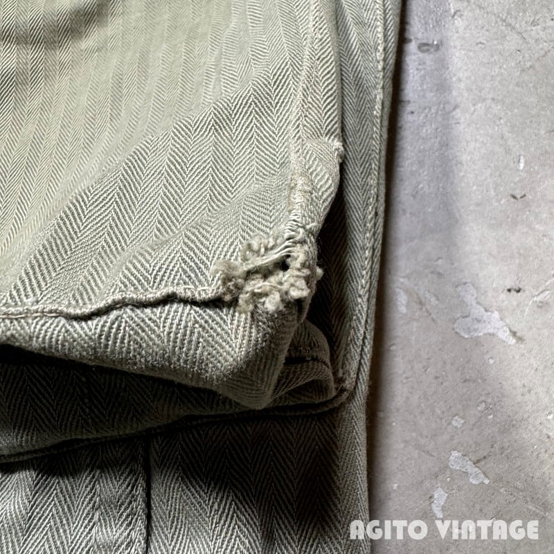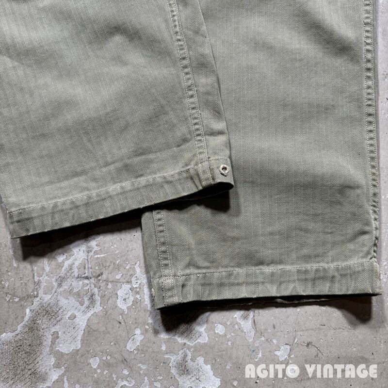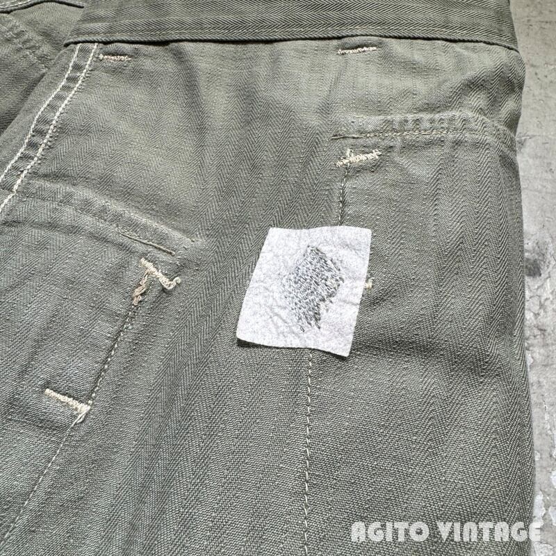 40年代のUSMC P-44 HBTトラウザーズです。第二次世界大戦時の1944年~1945年の僅か1年程の製造期間で、少数精鋭のUSMCですので珠数自体も少なくミリタリートラウザーズの中では知名度とレアリティーの高さは群を抜いたスペシャルピースとされています。ボタンは全てUSMCの浮彫ドーナツボタンが使用されています。ガスフラップも欠損無く備わっています。ウエストには吊り式のサスペンダーを通す菊穴があり、裾にもドローコードを通す菊穴がございます。サイドのカーゴポケットとバックのヒップポケットがこのP-44の最大の特といえます。右膝とヒップポケットの右縁にリペアがございます。左カーゴポケットの右角には擦れによる小ダメージがございます。右カーゴポケット側面と左カーゴポケット底面のステッチに一部飛びが見られます。その他裾等に擦れ等がございますが、生地自体は非常にしっかりとしておりますので長く愛用していただけます。ウエストは実寸W35インチで素晴らしいサイズ感です。レングスがオリジナルという点も加えて素晴らしい個体です。珠数の少なさから年々出会える頻度も激減しており、AGITO VINTAGEでは初の入荷となりました。今後の入荷は本当に難しいと断言できるスペシャルなアイテムです。サイズ感も踏まえお探しだった方は是非この機会をお見逃しなく。