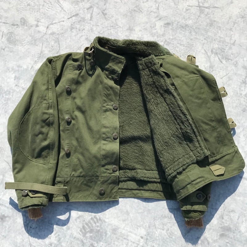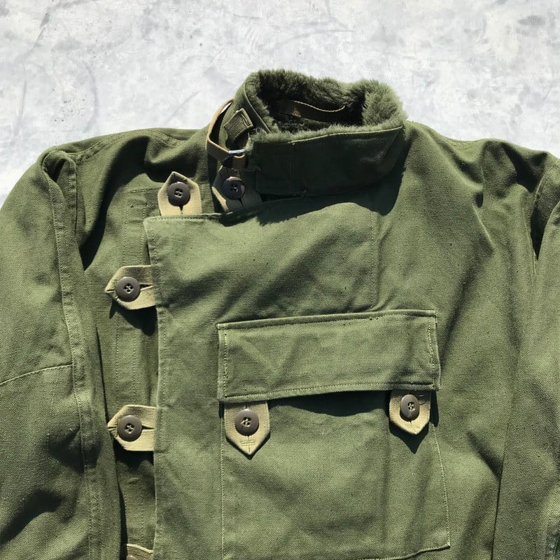 60年代の希少なスウェーデン軍モーターサイクルジャケットです。ダック地の退色も無くボタンホールのゴム伸びもございません。ライナー付きで、リブもしっかり残っています。多少のスレはございますが、ここまで状態の良い個体もなかなか見られないのではないでしょうか。サイズはC50で、日本のL~XL相当かと思われます。肩幅:約56cm 着丈:約63cm 身幅:約72cm 袖丈:約64cm 店舗管理番号RM278H BA-3
