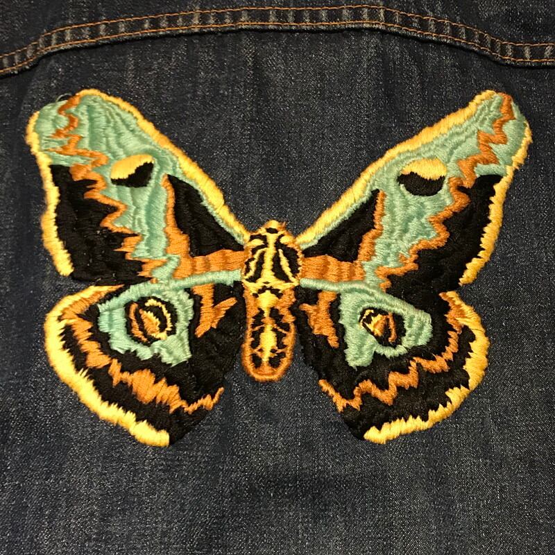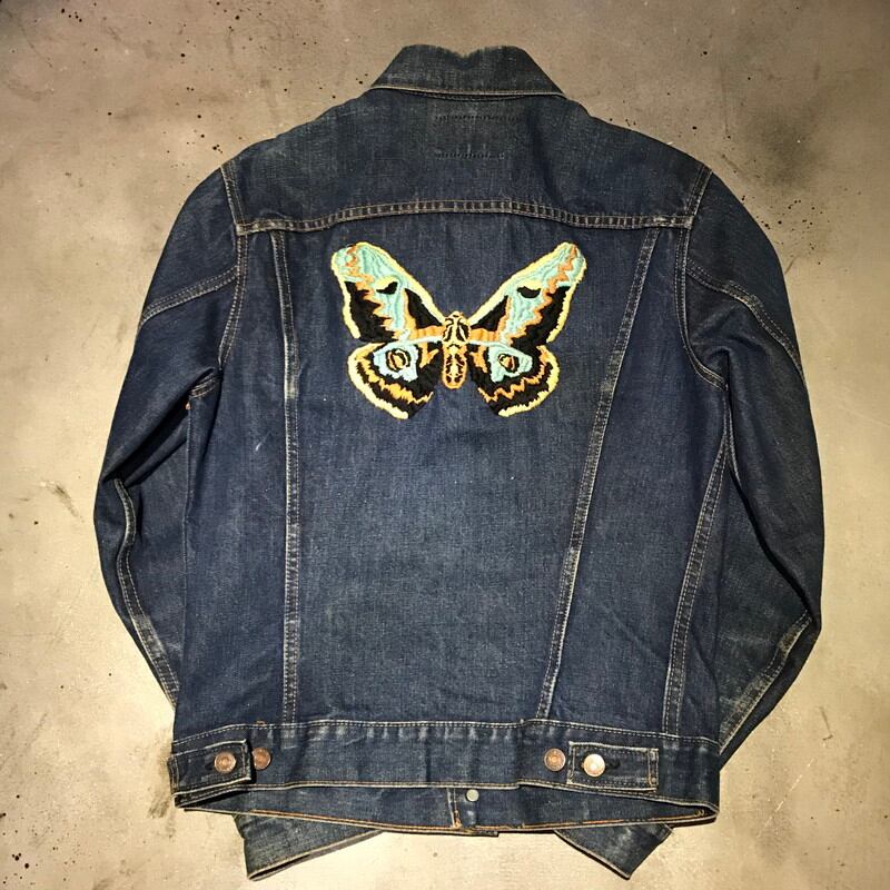 60年代後期から70年代初頭頃のリーバイス70505のギャラ無し、通称”4th”デニムジャケットです。ボタン裏刻印524、Big E、カンヌキ黒。背中の蛾(MOSS)の刺繍が奇抜で世界に1着のコレクタブルなアイテムです。