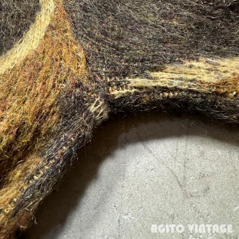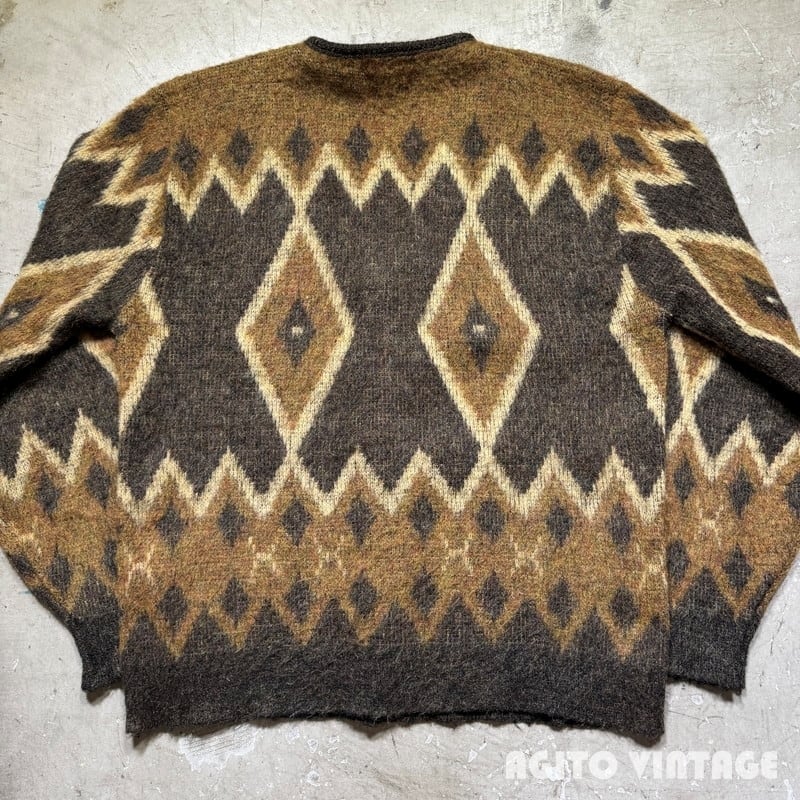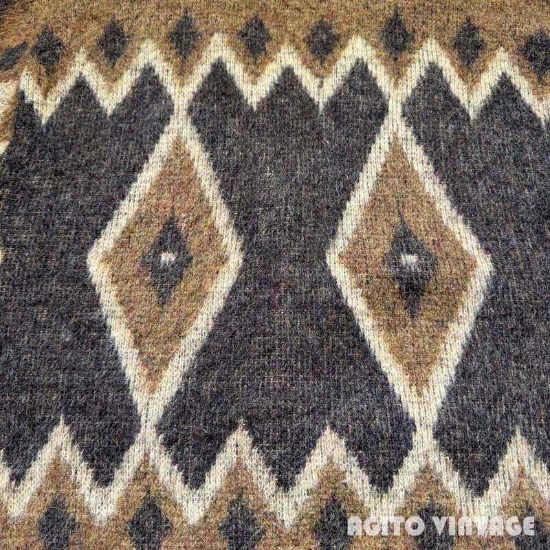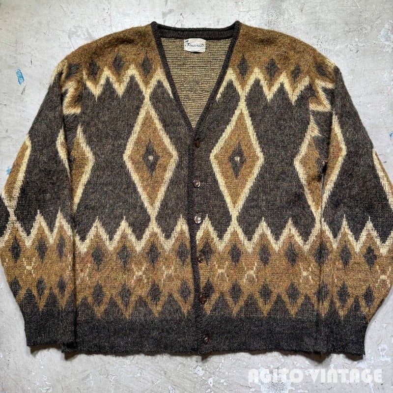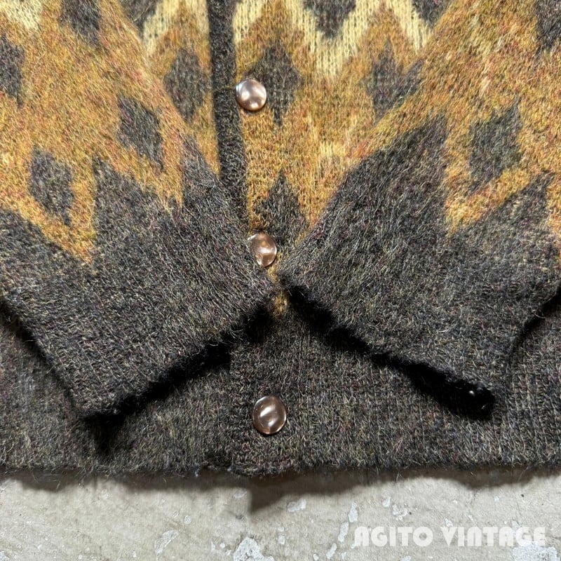 60年代頃のFinecraft モヘアニットカーディガンです。ブランドの詳細は不明です。モヘア40%、ウール40%、ナイロン20%の混紡です。ダイアモチーフの柄で構成されています。黄土色とブラウンベースのダークグリーンのような色味です。フロントは光沢のあるボタンが全て揃っています。ポケットは付かない仕様Dannerす。全体的にやや毛羽立ちがあり、若干裾や袖先に撚れが見られます。脇下の生地が少し薄くなっていますが今のところ着用に問題いはなさそうです。その他一部モヘアが薄くなっている箇所が見られます。虫食いなどは特にございません。MEDIUM表記で少し縮みが入っているようなのでS~M相当といったところでしょうか。毛足はそこまで長くはありませんが、色味と柄のバランスも良いのでお好きな方も多いのではないでしょうか。フロントは閉めずにさらっと羽織るだけでも様になるアイテムですので古いモヘアカーディガンをお探しだった方は是非この機会にいかがでしょうか。