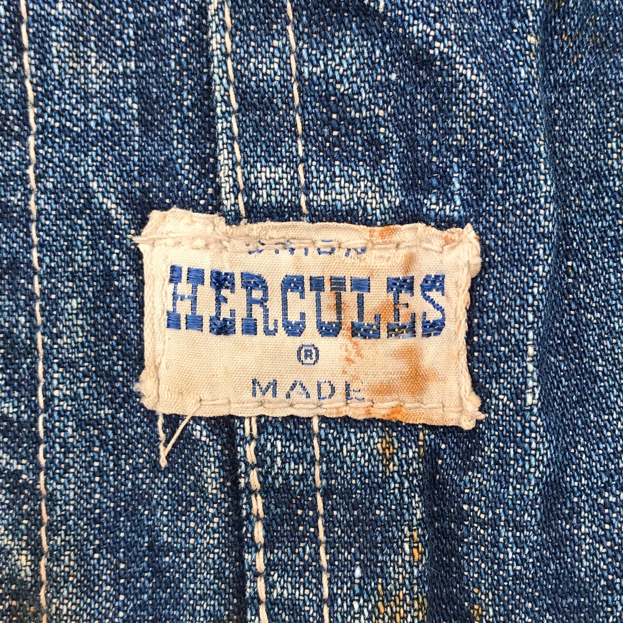 50's頃のHERCULES ヘラクレスのデニムカバーオールです。アメリカの3大ストアブランドで知られるSEARS ROEBUCKのワークウェアのラインで展開されていたのがヘラクレスです。経年による袖やポケットなどのアタリがヴィンテージならではとても雰囲気のある1着です。右胸ポケット内に印字は消えておりますがユニオンチケットと思われるタグも確認できます。右肩後ろにピンホールが3か所、左袖に5か所リペアございます。サイズはかなり大きいサイズですが袖丈はそこまで長くないので、ゆったり目にオーバーサイズでの着用もしやすいかと思われます。