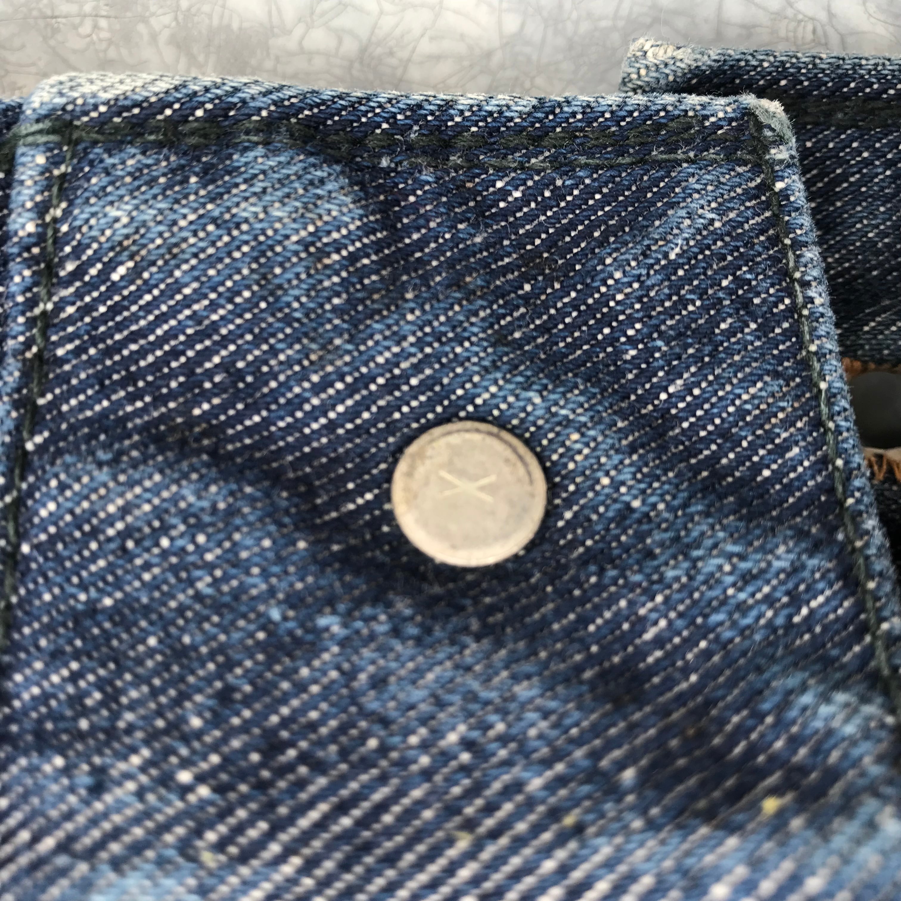 60's~70's頃のLee 101-Jデニムジャケットです。首タグには®とM.R.が表記されていますが、胸元のピスマークにはM.R.が無いタイプで、69年から70年くらいの移行期頃のモデルと推測されます。サイドのアジャスターは猫目ボタンを使用しています。裾や首回りにスレがございますが、まだまだ8割以上色も残っており、僅かに糊も残っています。かなり状態の良いGOODコンディションです。