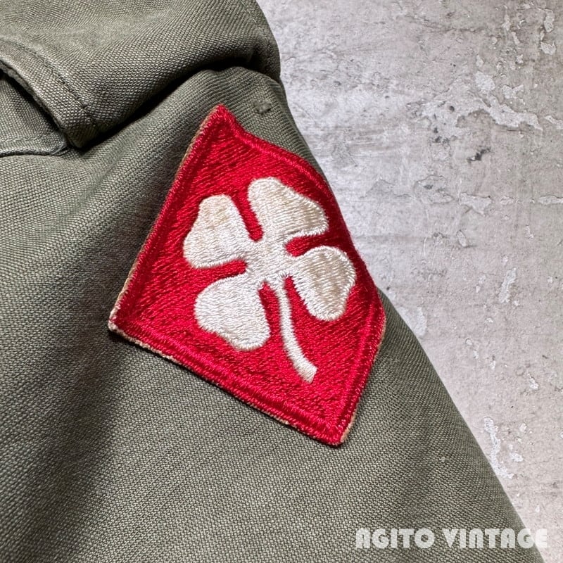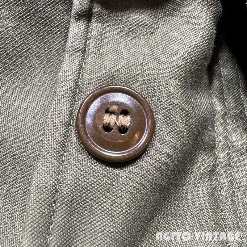 50年代のUSMC M-1951フィールドジャケットです。MIL-C-11448B、会計年度は1957年です。こちらは一般的にU.S.ARMYで支給されているフィールドジャケットと見た目はさほど変わりませんが、タグにはMARINE CORPS SUPPLY ACTIVITYというUSMC(海兵隊)への調達を行っていた発注機関が記されており、USMCの独自発注により製造も行っていたようです。生地感は通常のフィールドジャケットと同じだと思われます(もしかするとナイロンも使われているかもしれません)。元々両肩と両胸に部隊章などのワッペンが付いていたようですが、取り外られています。左肩には元のワッペンを取り外したのちにつけられたアメリカ第4軍のワッペンが付きます。全体的に薄汚れがあり、ワッペンを取り外した箇所にやや生地のダメージが見られます。袖先には擦れによる小さなダメージがございます。背面左肩付近に小さなダメージもございます。MEDIUM REGULARサイズで需要の高いサイズだと思います。あまり出ないUSMCのフィールドジャケットをお探しだった方は是非この機会にいかがでしょうか。