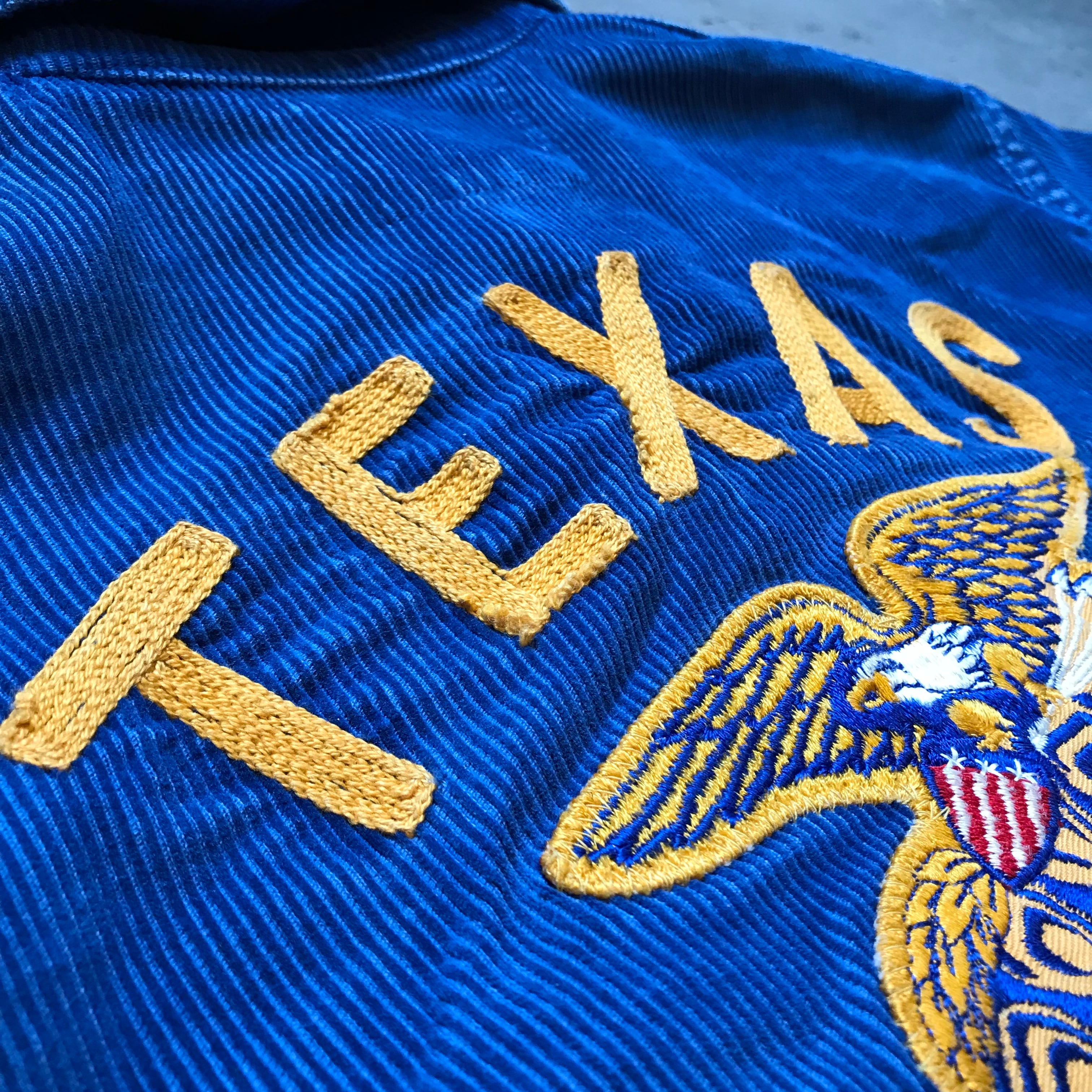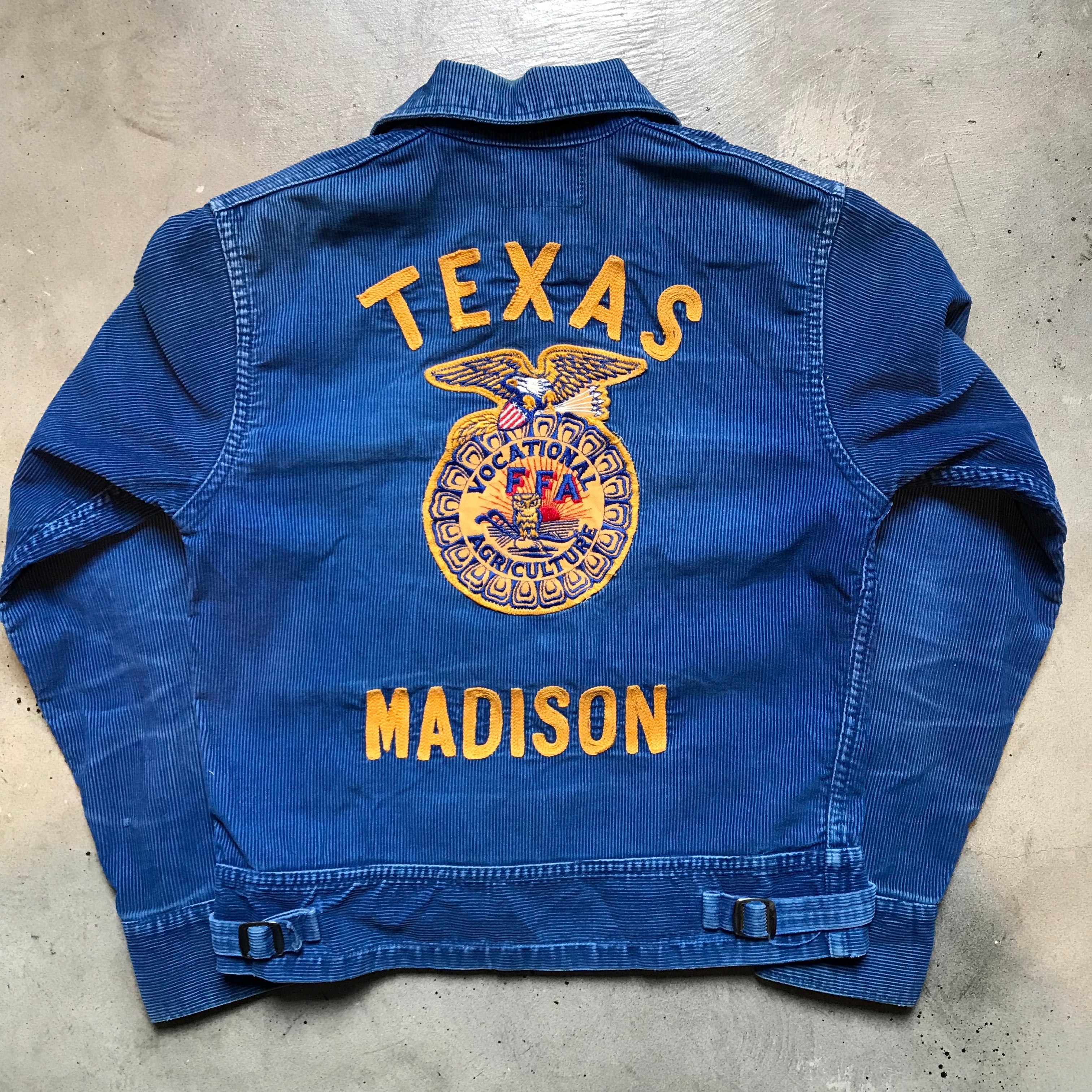 60's頃のFFA コーデュロイジャケットです。アメリカ国立農業学校のユニフォームジャケットとして有名ですが、アメカジ、古着好きには大変馴染みのあるアイテムといえます。ブルーコーデュロイに大振りなワッペン、チェーンステッチ等堪らないディティールの塊です。サイズは希少34と小さめサイズですので、女性の方にもおすすめです。首元に色落ち、両腕肘内側はハチノスと呼ばれるヒゲの色落ちが見事な1着です。左袖近くに1か所破れがございますが、着用に支障のない程度で、リペアも簡単にできる範囲ですのでお探しだった方は是非。