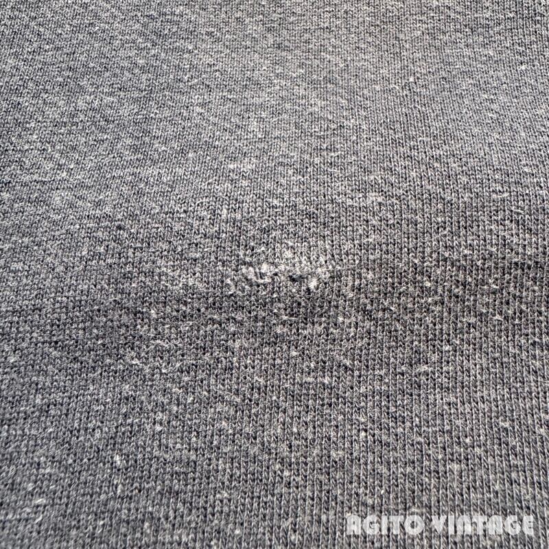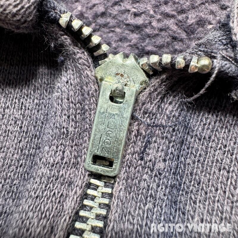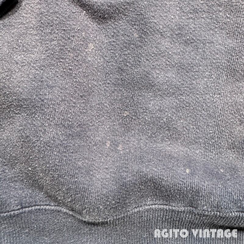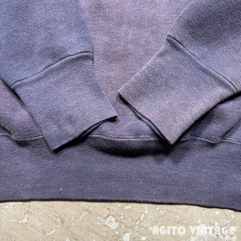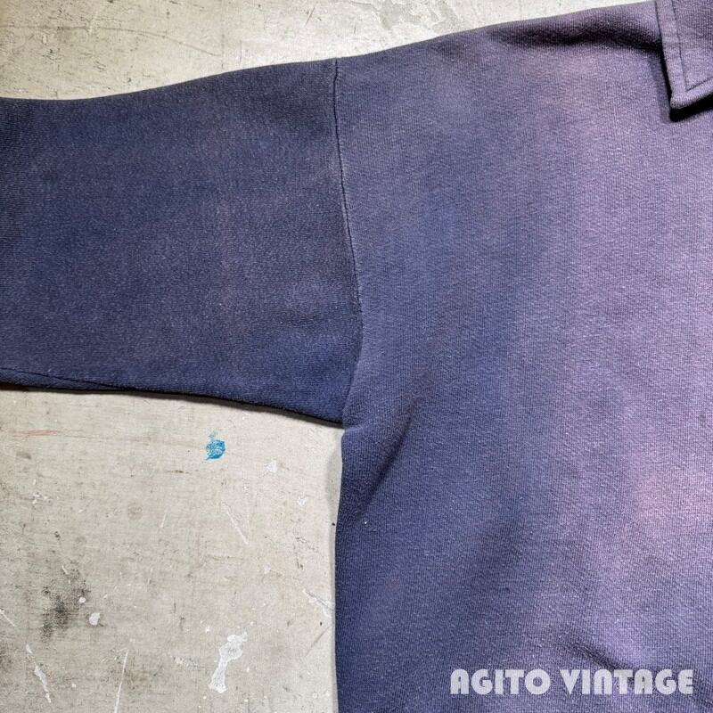 50年代から60年代初頭頃のUnknownハーフジップスウェットシャツです。タグが欠損していますのでボディーのメーカーは不明ですが、縫製の感じからPENNEY'Sかもしれません。胸元にプリントされているThe SKIWI SKI CLUBは1959年から活動している非営利団体で、スキーを中心としたさまざまな活動を行うスポーツクラブです。全体的にフェードが見られ所謂”ナス紺”と呼ばれるようなヴィンテージスウェットらしい面構えです。フロントはFALCONのアルミピンロックジッパーが使用されています。®裾リブ以外内縫いでリブはやや長めです。ヤケや毛羽立ちがあり、袖等に小さなシミ汚れが見られますがダメージは特にございません。タグが欠損していますが、身幅は60cm越えで表記があればXL相当はあるかと思います。フェード具合も良くデニムやミリタリーパンツとの相性は抜群です。大き目のハーフジップスウェットをお探しだった方は是非この機会にいかがでしょうか。