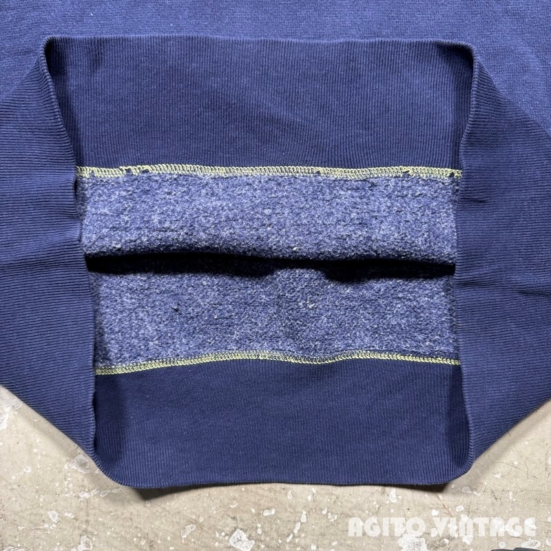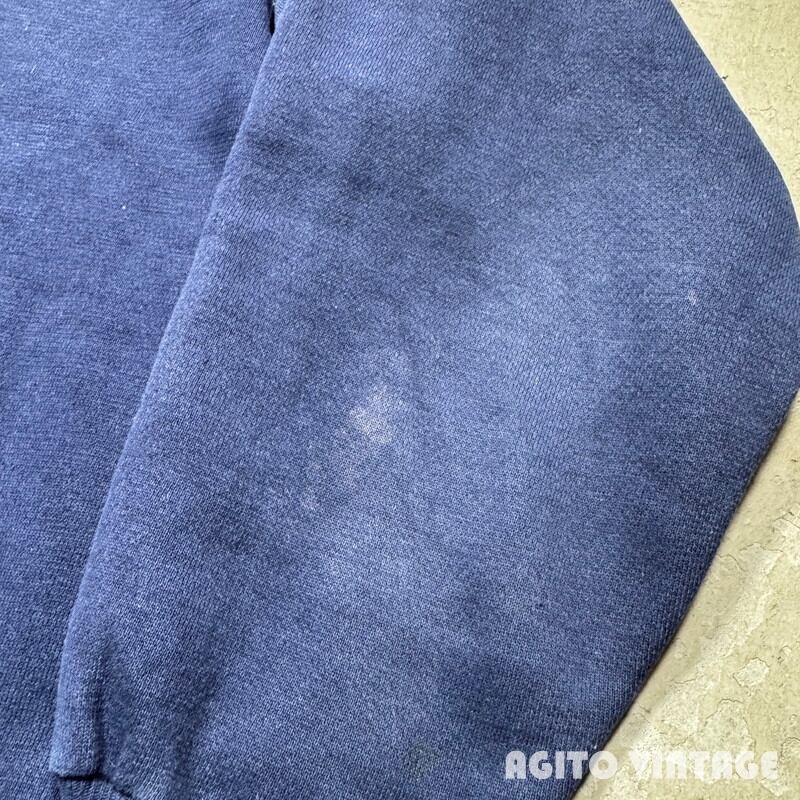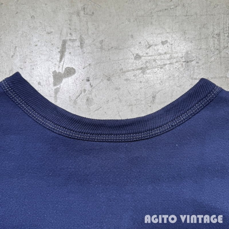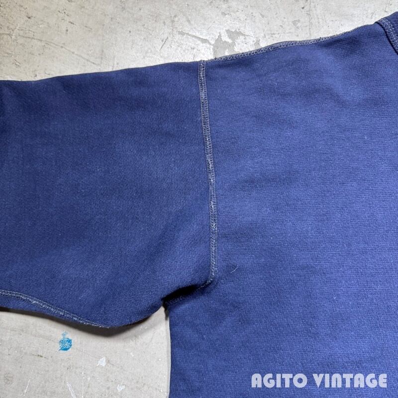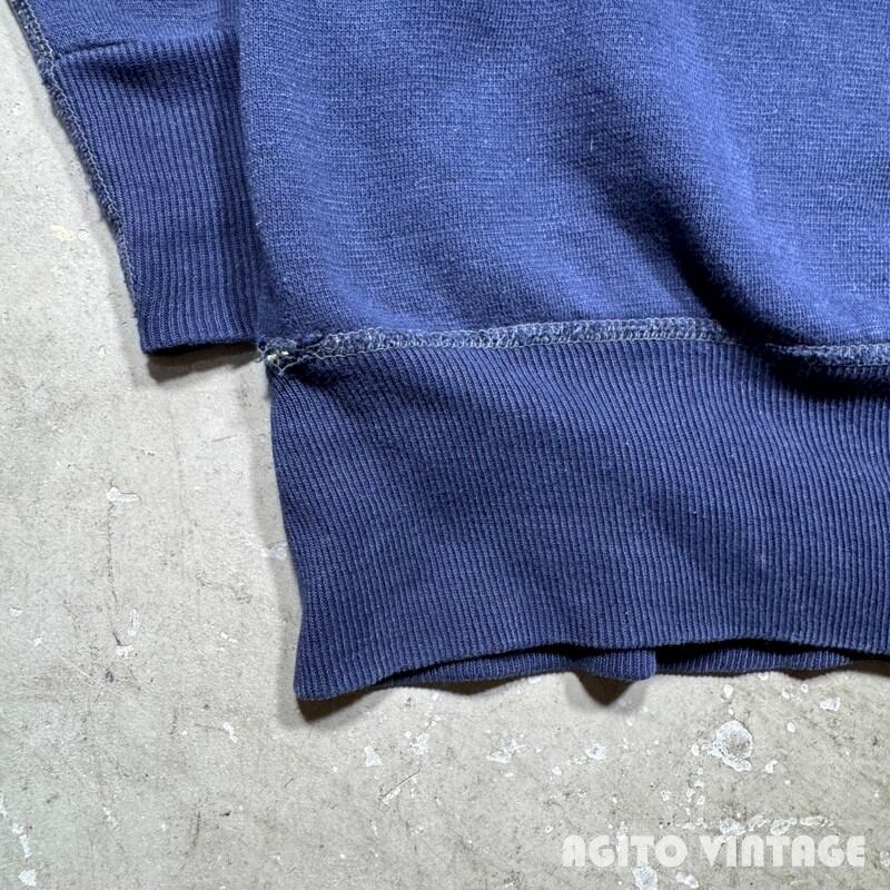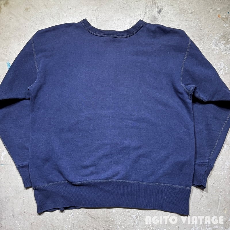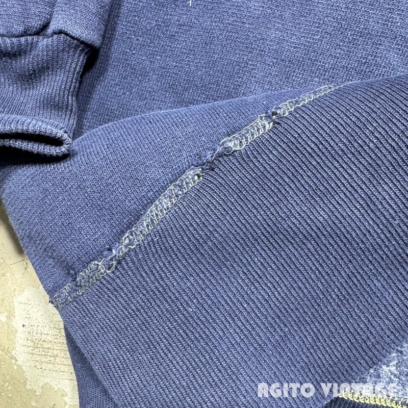 60年代頃のFRUIT OF THE LOOMセットインスリーブスウェットです。FRUIT OF THE LOOMは1851年にアメリカのロードアイランド州で綿生地を扱う会社として創業した老舗ブランドです。ご紹介するこちらは、無地のセットインスリーブで、首は3本針、その他袖先以外は4本針で縫製されています。生地は恐らくコットンポリの混紡です。裾リブの縫い目が裏面だけイエローがつかわれており表面の糸は他の箇所と同じようなので、こちらも元からこの仕様の様です。やや褪色はあるもののナス紺というほど色褪せはございません。裾リブの縫い目に一部ほつれやダメージが見らえます。袖等に薄汚れもございますが、ヴィンテージスウェットという観点からするとコンディションは悪くないかと思います。XL(46-48)表記で良いサイズ感です。無地ですのでコーディネートも選ばずオールマイティー使えますのでお勧めです。