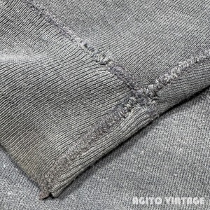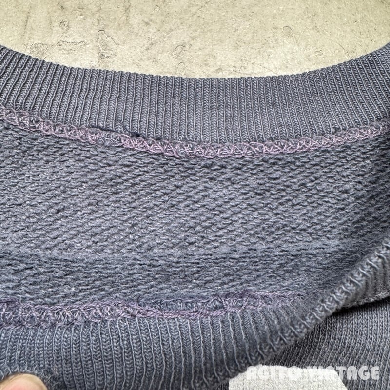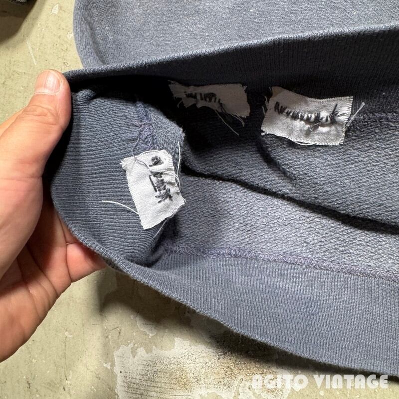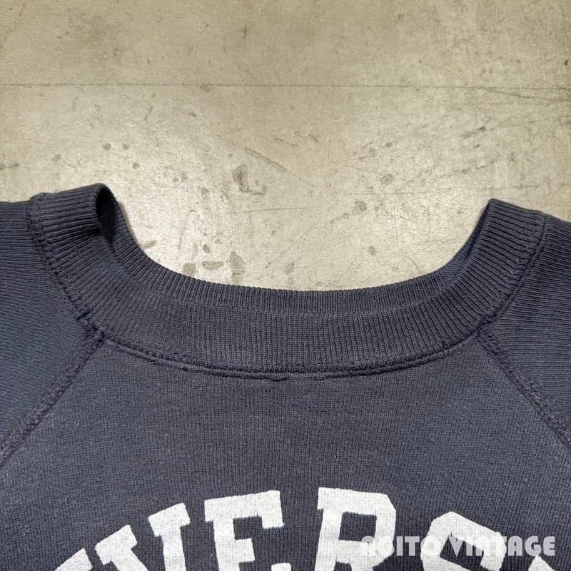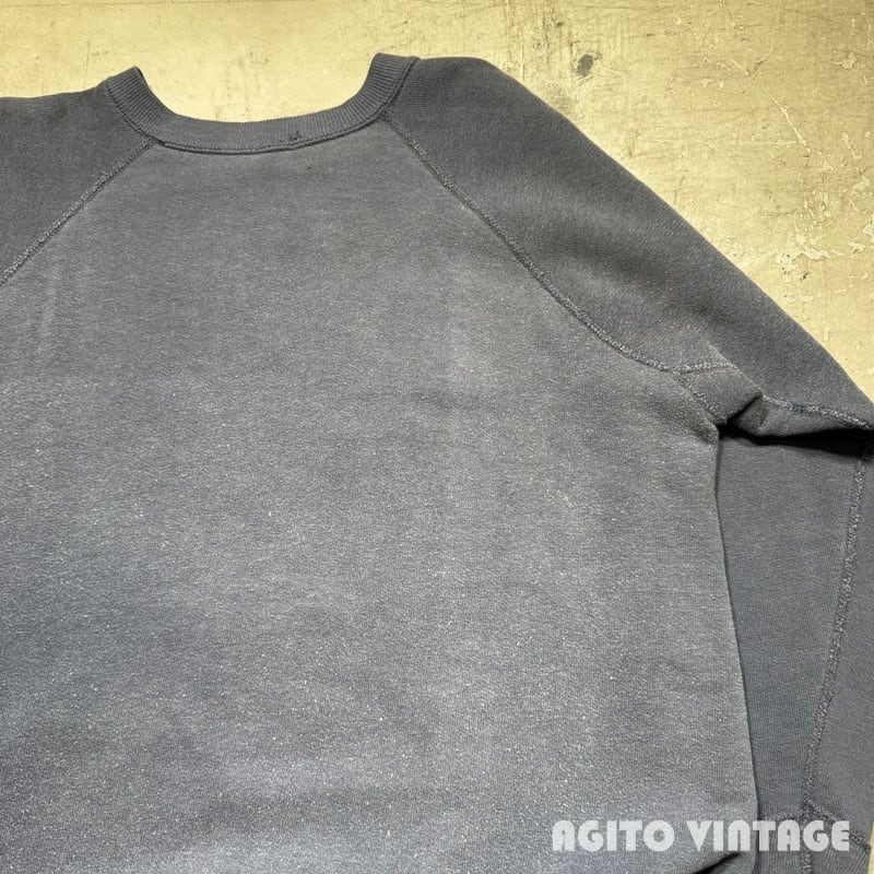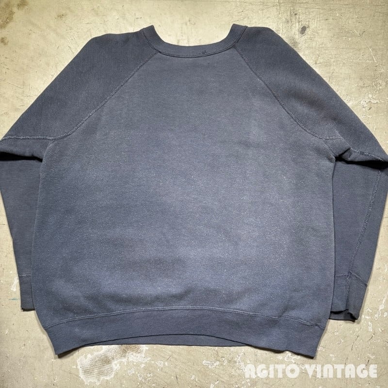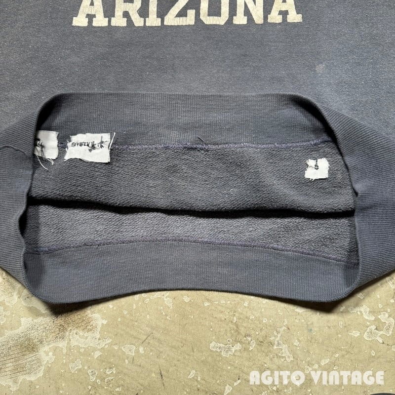 60年代頃のUnknownラグランスリーブカレッジスウェットです。タグ欠損の為ボディーメーカーは不明です。各リブ付け根は2本針、その他袖等は4本針で縫製されています。全体的に褪色が見られチャコールグレーのような色味です。フロントにはアリゾナ大学のプリントが施されています。脇下にはガゼットが付く仕様です。袖や裾リブの付け根にステッチ飛びや細かなダメージがありリペアがいくつかございます。フロント中央に畳みヤケもございます。毛羽立ち等の使用感もございますが、ヴィンテージスウェットらしい雰囲気が楽しめる1着です。タグは欠損していますが、表記があればこちらもL~XL相当の大き目サイズです。ナス紺とは違ったフェードグレーもコーディネートし易いのでお好きな方は是非この機会にいかがでしょうか。