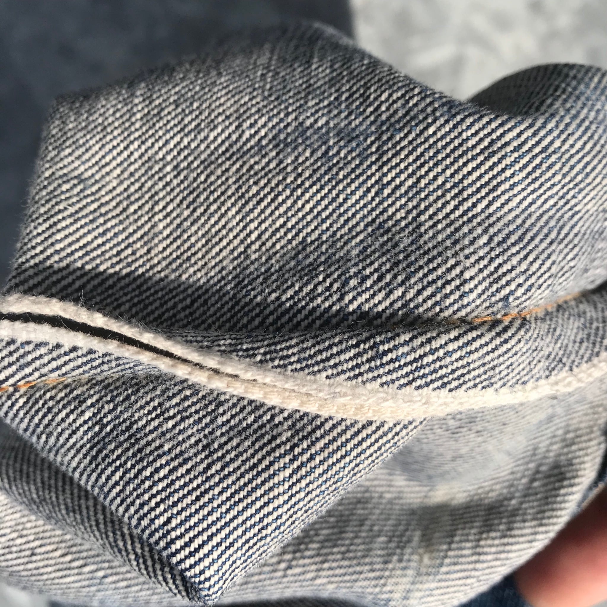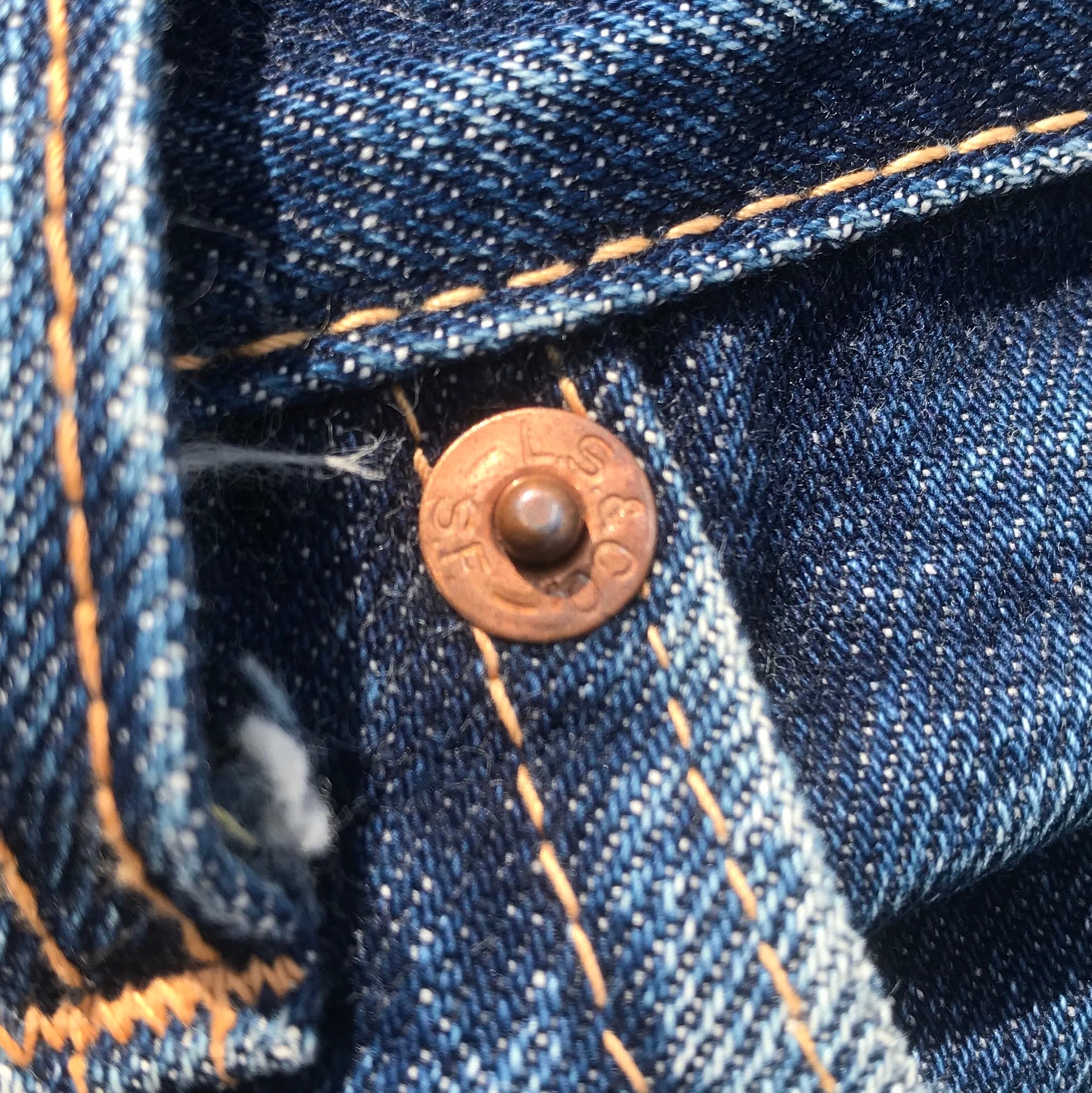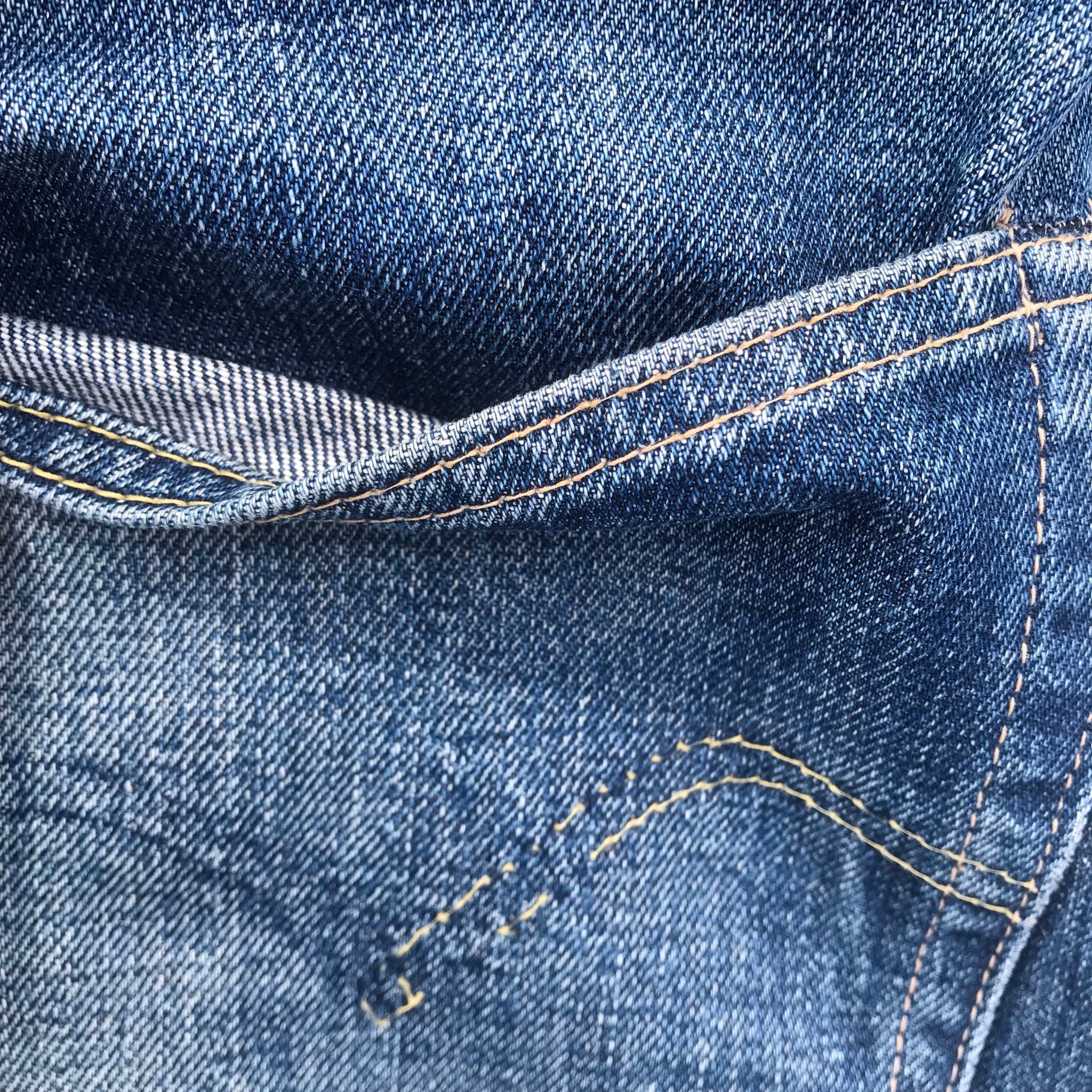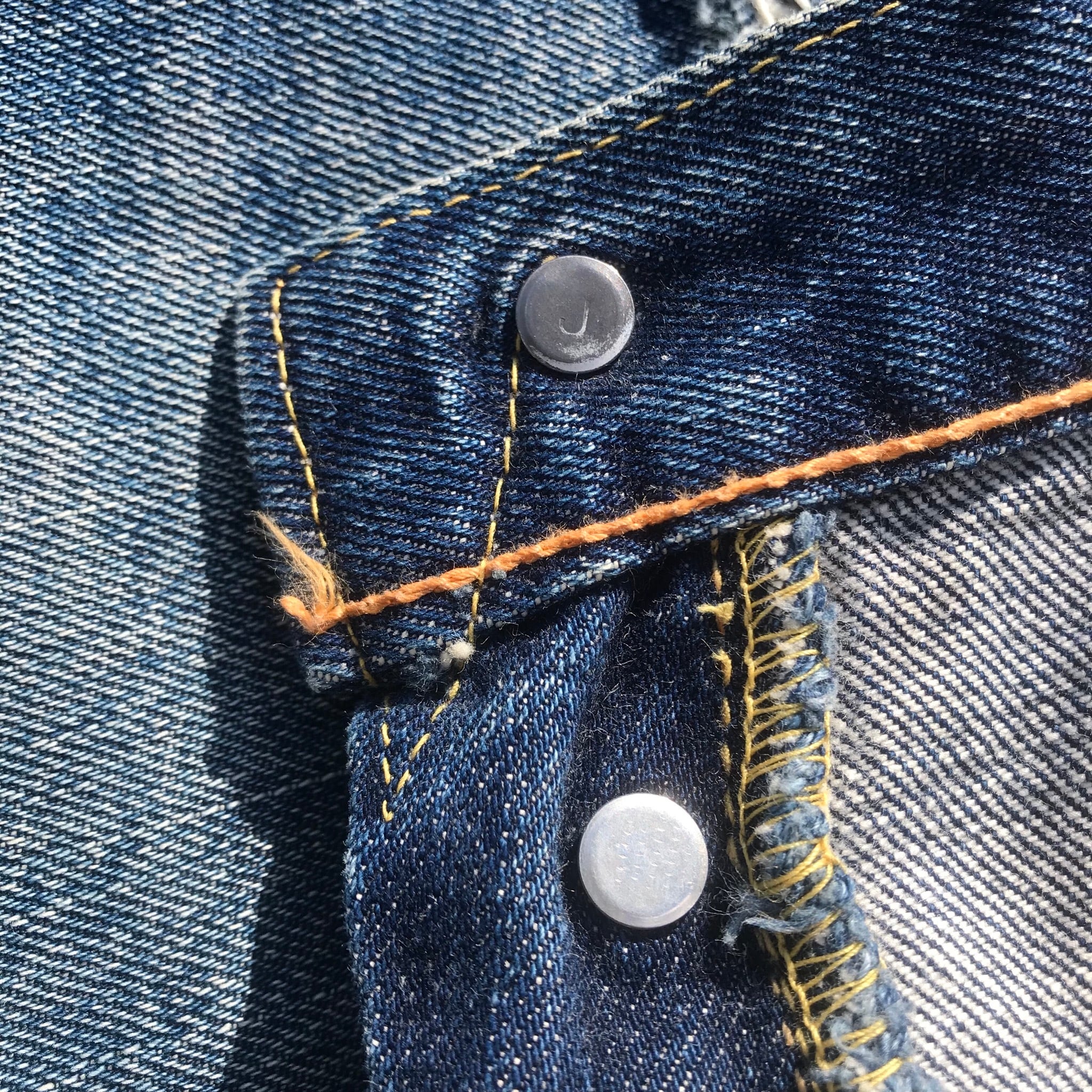 1960年代頃のリーバイス501 BIG Eモデルです。バックポケットシングル、ウエストシングル、Vステッチ、刻印J、隠しリベット無し、アルミリベット、足長R、コインポケット裏シングル、アウトシームシングル、BIG Eタブ(両面)、不均等V、股カンヌキ有、紙パッチ無し。右ポケットと、裾にダメージが有ります。全体の色落ちは素晴らしくヒゲやアタリもいい感じに入っております。ヴィンテージ好きには堪らない1本です。