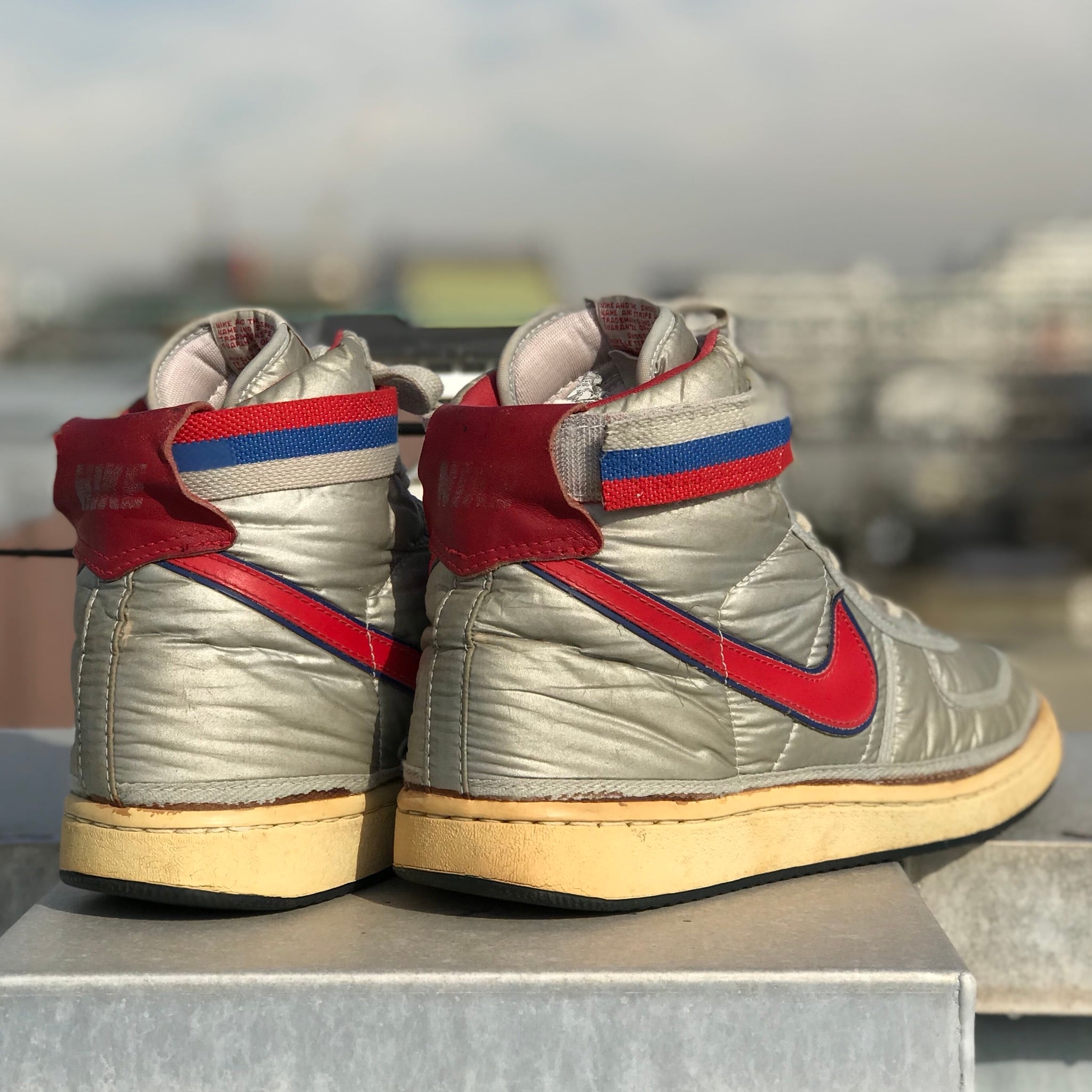 84年製NIKE VANDAL SUPREMEの希少なオリジナルです。人気のウルトラマンカラー。2002年と2008年に復刻さましたが、2002年番はオリジナルあまりにもかけ離れていました。2008年番はヴィンテージ加工でオリジナルに近い仕様のパラシュート生地での復刻でした。人気で価格もプレ値がつくほどでした。こちらは当時のオリジナルで、まさに初代バンダル。アンクルストラップの紛失も無く奇跡の入荷です。アンクルとヒールのスポンジに硬化がございますが、ソールはまだ硬化しきっていません。まさにコレクタブルな1足です。