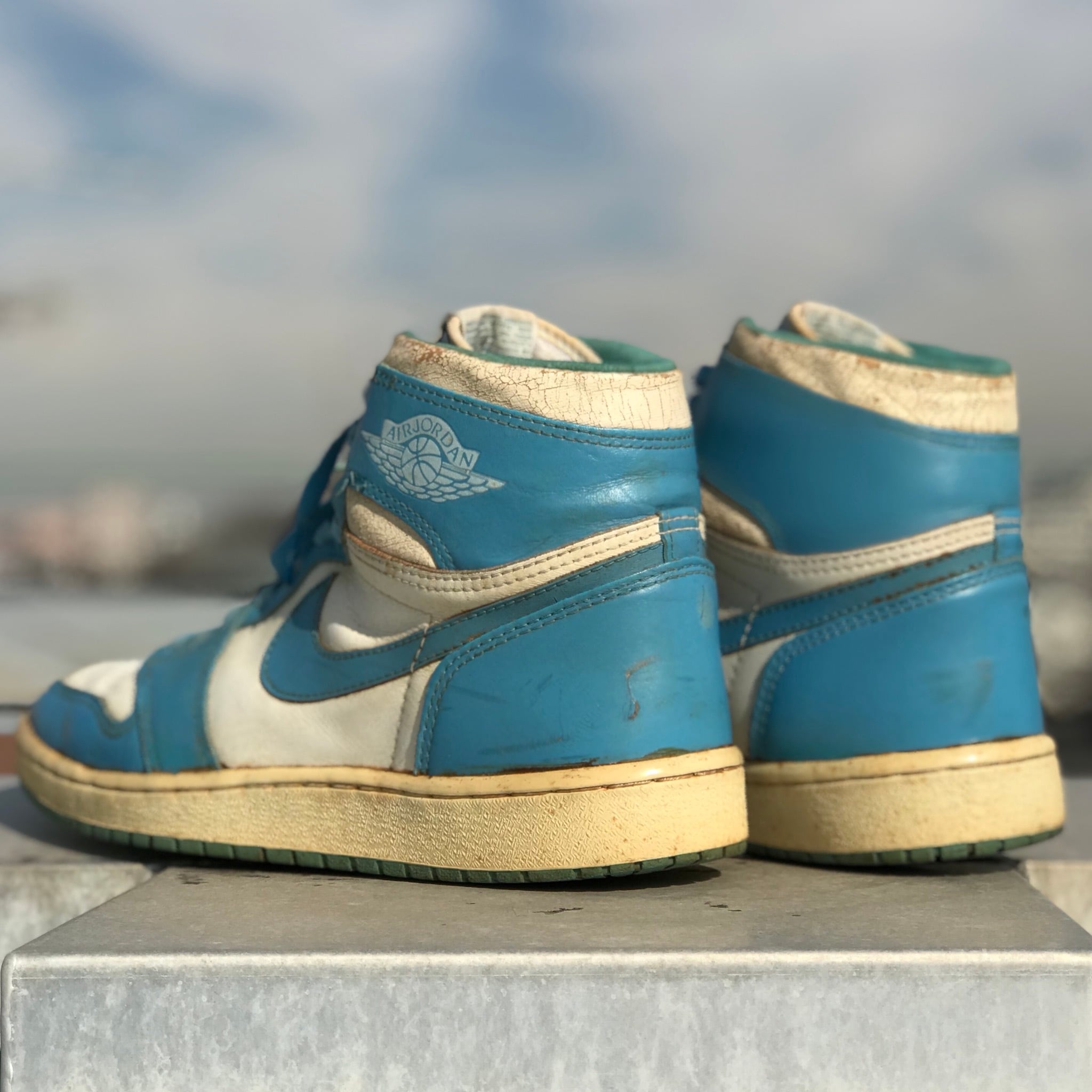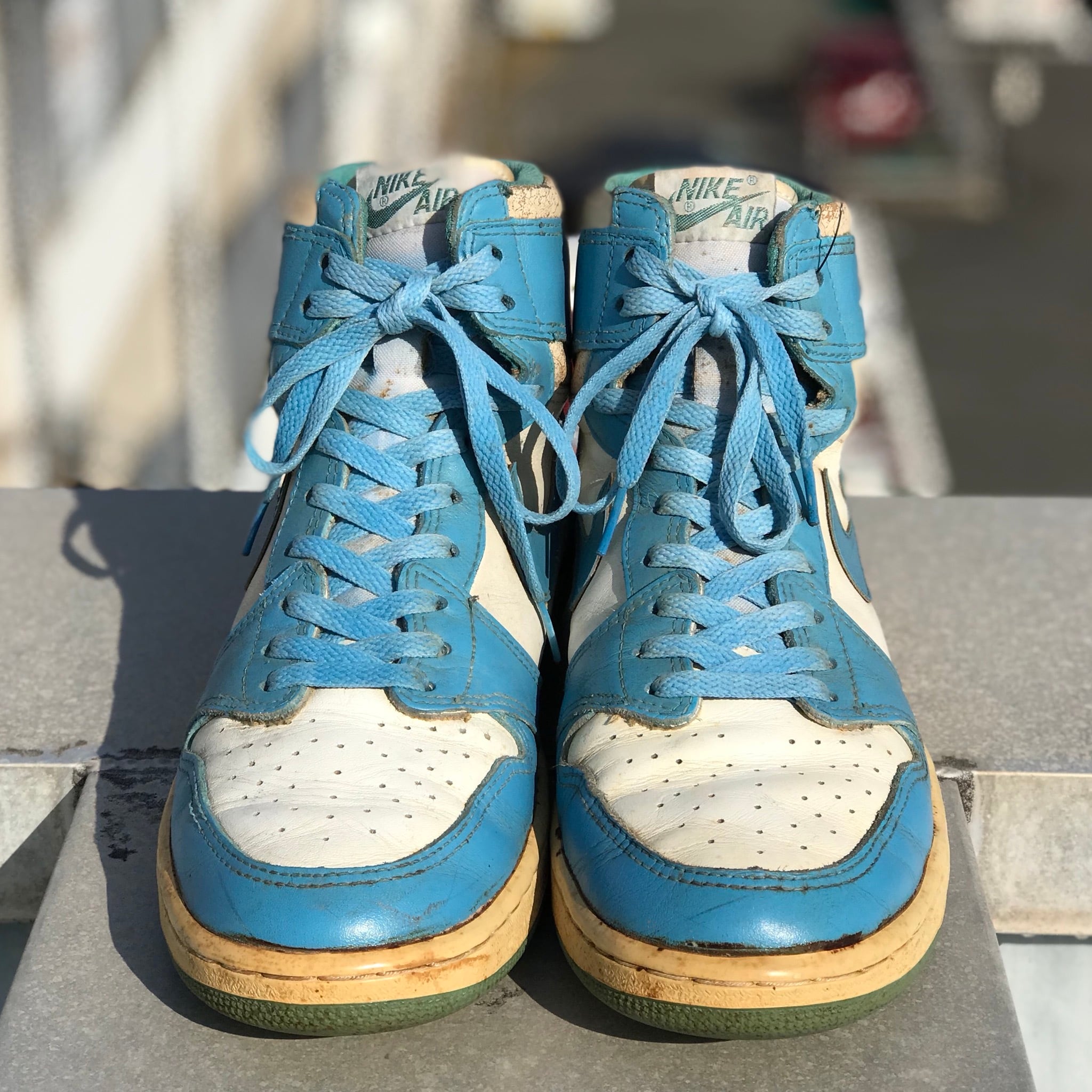 85年製のNIKE AIR JORDAN 1 ノースカロライナカラーです。85年製のオリジナルです。マイケルジョーダンの母校であるノースカロライナ大学チャペルヒル校のカロライナブルーと呼ばれる淡いブルーが特徴で人気のモデルです。アンクルとヒールカップのスポンジは硬化しており、ソールも硬化が始まっていますが、アッパーの状態も良く当時のオリジナルとしては非常に良いコンディションと言えます。