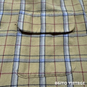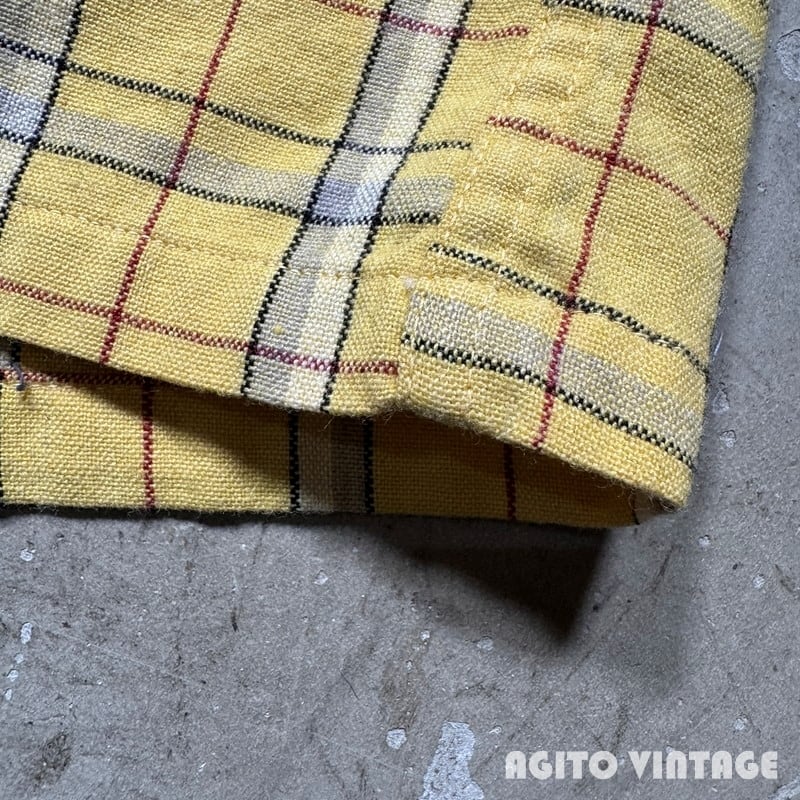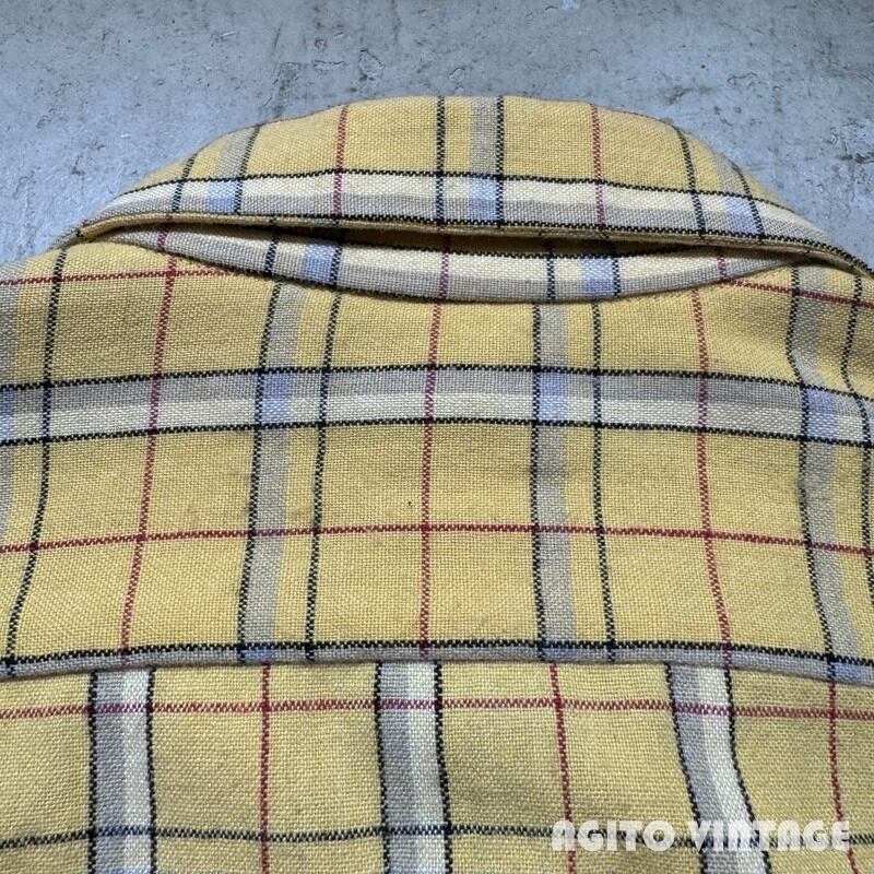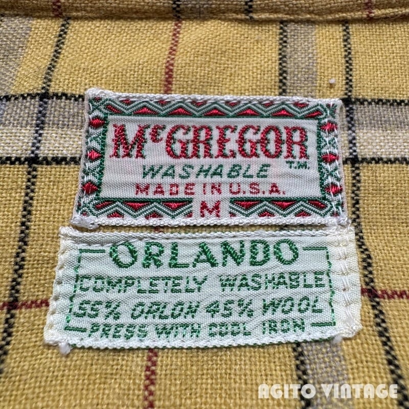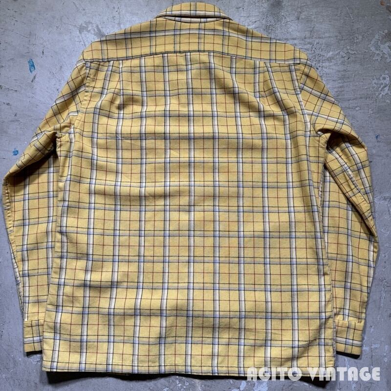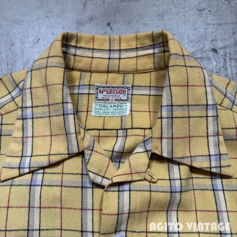 50年代頃のMcGREGOR ウール混紡チェックオープンカラーシャツです。McGREGORは1921年に創業した、100年を越える老舗アメリカンカジュアルブランドです。ご紹介するこちらは、ORLONと呼ばれるアクリル繊維とウールの混紡でシワになりにくく軽量で保温性にも優れているようです。イエローベースにブラック、グレー、ホワイト、レッドの4色で構成されたチェック柄です。ボタンの欠損は無く全てオリジナルだと思われます。左の胸ポケット横に小さなダメージがございますがその他は僅かな使用感のみで汚れ等無く、コンディションは良好かと思われます。Mサイズ表記ですがややゆとりのあるサイズ感です。派手過ぎない色味ですので冬の差し色に是非。