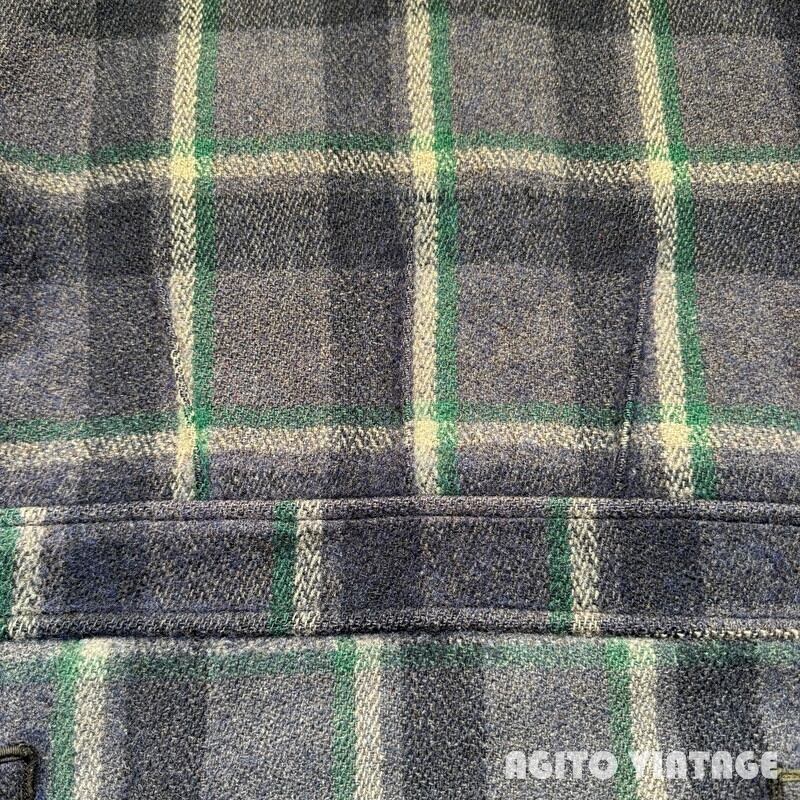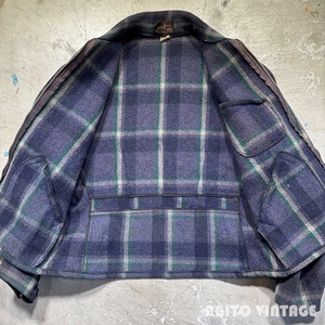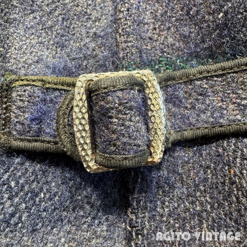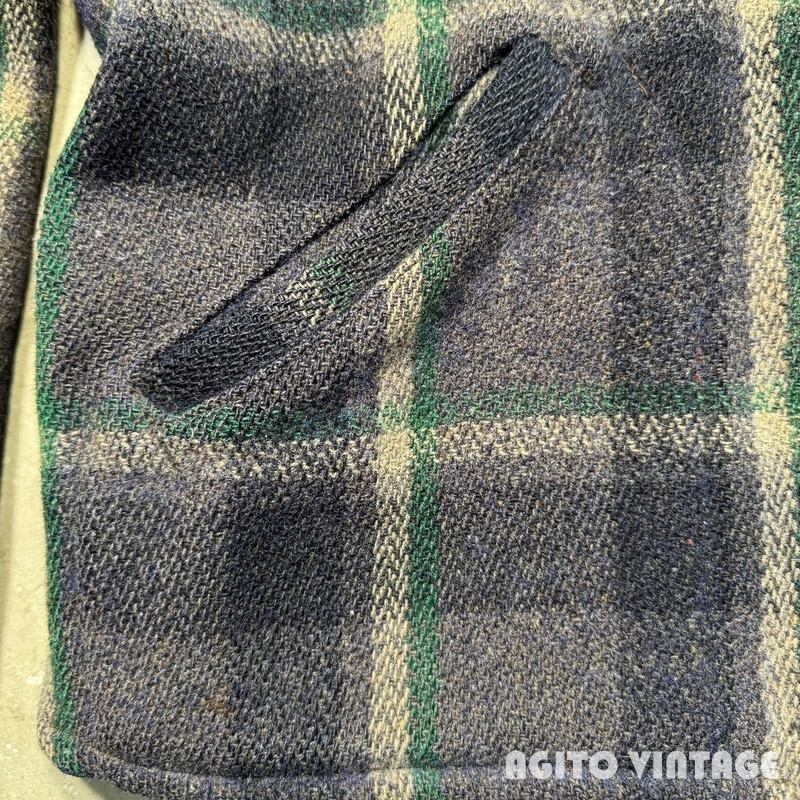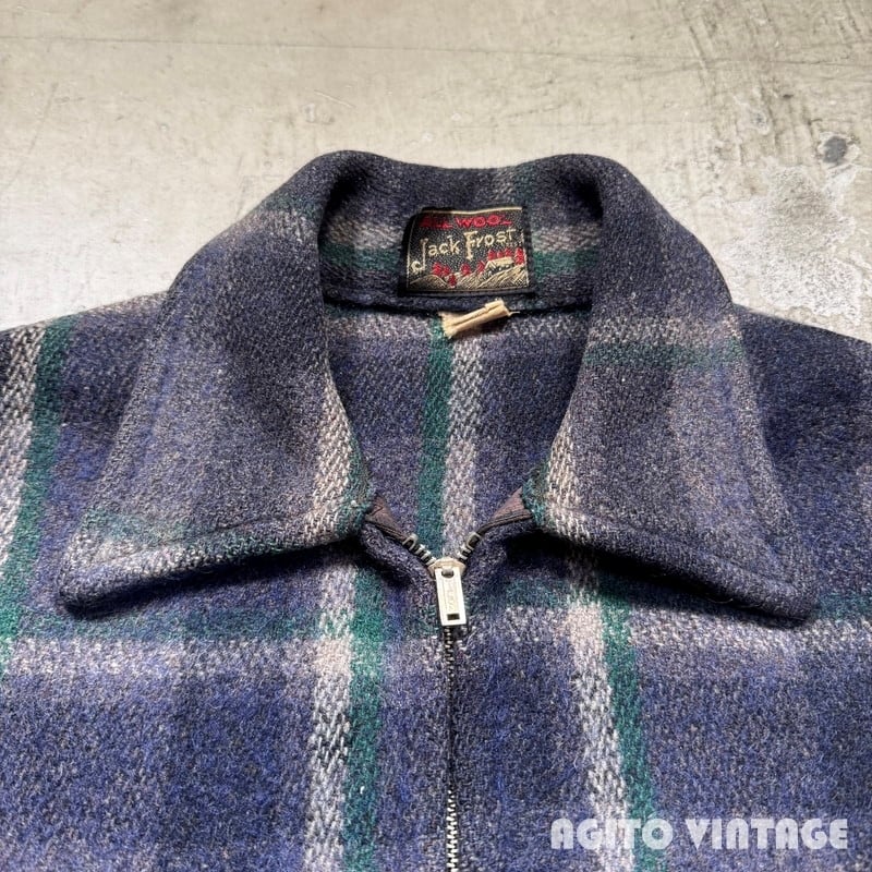 30年代から40年代初頭頃のJack Frost ウールスポーツジャケットです。Jack Frostは1905年に設立されたUtah Woolen Millsという会社でも同名のブランドを展開していたようですが、タグに記載が無い為関係性の有無は不明です。ご紹介するこちらは、ブルーとグリーン、ホワイトのチェック柄で、くすみのある渋いカラーリングで構成されています。フロントはコの字留めのデコTALON、胸ポケットにはボールチェーンのTALONジッパーが使用されています。ジッパーエンドにはD9の刻印が入りますので、恐らく1939年頃に製造されたジッパーだと思われます。タグは襟にに縫い付けられていますが、左側と上部のステッチが解れてめくれています。ウエストサイドには柄の入るアジャスターが付きます。一部薄汚れがあり、フロントジッパー付近に小さな虫食いがございます。袖先内側の当て布には左右どちらにも若干ダメージがございます。その他使用感はございますが年代を考慮すればかなり良いかと思います。サイズ表記は38で、細身から標準体型の方にお勧めです。胸元のボールチェーンが付くだけでぐっと古さを感じれますのでお好きな方も多いのではないでしょうか。サイズが合う方は是非この機会をお見逃しなく。