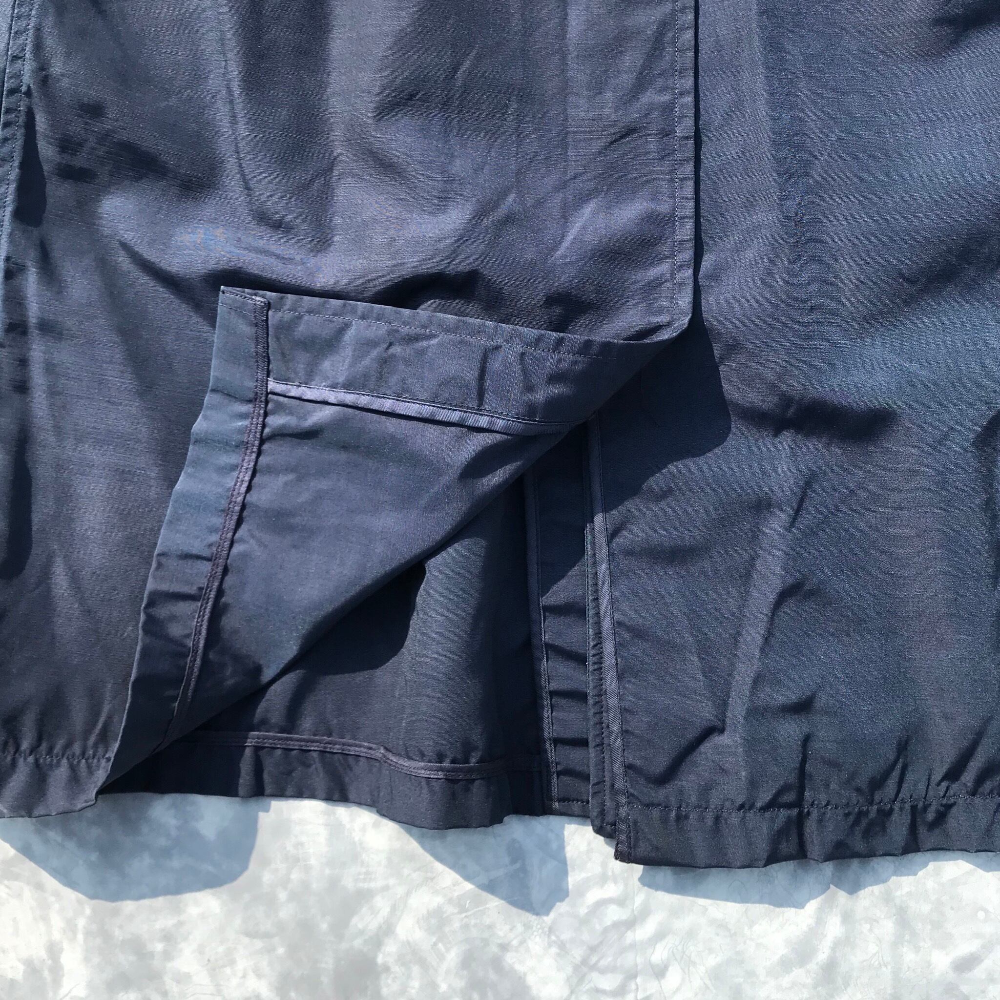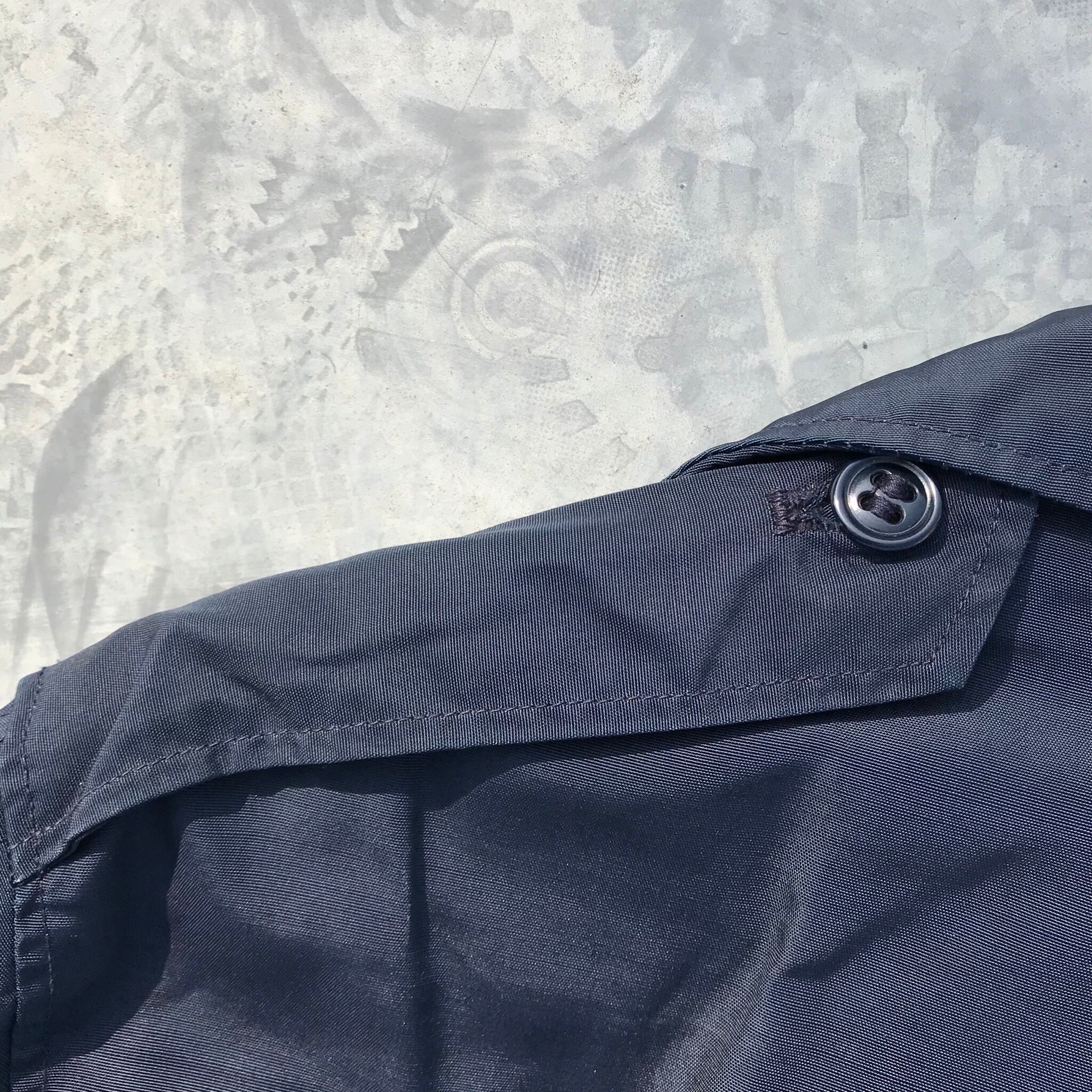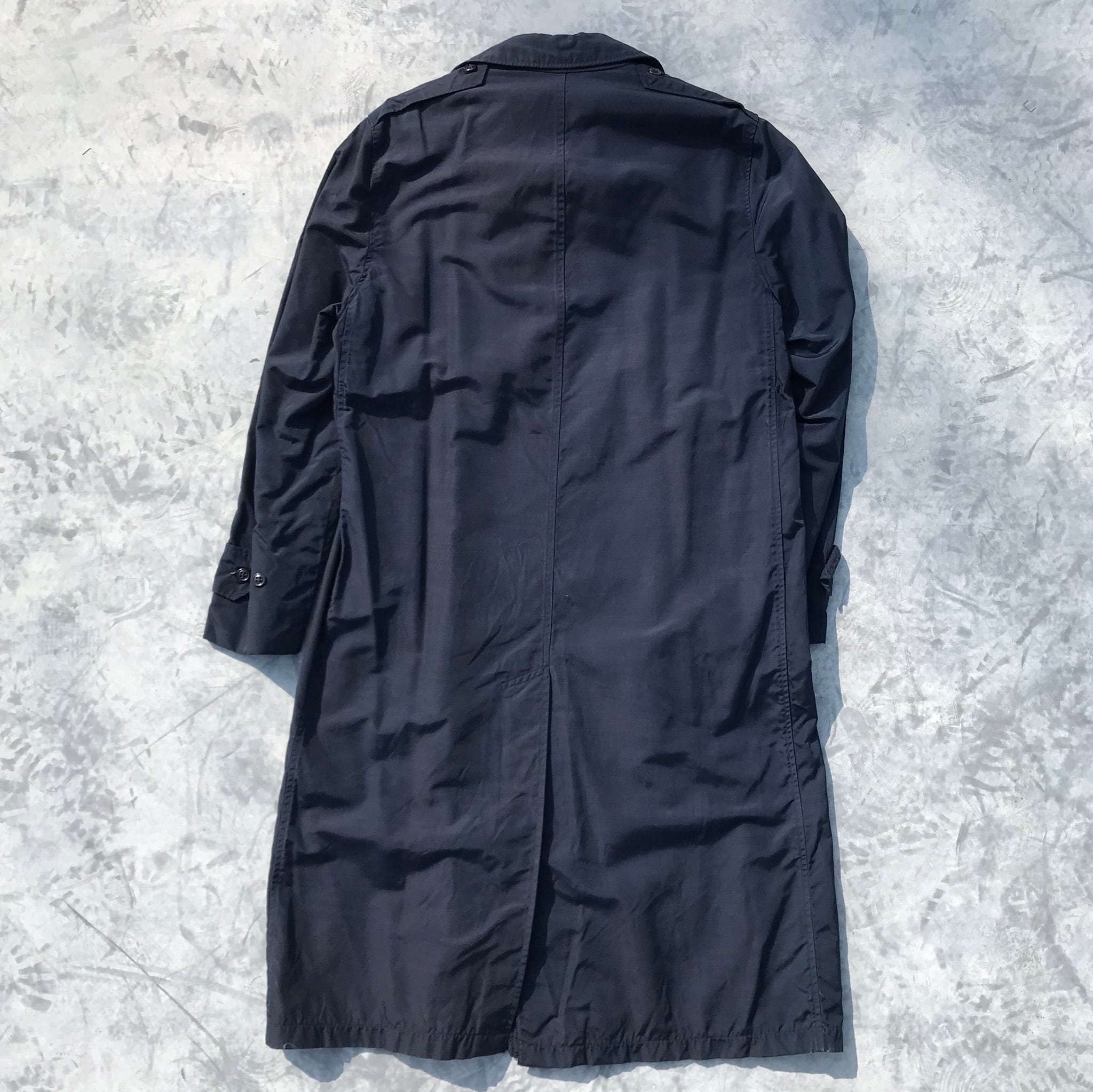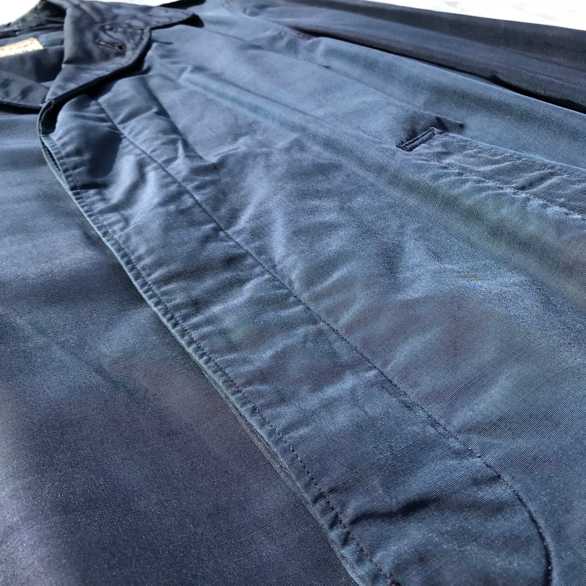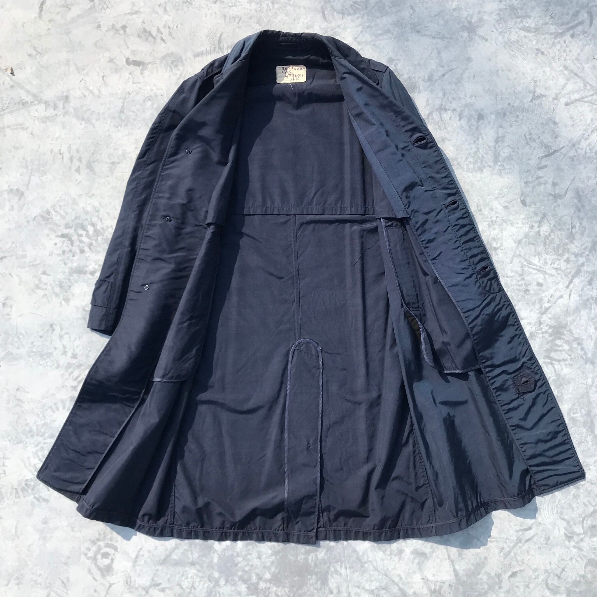 60'sのUSAFレインコートです。SPEC,MIL-R-3368R(USAF)。CENTRE MFG.CO.INK.社製。米国空軍で採用されていたエアフォースブルーと呼ばれるネイビーのようなカラーがスタイリッシュです。光沢があり、見る角度で生地の色合いが変わります。肩から背中にかけて生地が2重になっていますので、雨の侵入を防ぐ実用性がございます。使用感はございますが、ボタンの欠損も無く状態は比較的綺麗です。春先にも使いやすいシンプルなデザインですので、おススメです。