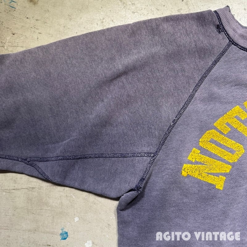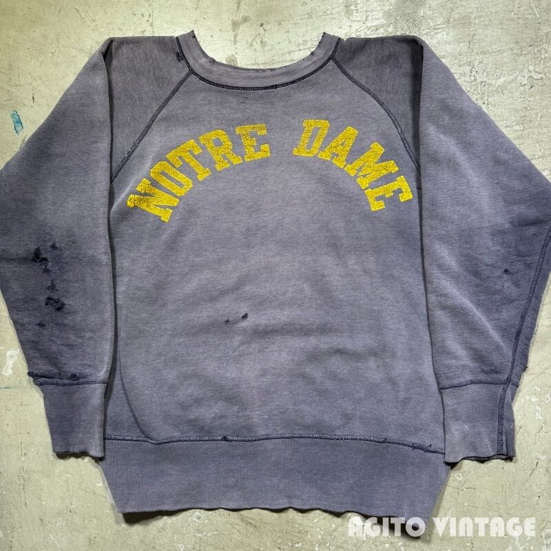 50's 60's Unknown ラグランカレッジスウェット NOTRE DAME サンフェード ネイビー ダメージ L相当 希少 ヴィンテージ BA-2672 RM3093H